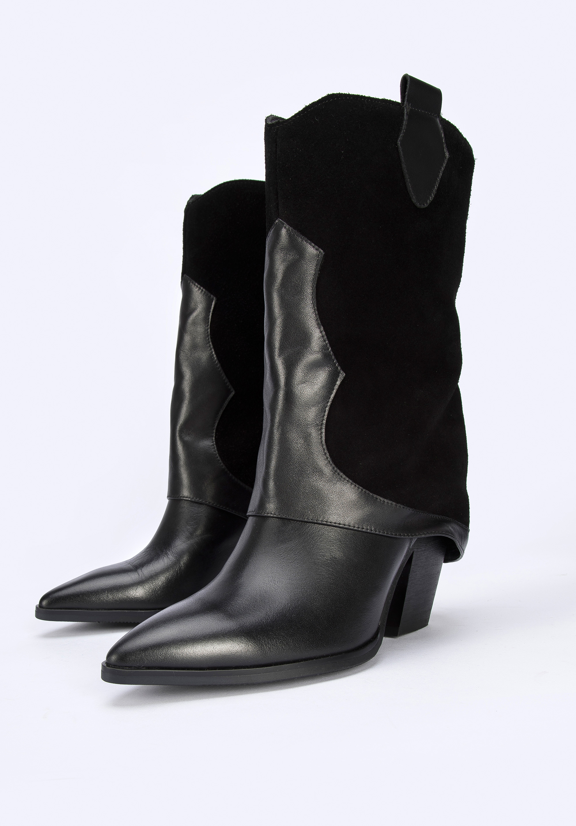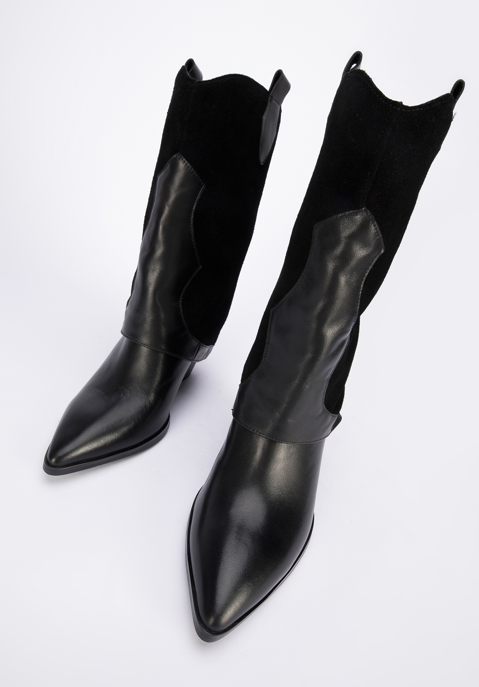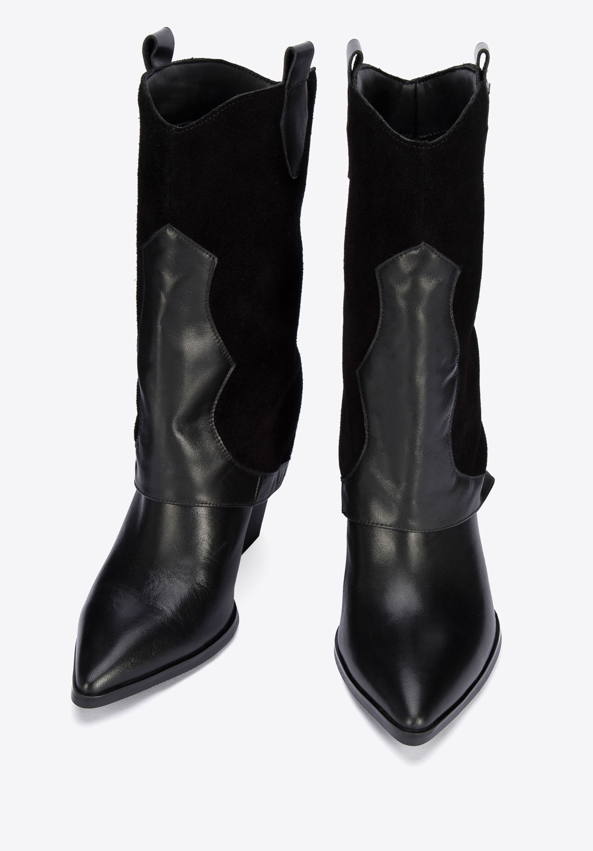 Damskie kowbojki z dwóch rodzajów skór z nakładką to modny dodatek, w którym nie przejdziesz niezauważona.