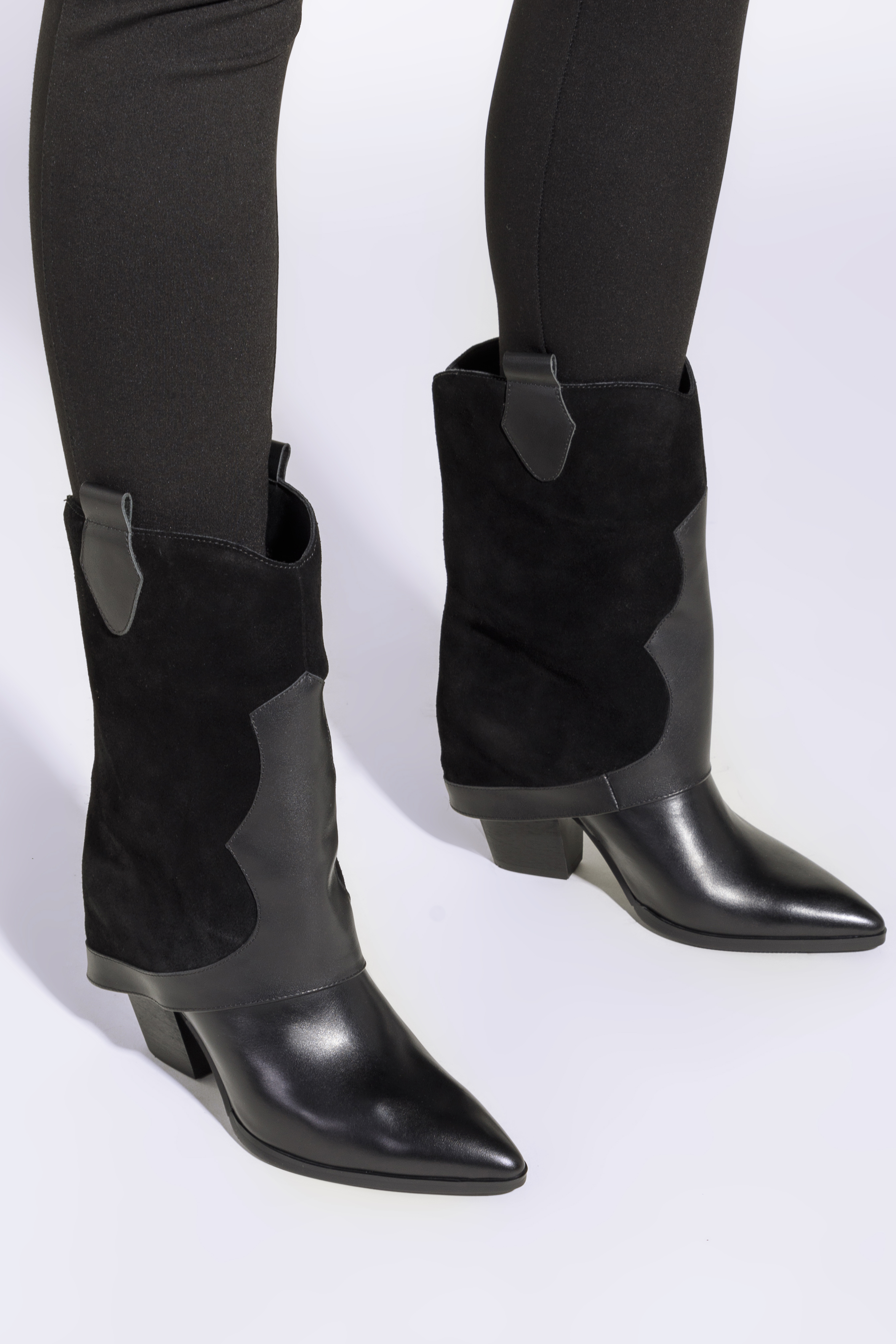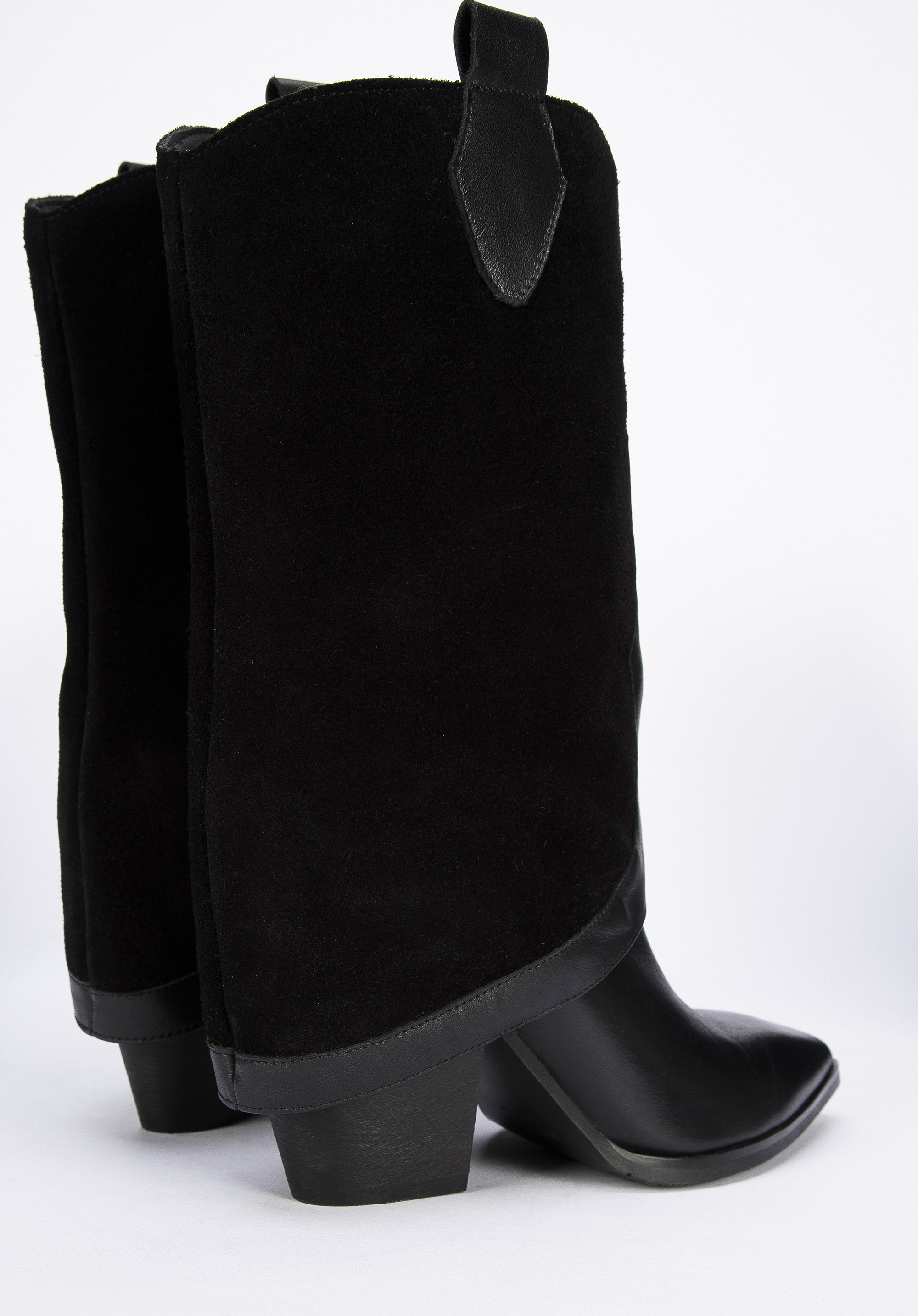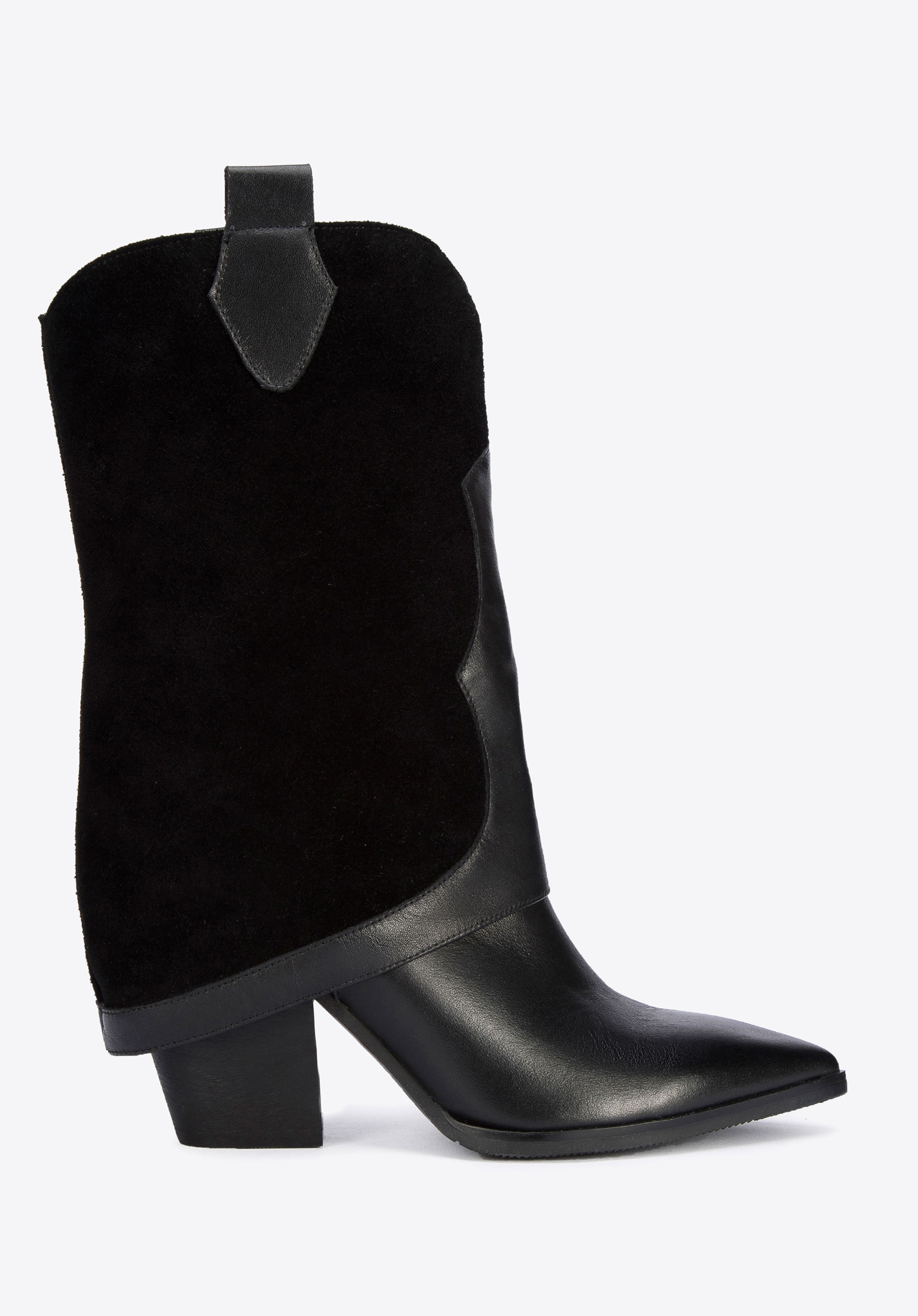 Damskie kowbojki z dwóch rodzajów skór z nakładką to modny dodatek, w którym nie przejdziesz niezauważona.