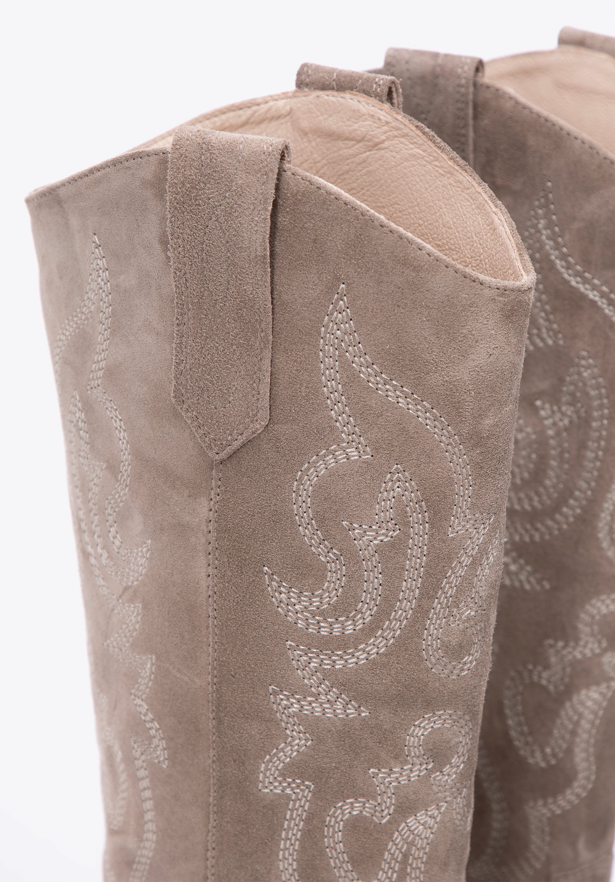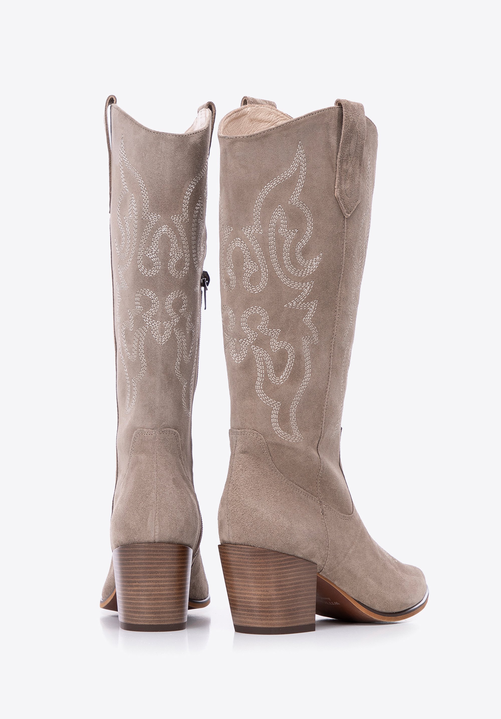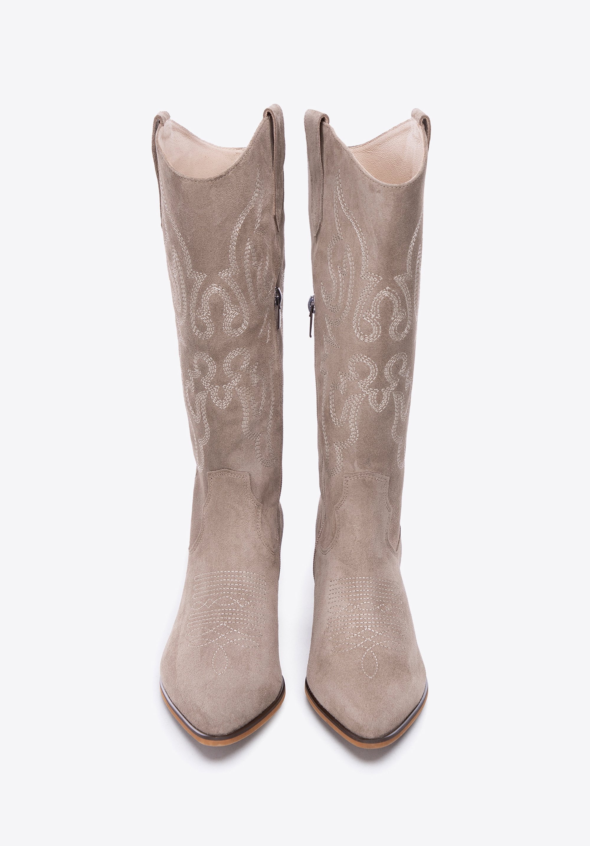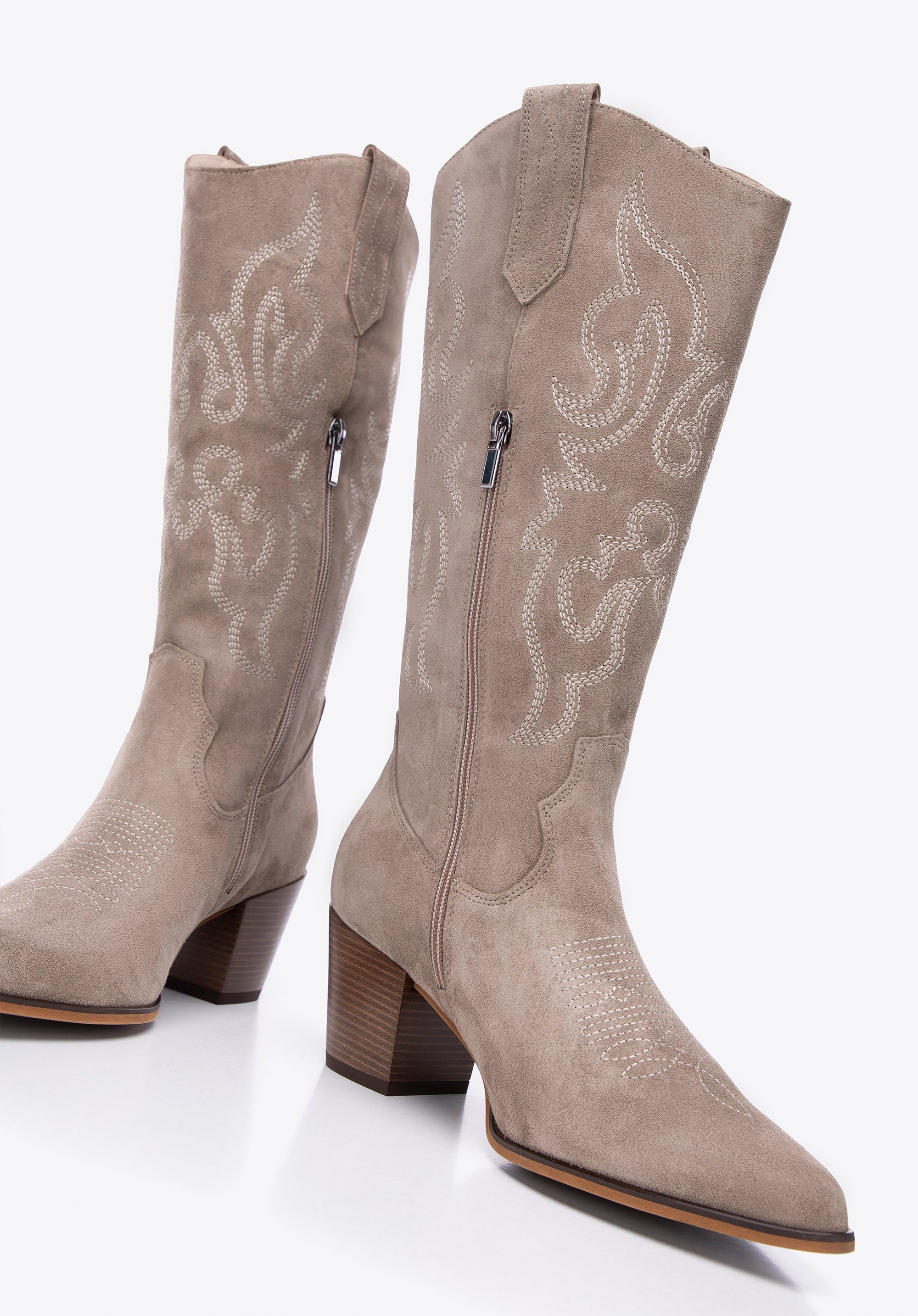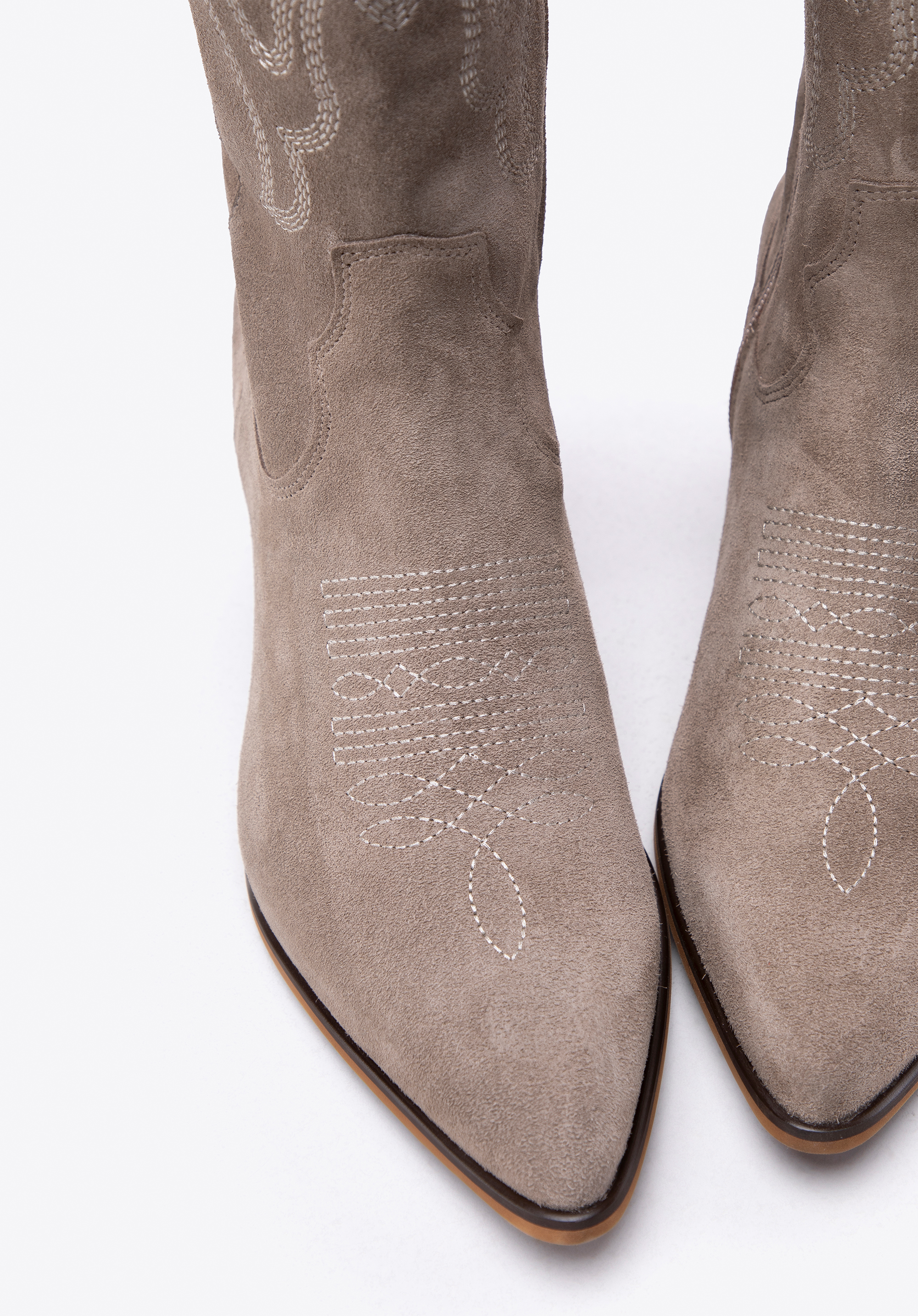 - Estetyczne akcenty: Zamszowe kowbojki ozdobione są subtelnymi haftami i przeszyciami, które nadają im niepowtarzalnego charakteru.