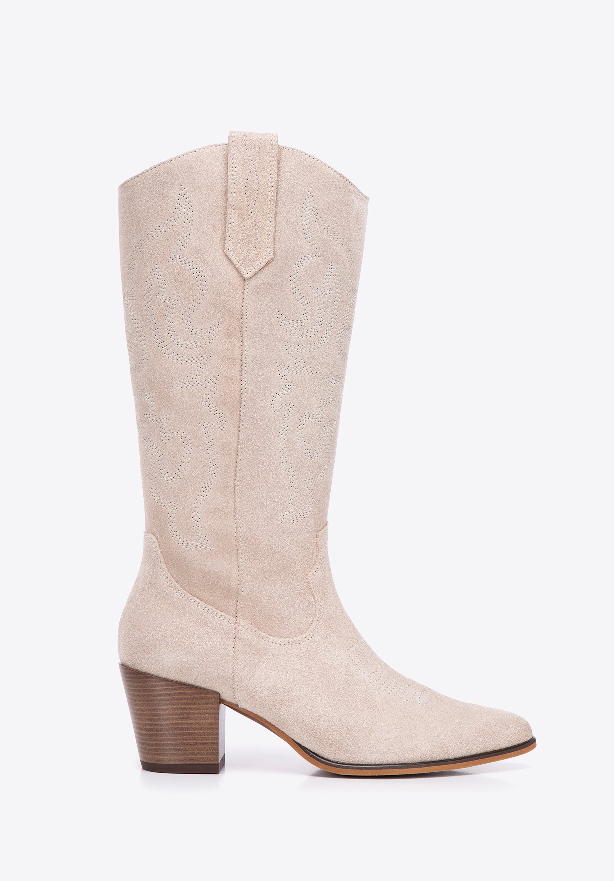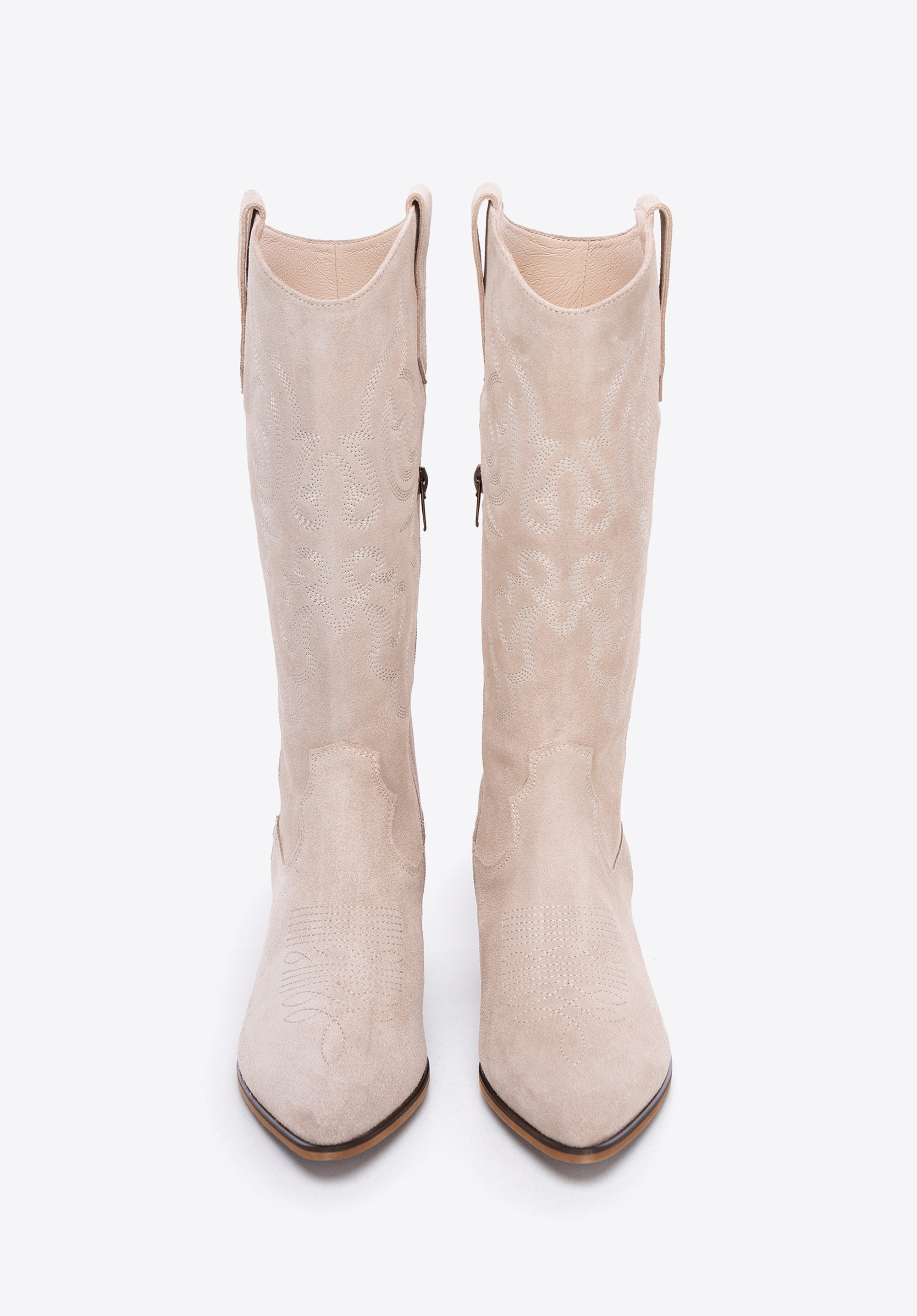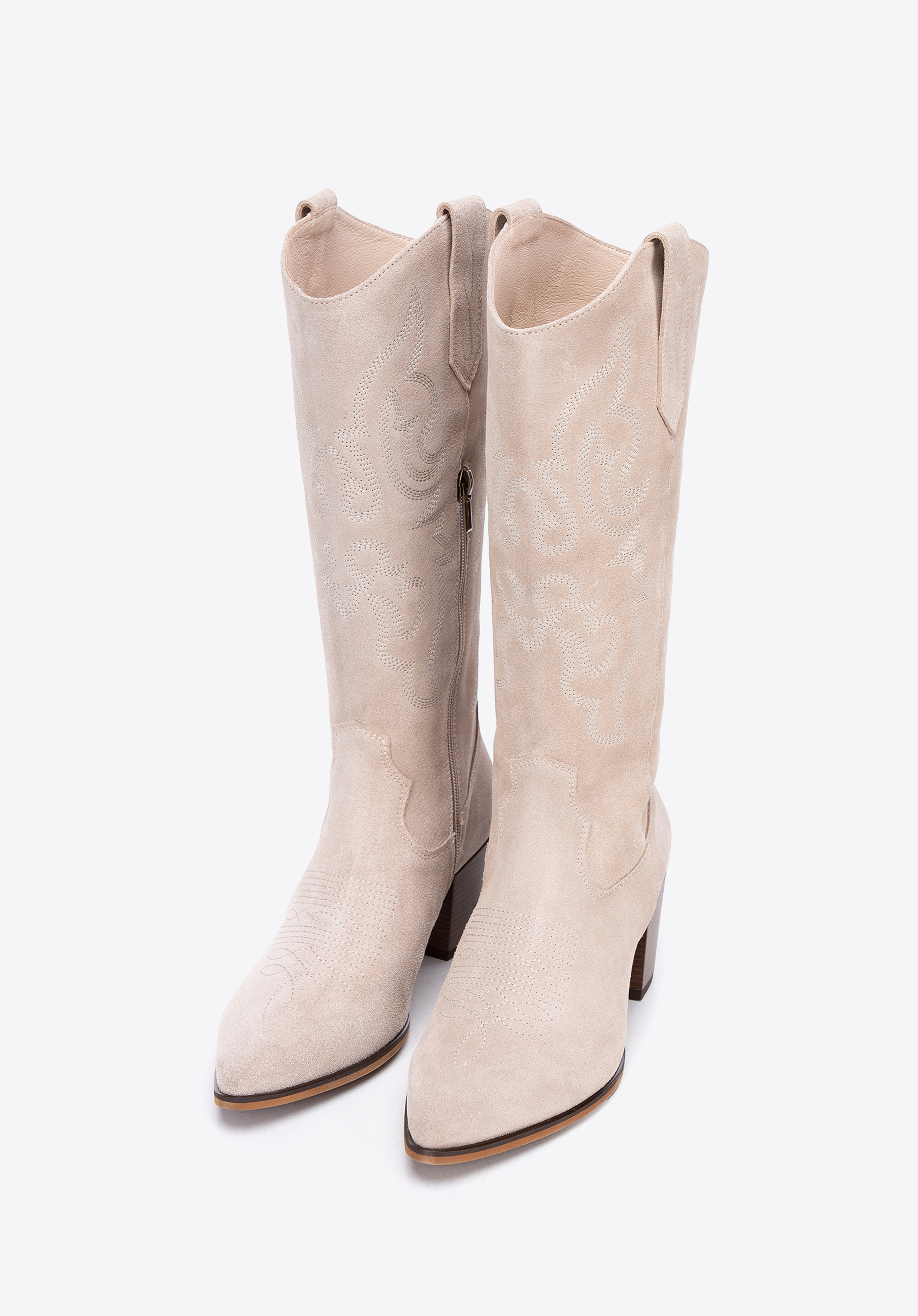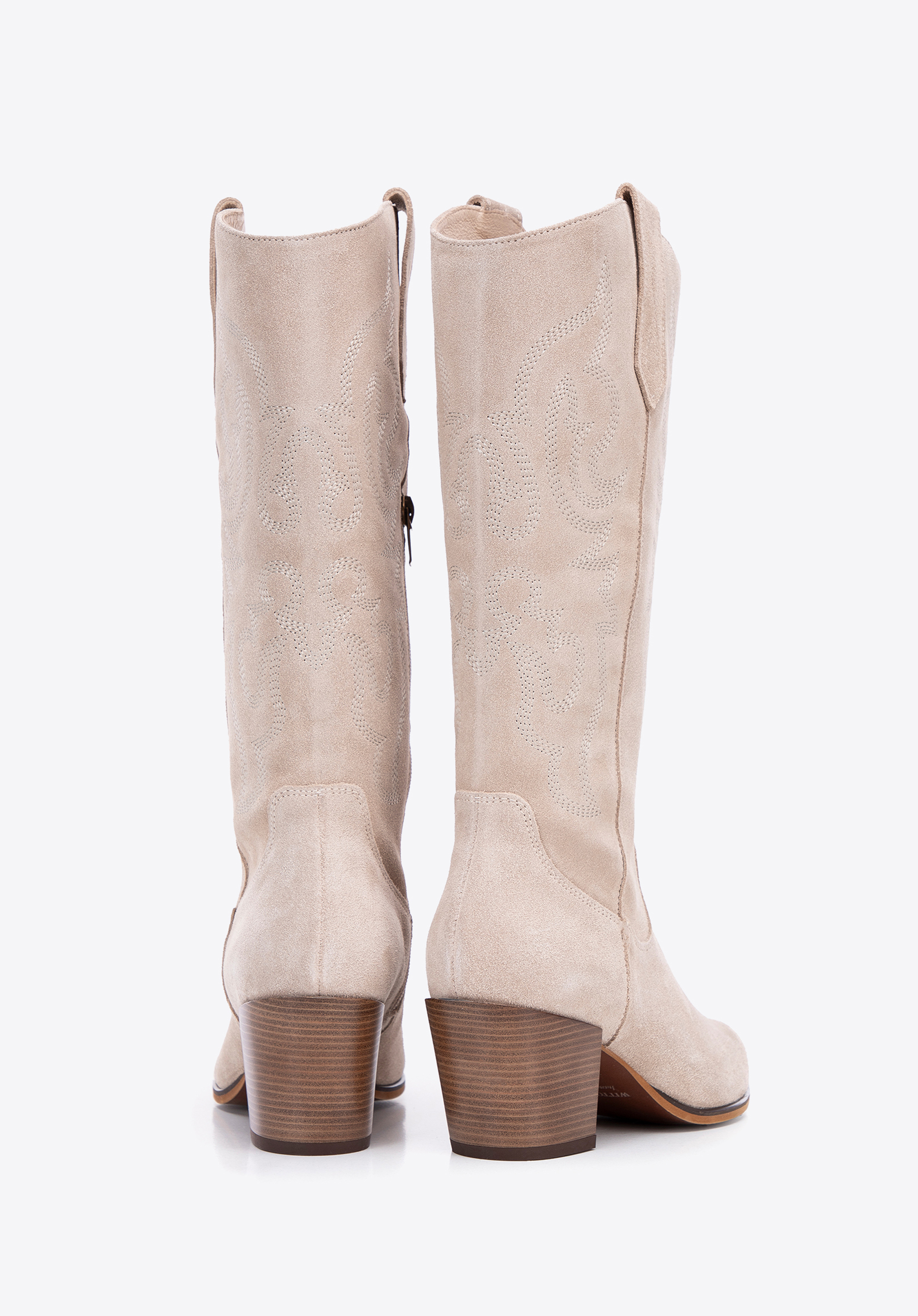 - Estetyczne akcenty: Zamszowe kowbojki ozdobione są subtelnymi haftami i przeszyciami, które nadają im niepowtarzalnego charakteru.