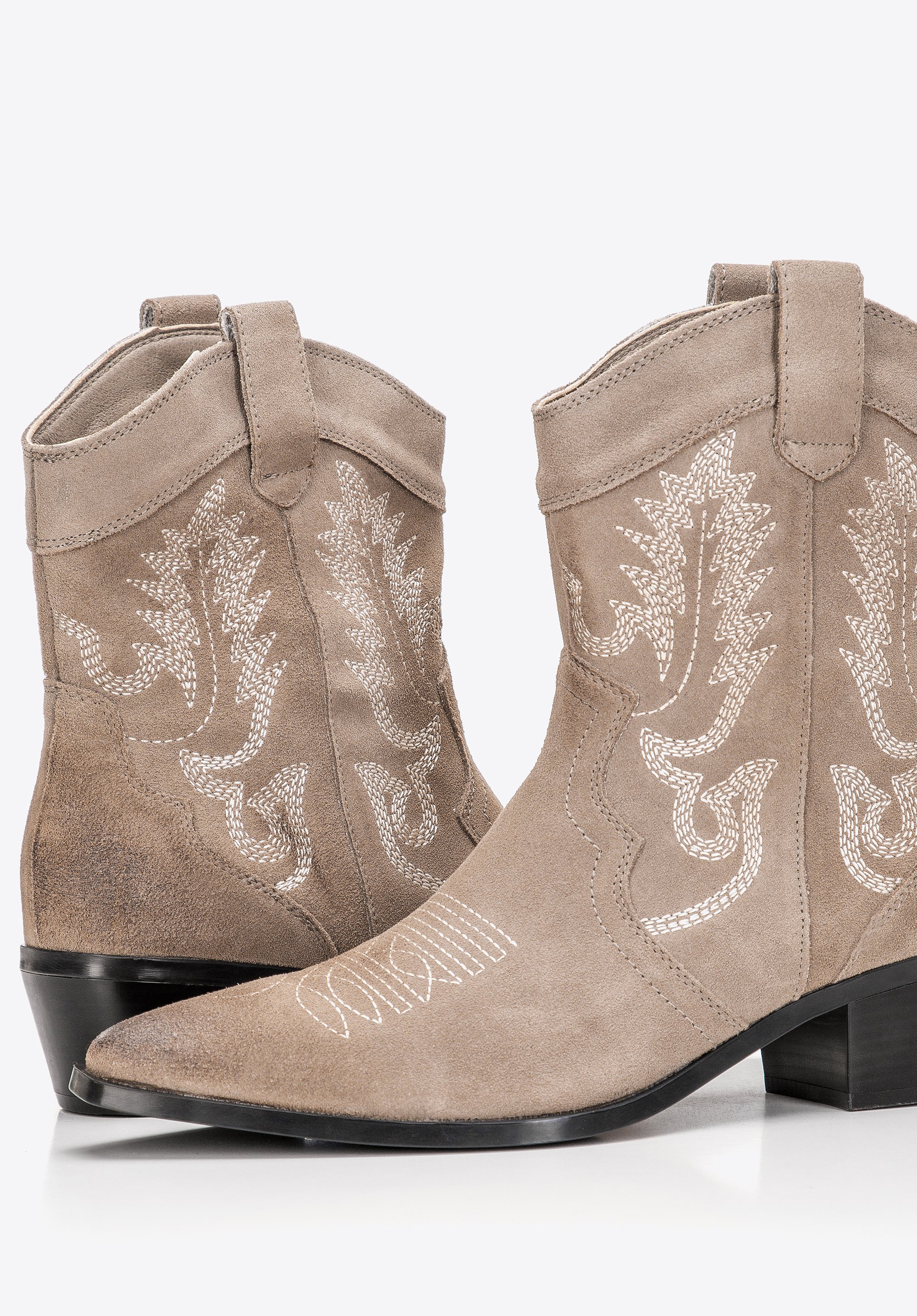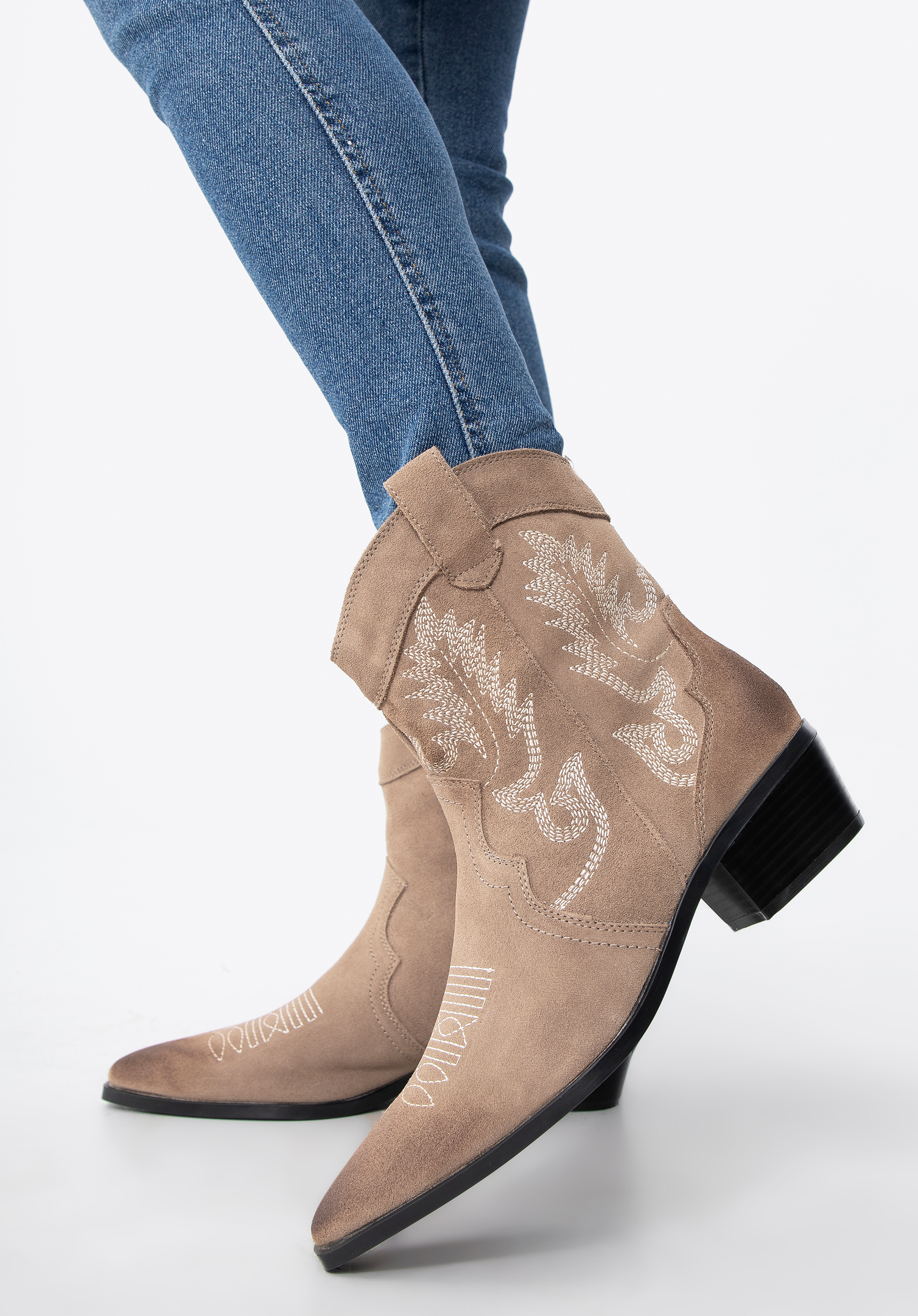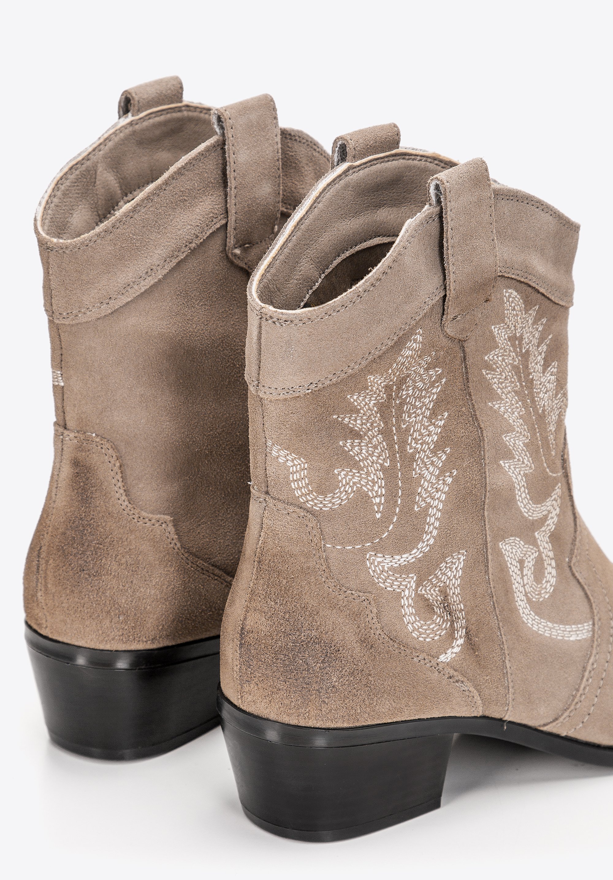 damskie kowbojki zamszowe z haftem możesz nosić zamiennie z ulubionymi botkami, dodadzą charakteru każdej Twojej stylizacji.