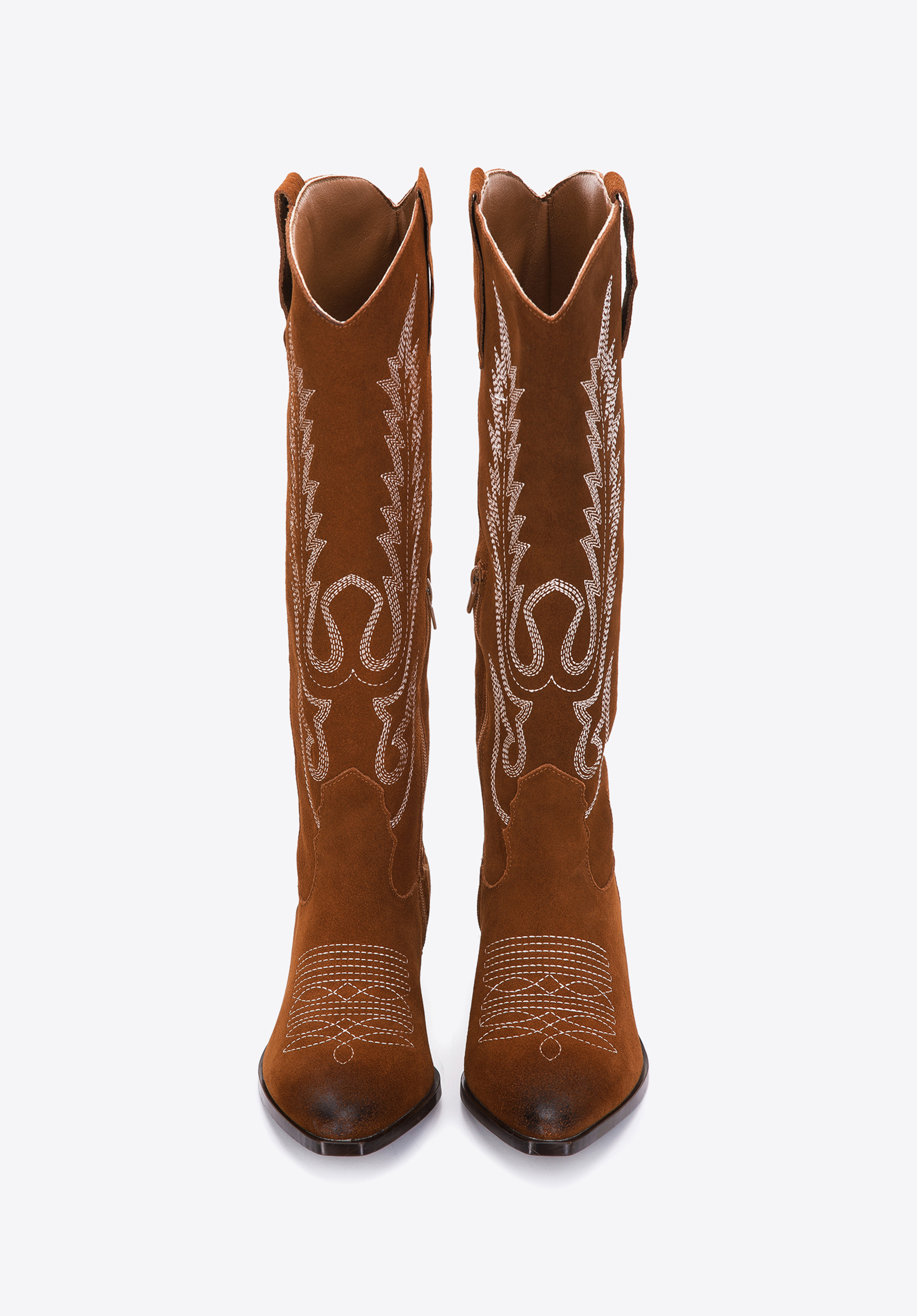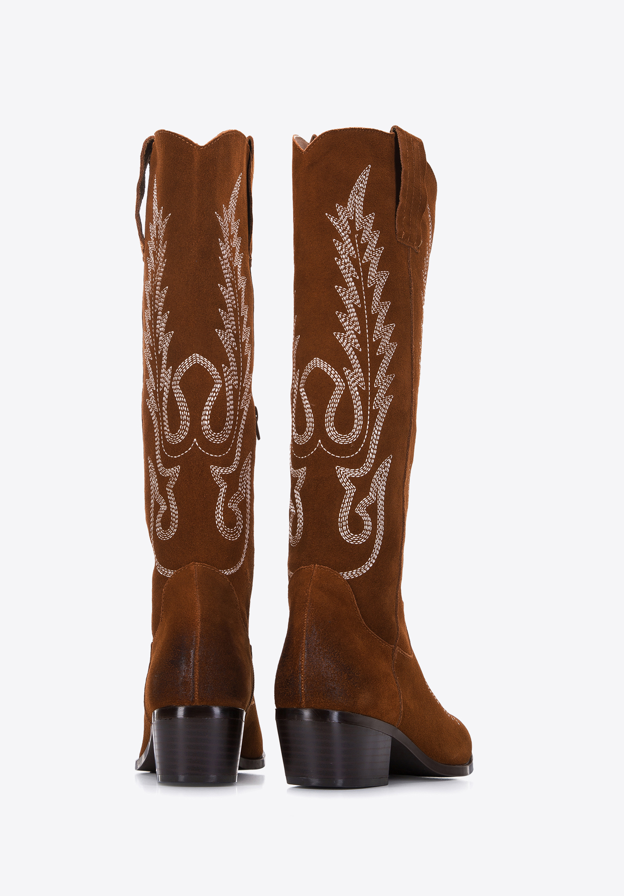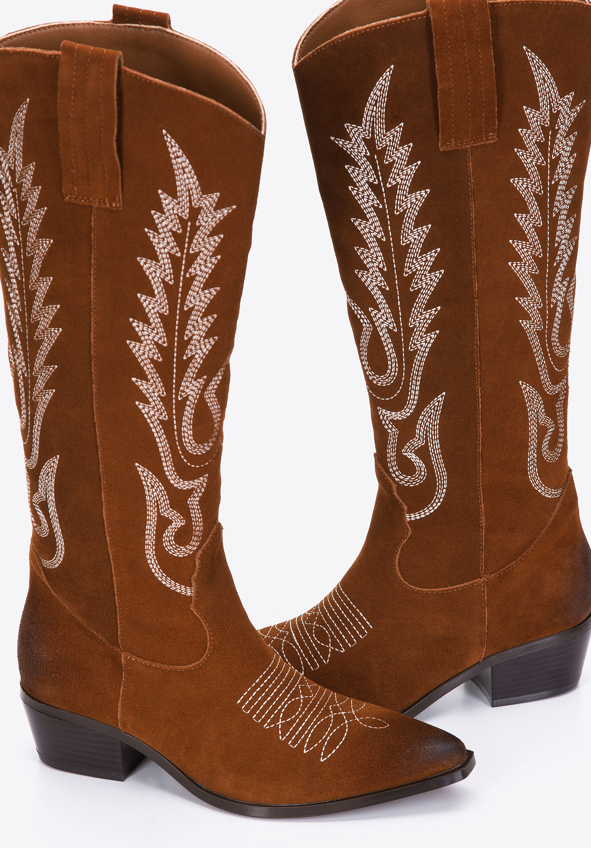 Damskie kowbojki zamszowe z haftem wysokie brązowe