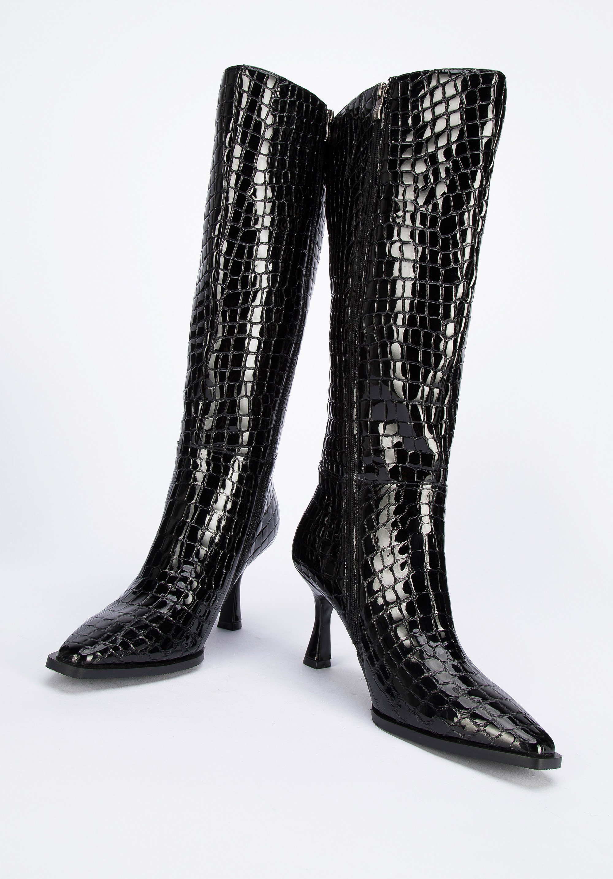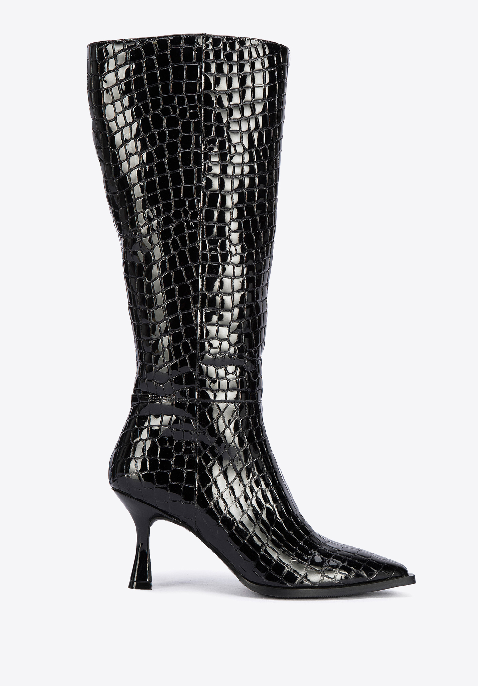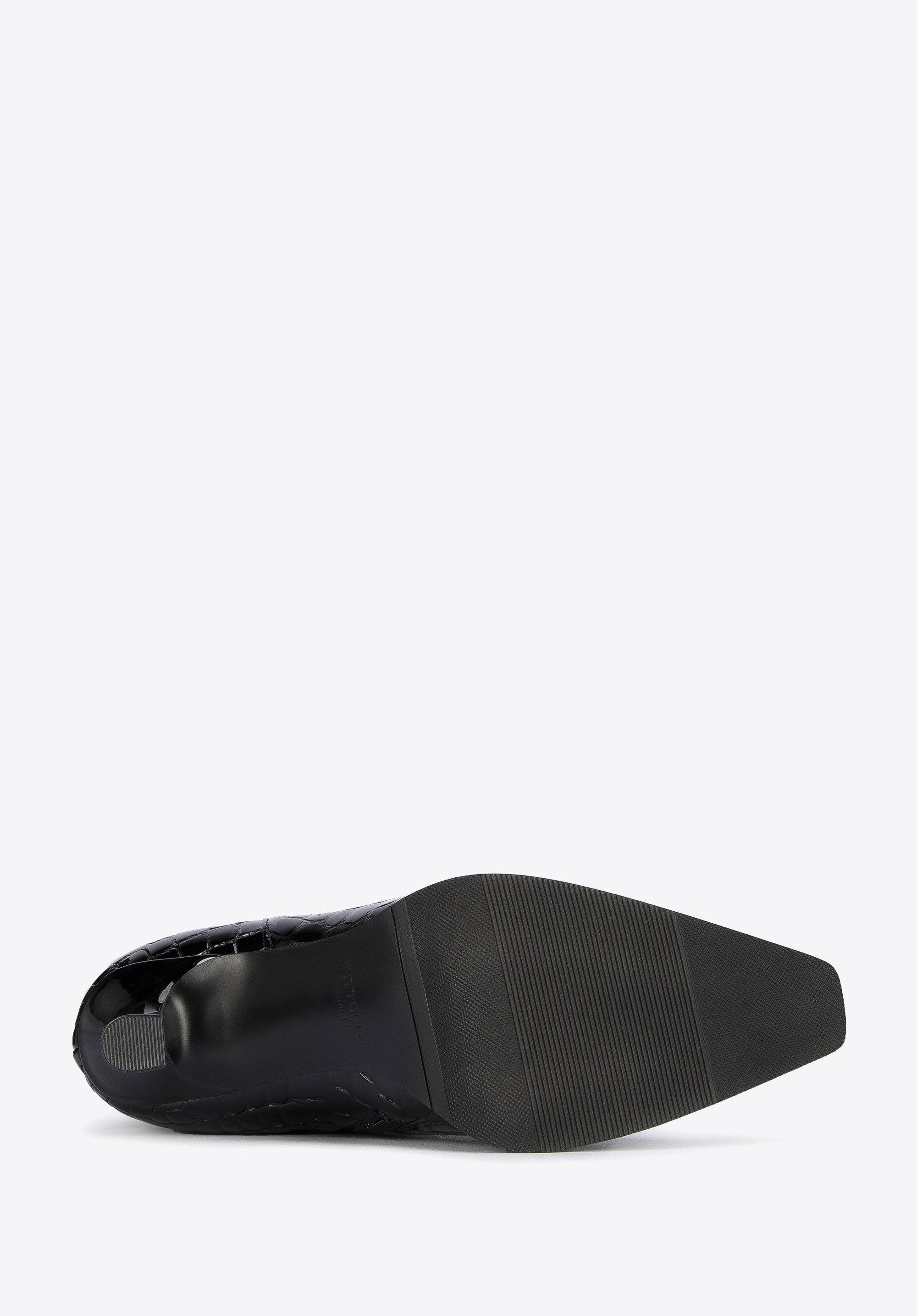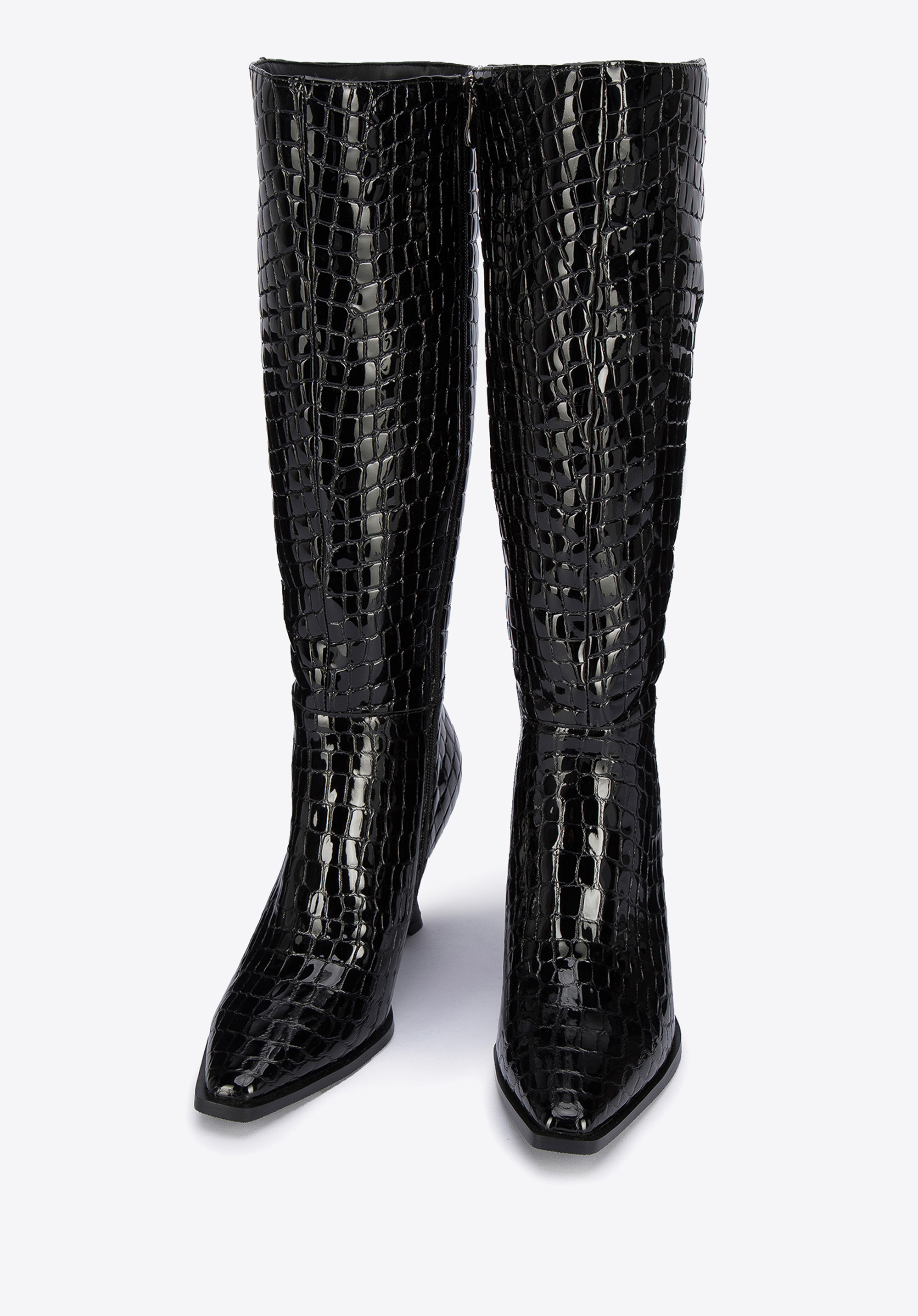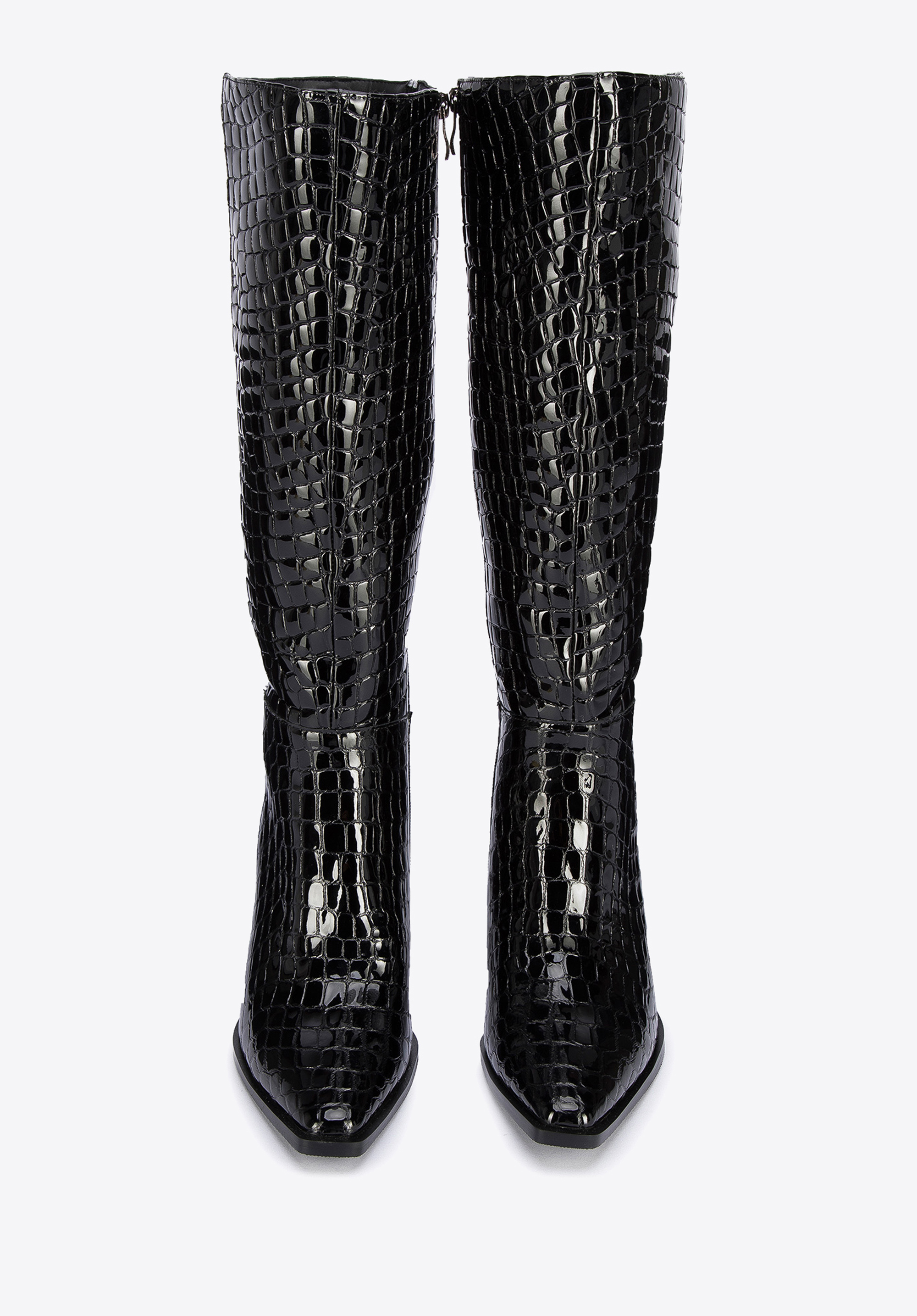Damskie kozaki z lakierowanej skóry croco na szpilce to świetny wybór dla każdej kobiety lubiącej oryginalne dodatki.