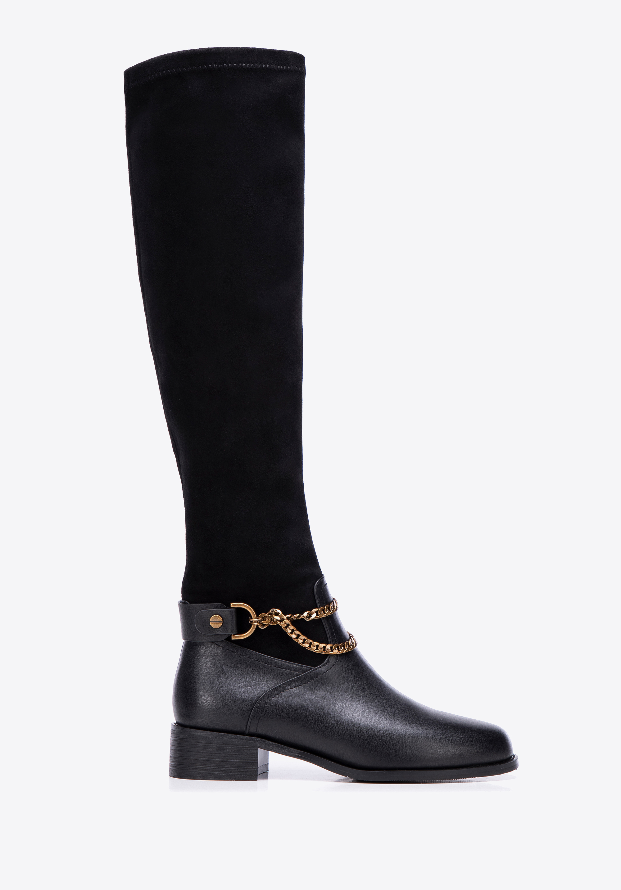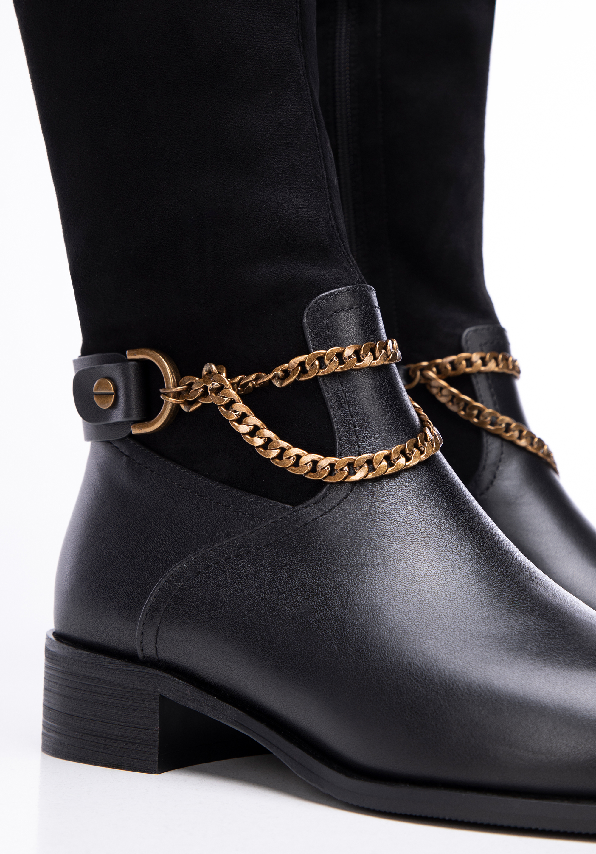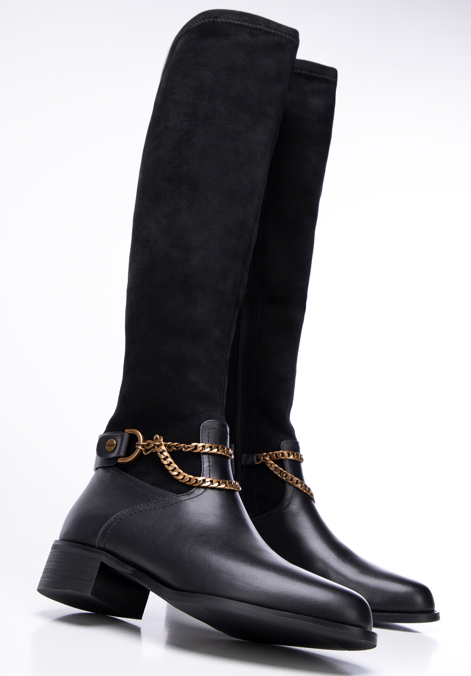 Te eleganckie kozaki wykonane ze skóry lakierowanej i tworzywa sztucznego to must-have w garderobie każdej kobiety, która ceni styl i komfort. Miękka, przyjemna w dotyku wyściółka zapewnia wygodę noszenia przez cały dzień. Wysoka cholewka, ozdobiona podwójnym, biżuteryjnym łańcuszkiem zapinanym dekoracyjnie na boku, dodaje szyku i wyrafinowania każdej stylizacji. Zamek boczny ułatwia zakładanie, a niski obcas czyni je idealnym wyborem na co dzień.