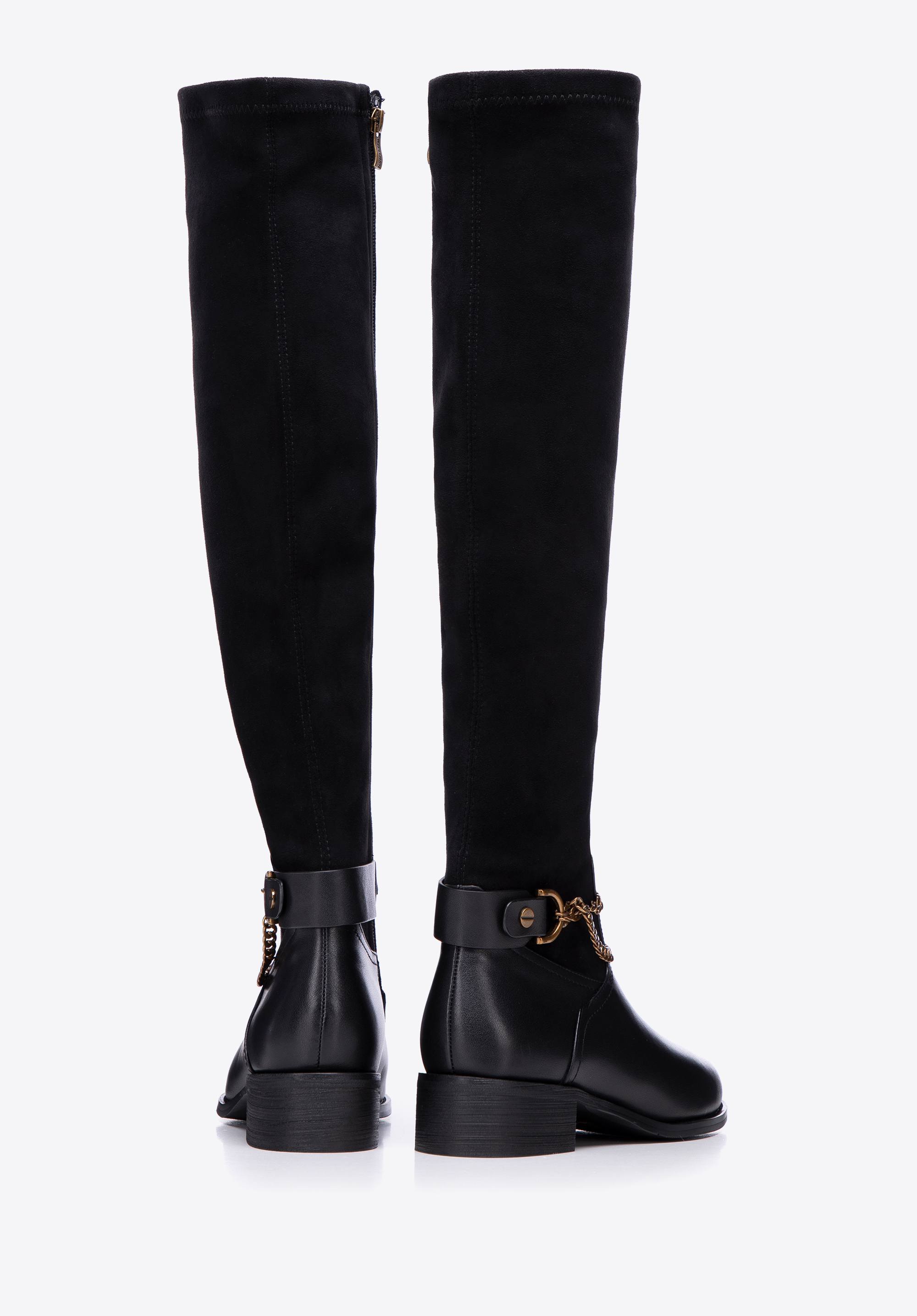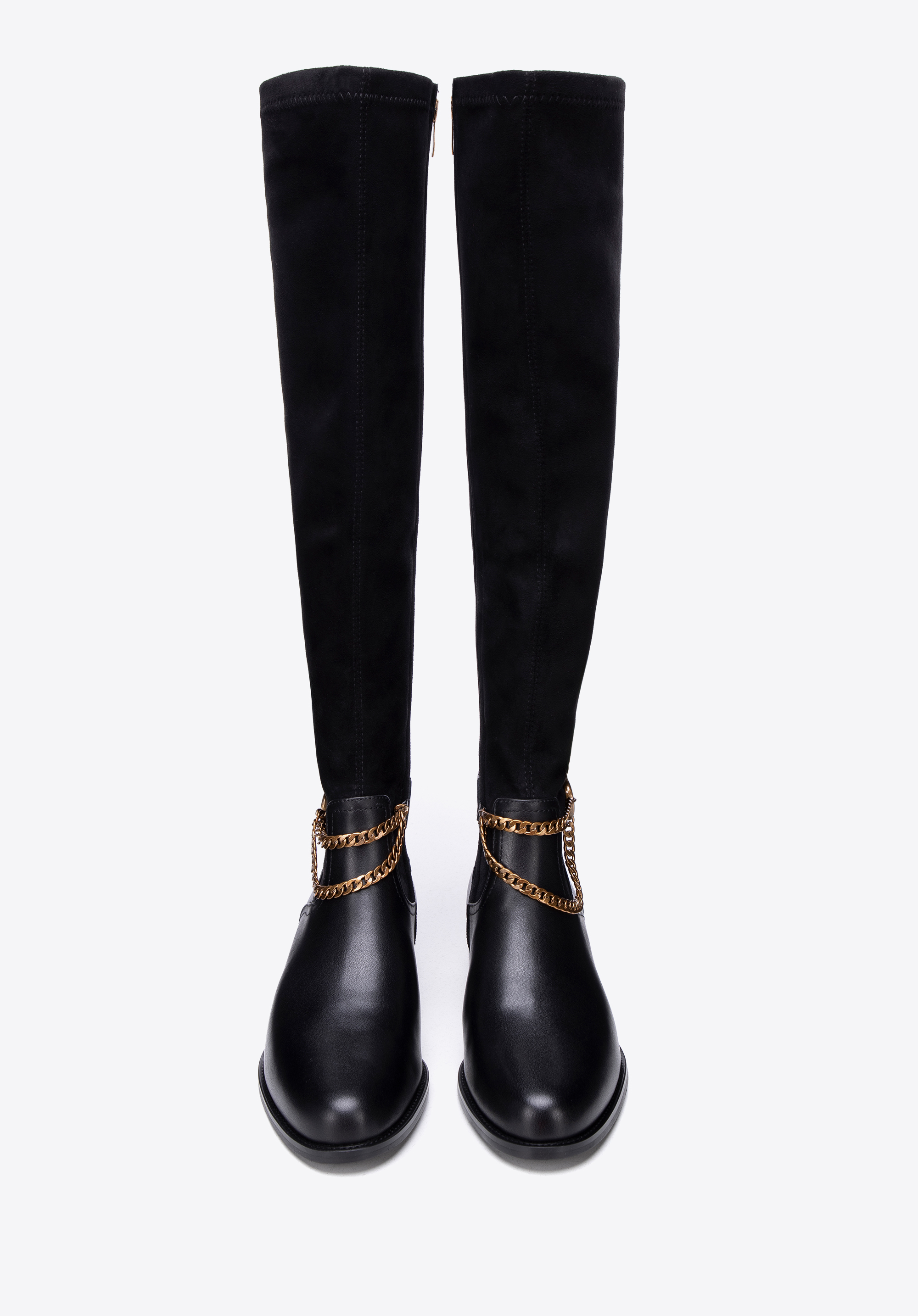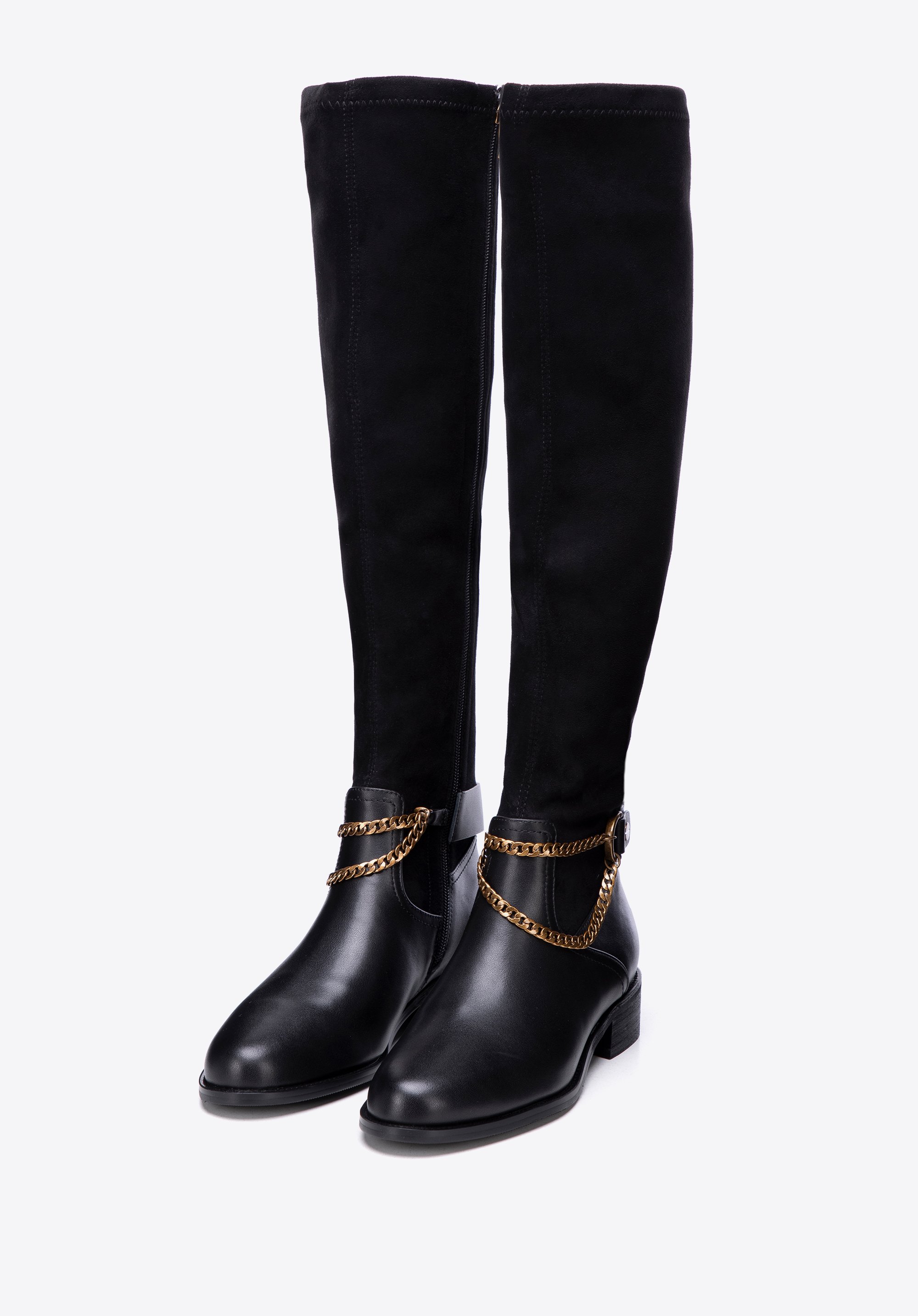 Te eleganckie kozaki wykonane ze skóry lakierowanej i tworzywa sztucznego to must-have w garderobie każdej kobiety, która ceni styl i komfort. Miękka, przyjemna w dotyku wyściółka zapewnia wygodę noszenia przez cały dzień. Wysoka cholewka, ozdobiona podwójnym, biżuteryjnym łańcuszkiem zapinanym dekoracyjnie na boku, dodaje szyku i wyrafinowania każdej stylizacji. Zamek boczny ułatwia zakładanie, a niski obcas czyni je idealnym wyborem na co dzień.