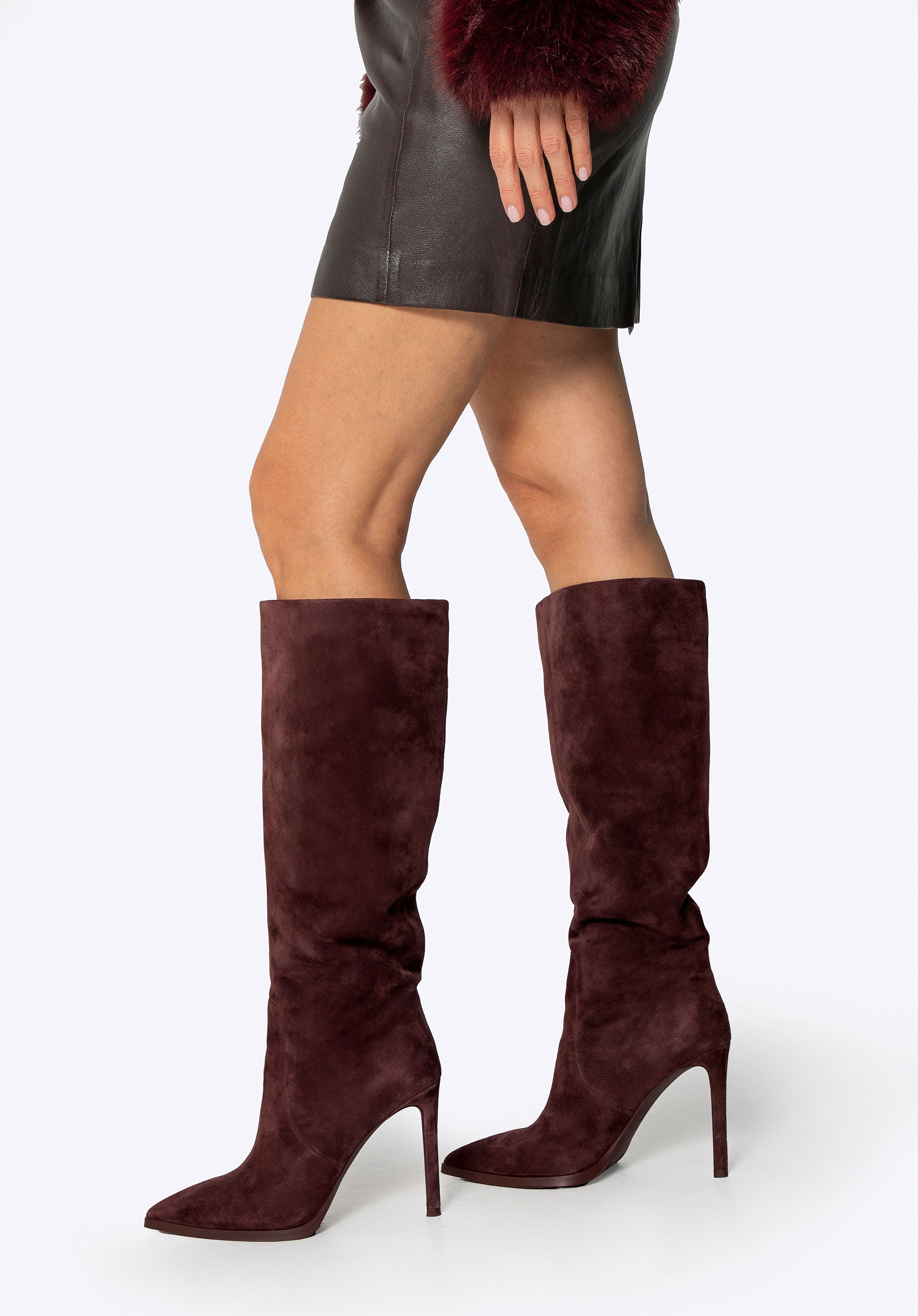 Postaw na ponadczasowy szyk i wyjątkowy komfort z kozakami wykonanymi z naturalnej skóry zamszowej. Ich subtelna faktura i matowe wykończenie podkreślają elegancję, a linia cholewki pięknie modeluje nogę. Szpiczasty nosek i zgrabna szpilka dodają całości kobiecego wdzięku, tworząc klasyczną, harmonijną sylwetkę. Całość utrzymana w jednolitym kolorze – od cholewki po obcas i podeszwę – sprawia, że kozaki prezentują się wyjątkowo stylowo i luksusowo.