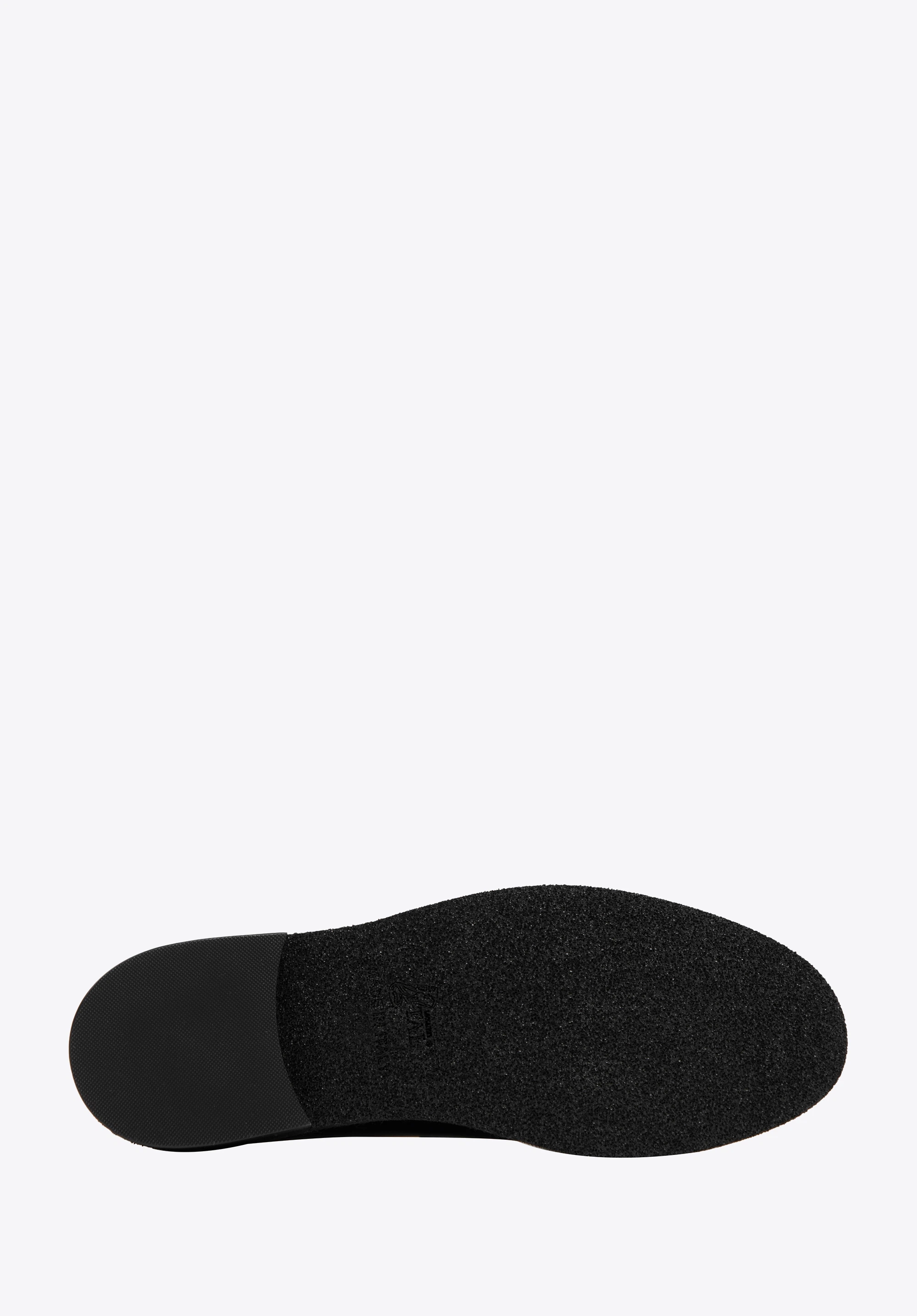 Klasyczny fason z obszytym noskiem zdobią dwa małe chwosty z połyskującymi brzegami oraz ozdobne, kwadratowe obszycia po bokach. Buty zostały