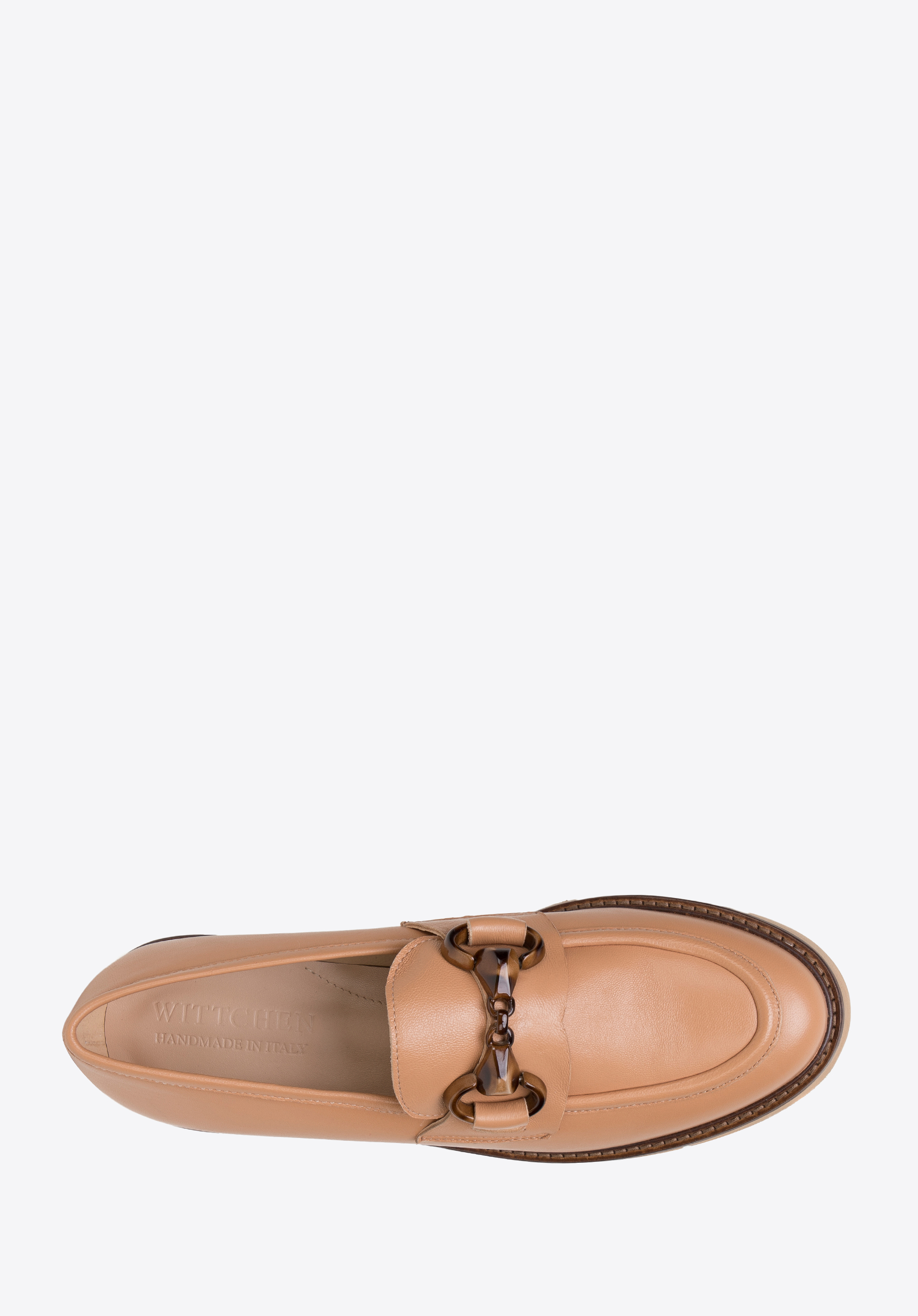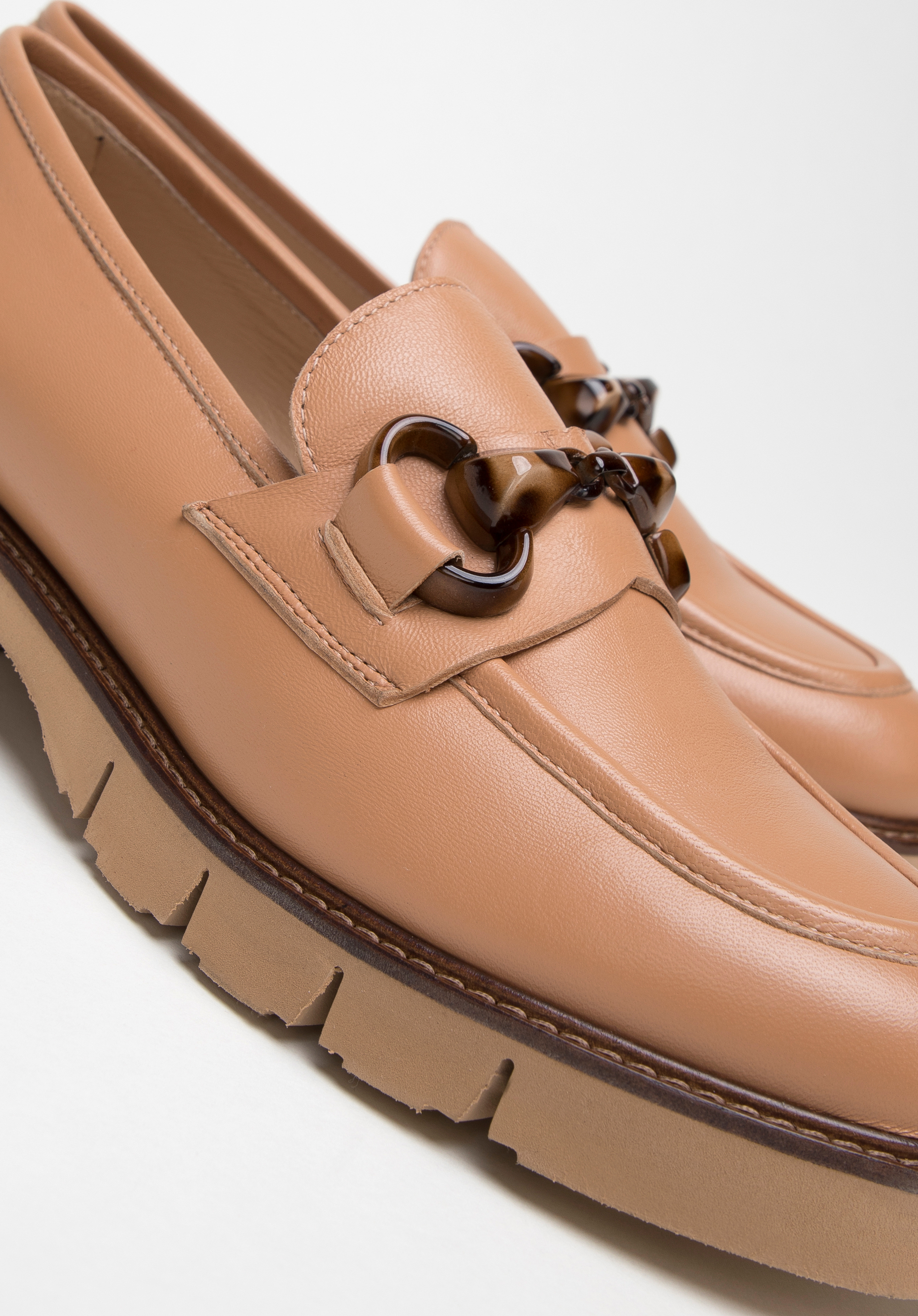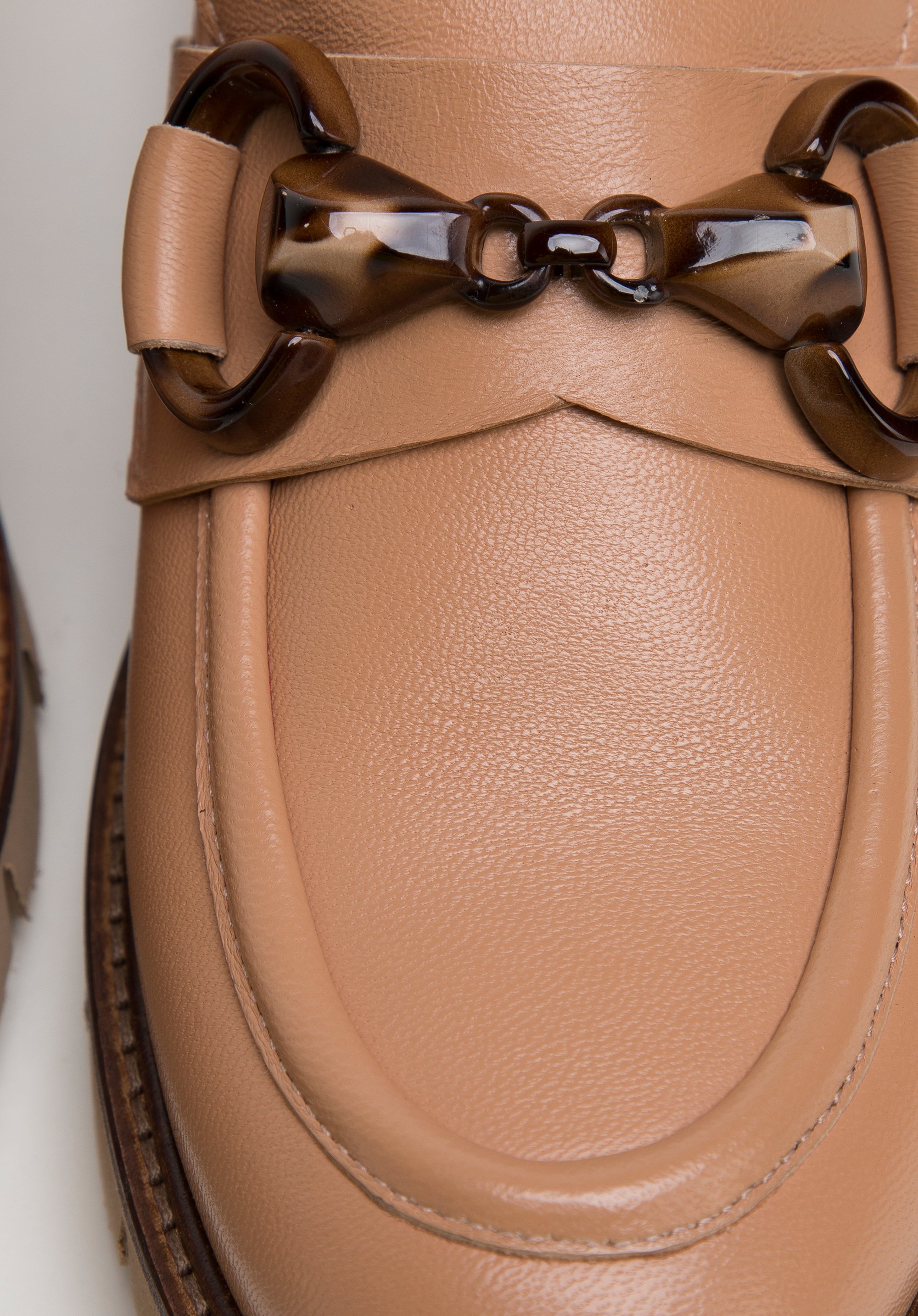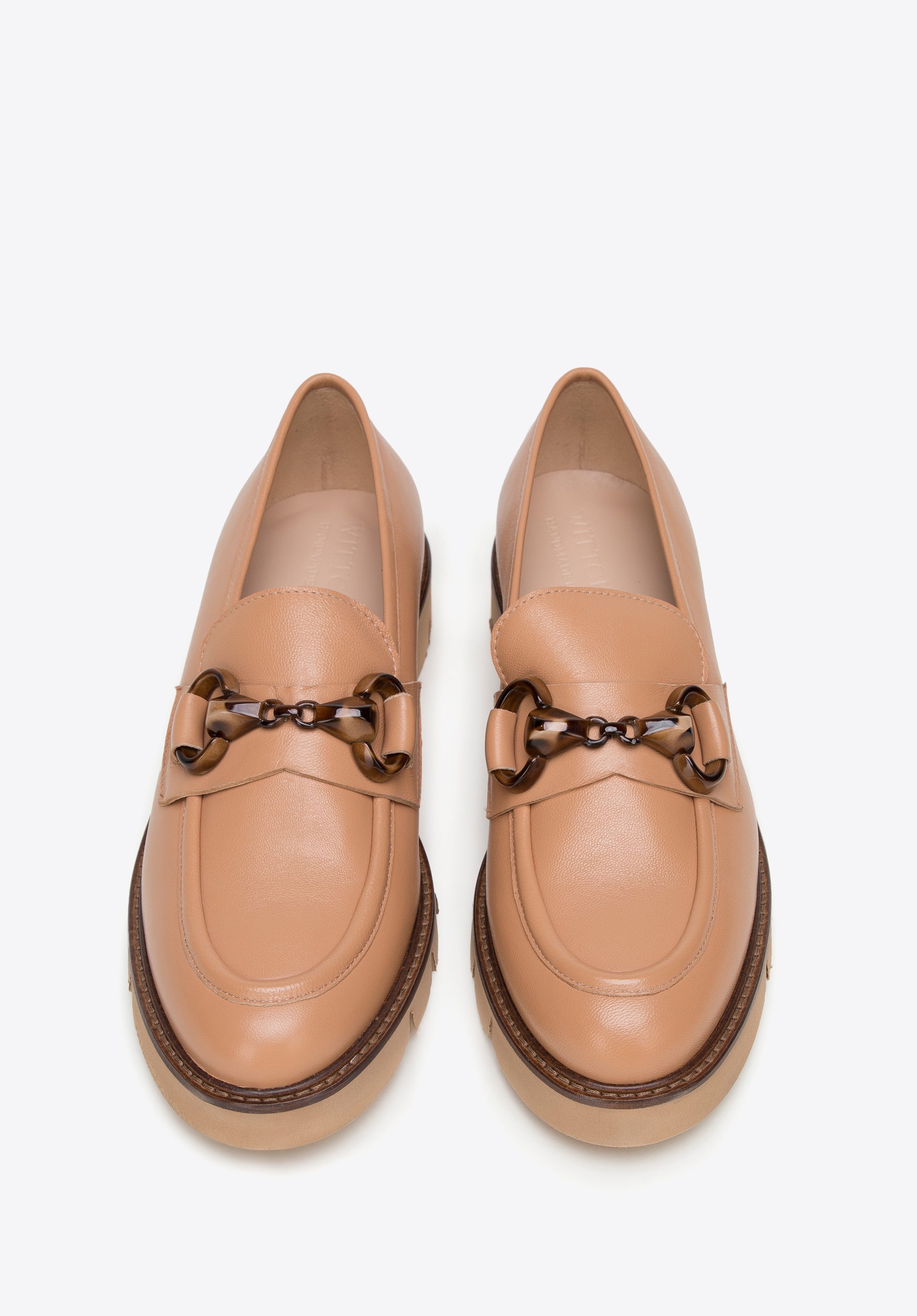 Ponadczasowy fason mokasynów z charakterystycznie obszytym noskiem dopełnia klamra w kolorze brązowym, w delikatny wzór. Wykonane zostały