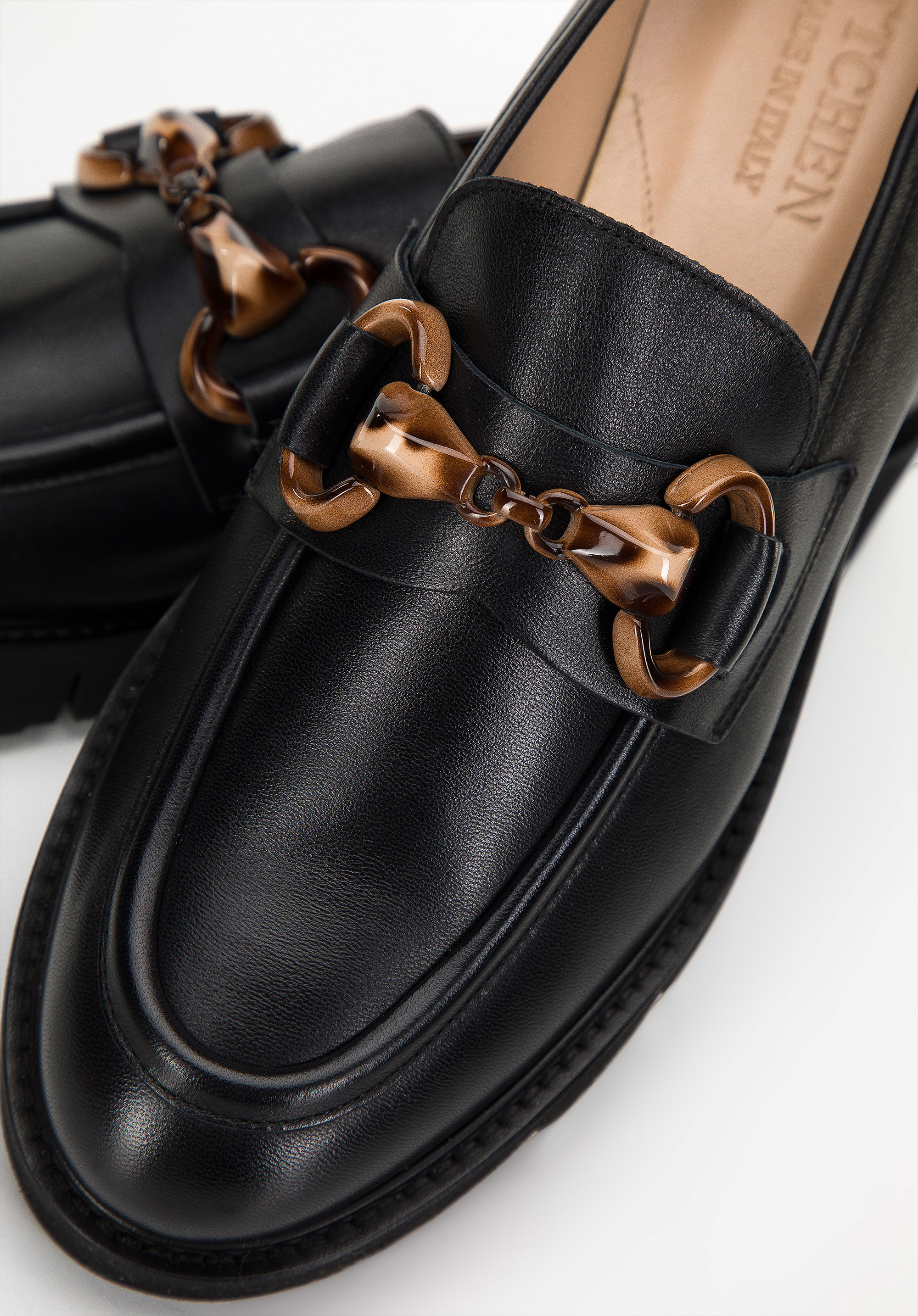 Ponadczasowy fason mokasynów z charakterystycznie obszytym noskiem dopełnia klamra w kolorze brązowym, w delikatny wzór. Wykonane zostały