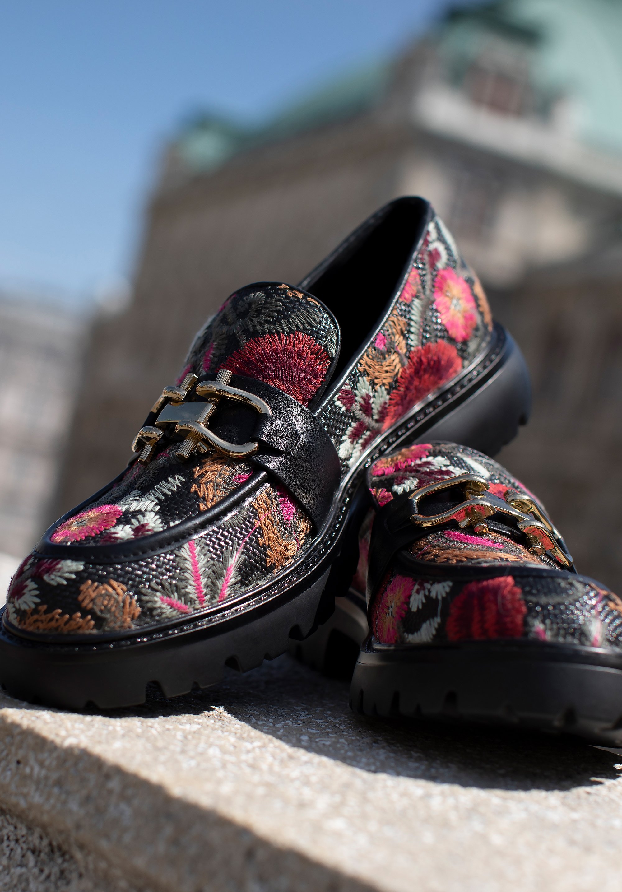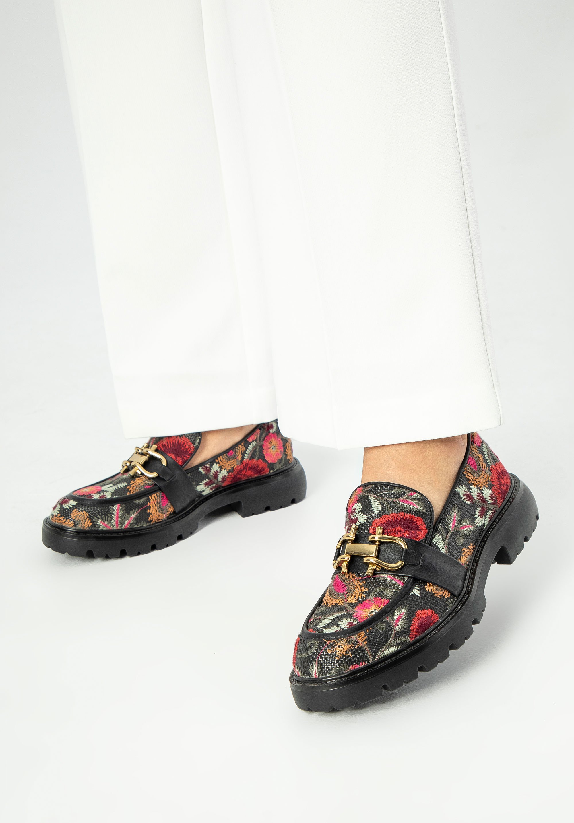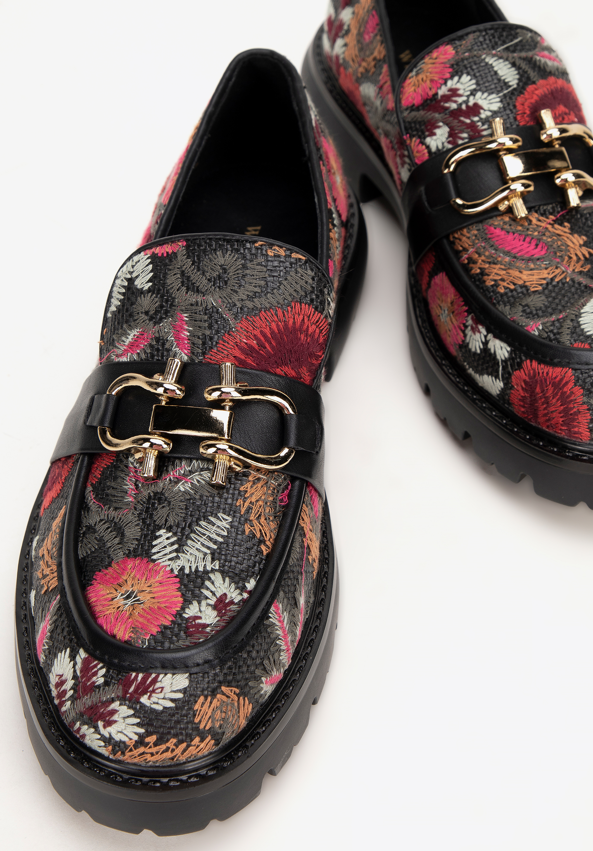 Zanurz się w elegancji i wygodzie z naszymi damskimi mokasynami na platformie! Wykonane z wysokiej jakości materiałów, te mokasyny łączą trwałość z komfortem, idealnie sprawdzając się zarówno w codziennych, jak i bardziej eleganckich stylizacjach. Haftowane wzory na butach i złote akcenty na wstawce nadają im niepowtarzalny charakter.
