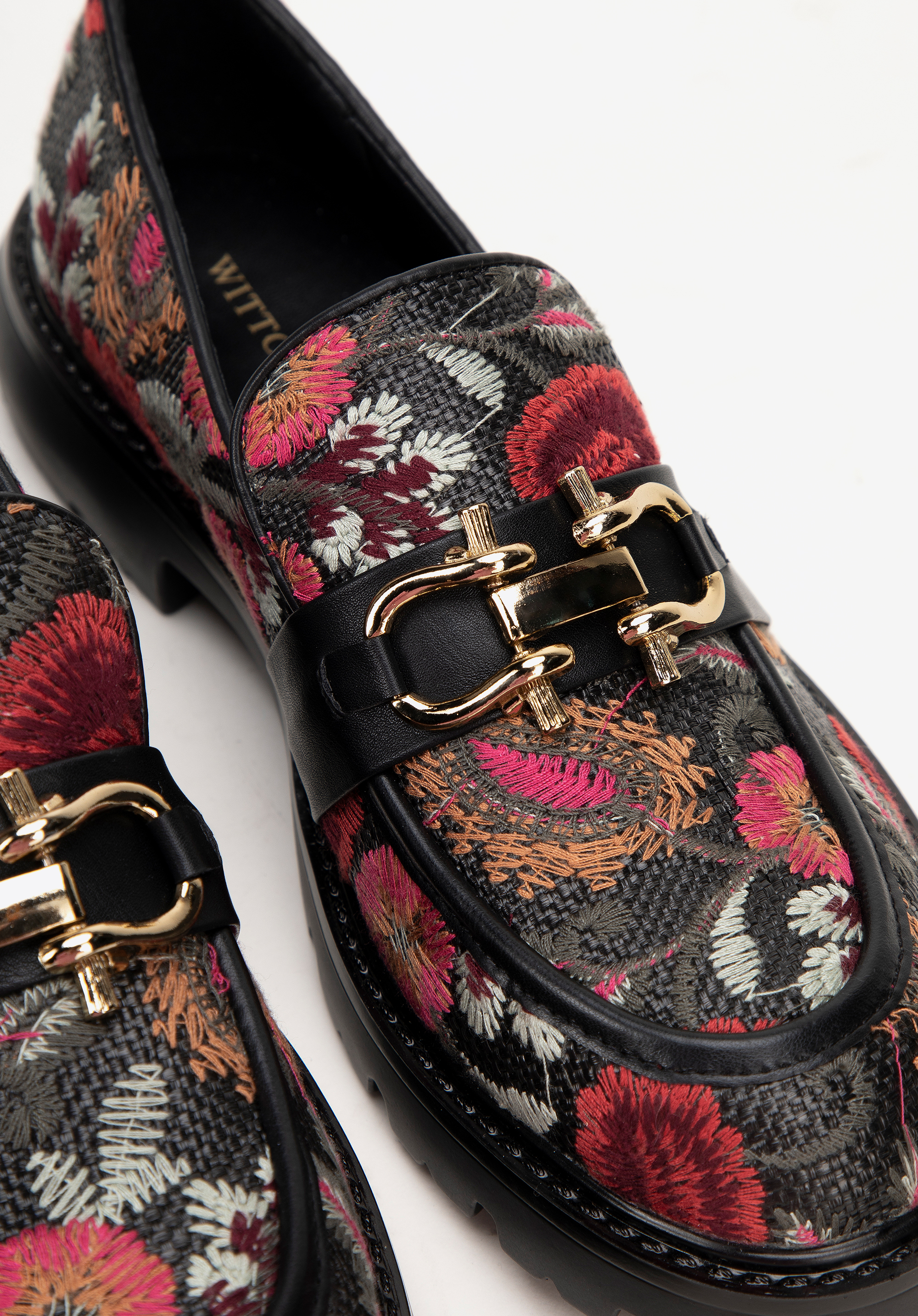 - Detale: Haftowane wzory nadają butom oryginalny charakter. Złote akcenty umieszczone na wstawce subtelnie błyszczą, dodając elegancji i wyjątkowego uroku, który przyciąga wzrok. Każdy detal jest starannie wykonany, co podkreśla wysoką jakość produktu.