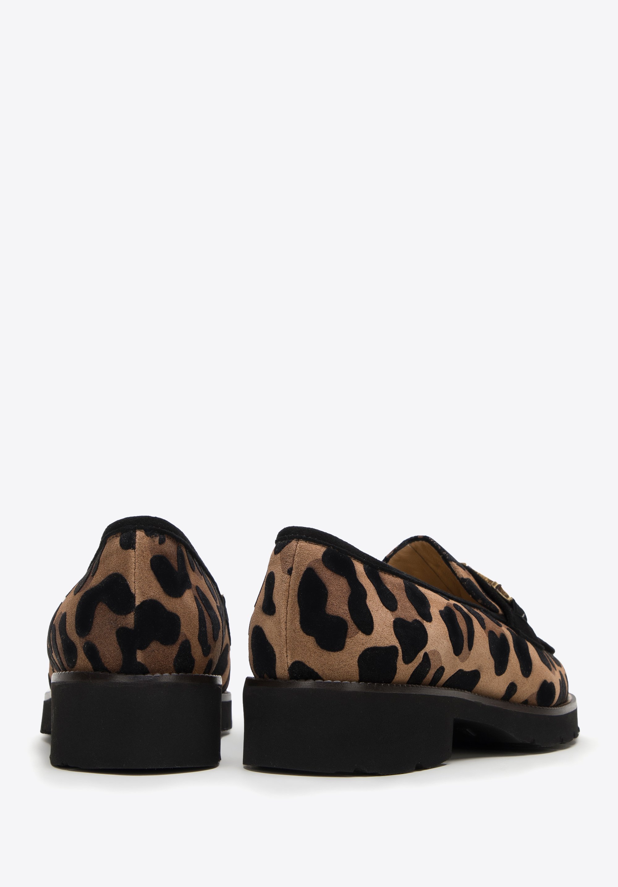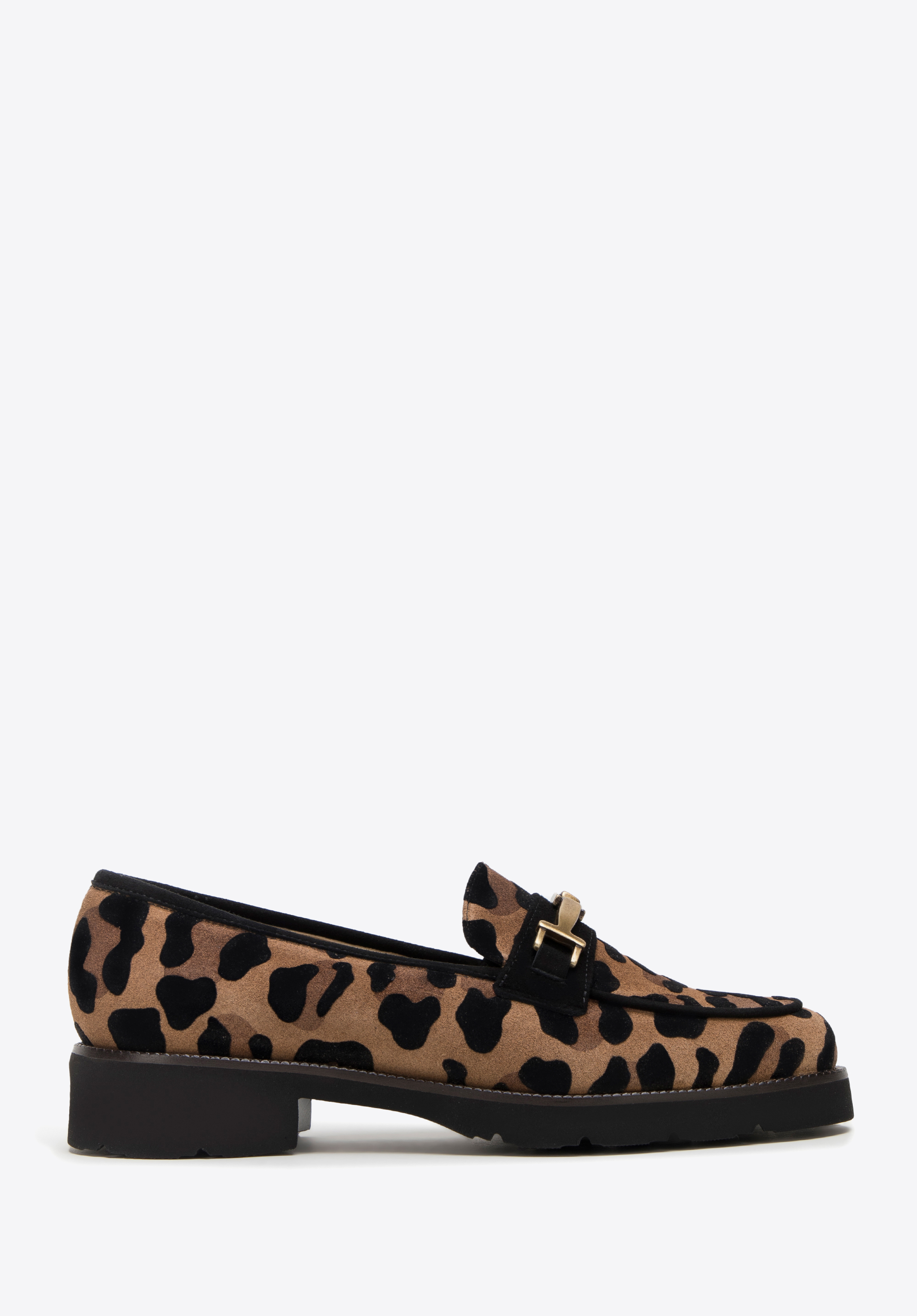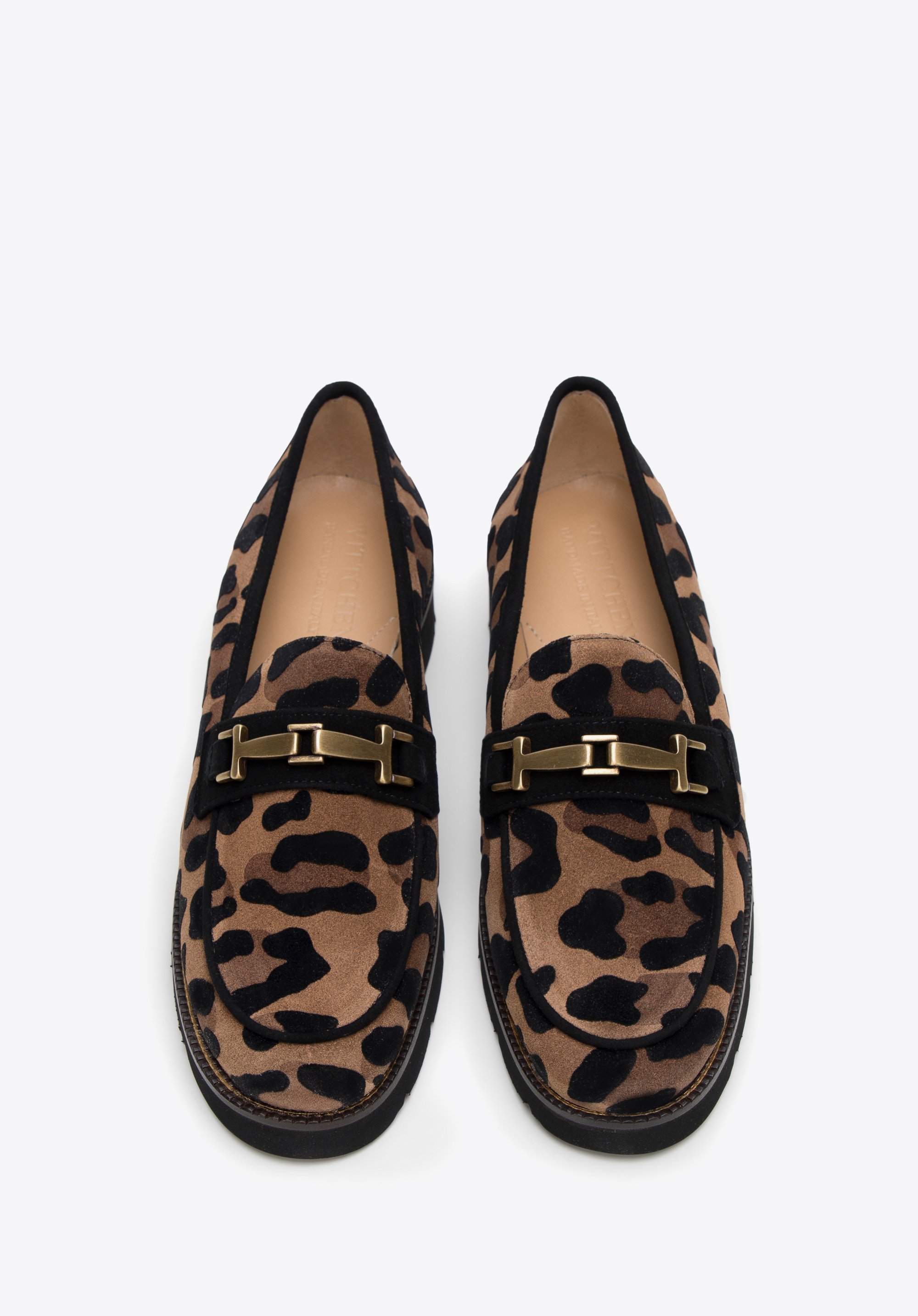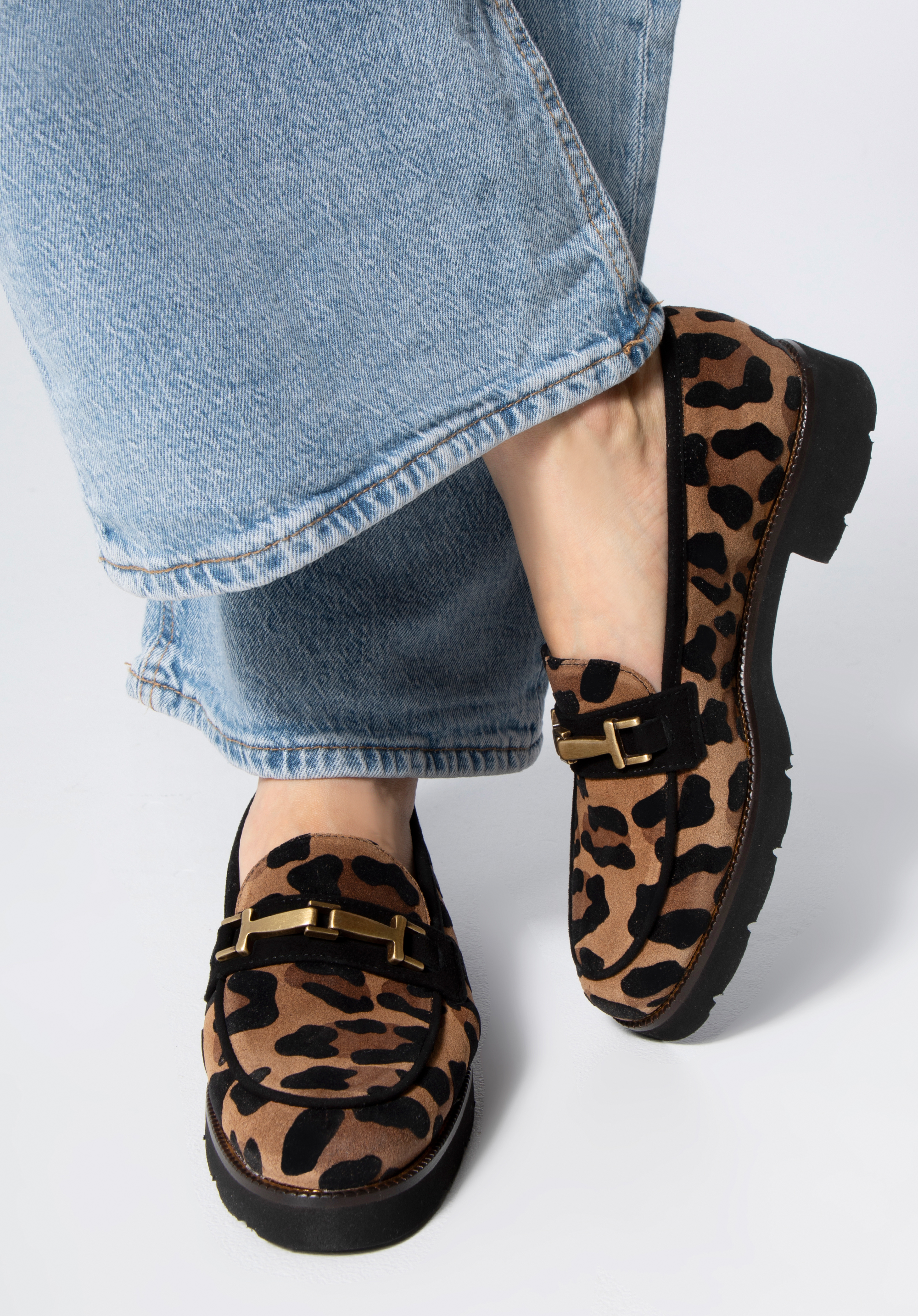 Damskie mokasyny zamszowe w panterkę z błyszczącą klamrą to modny dodatek, w którym możesz chodzić codziennie.
