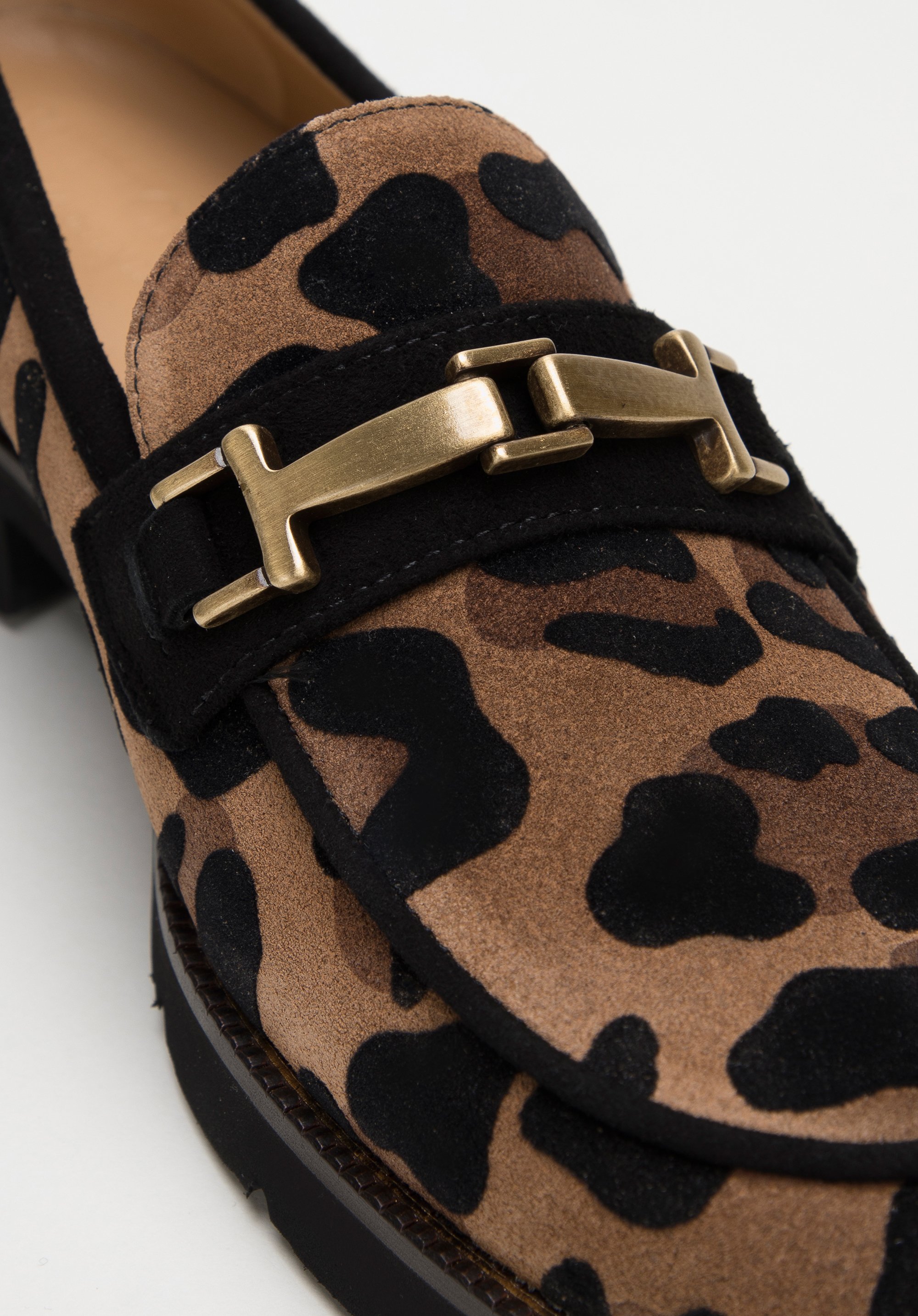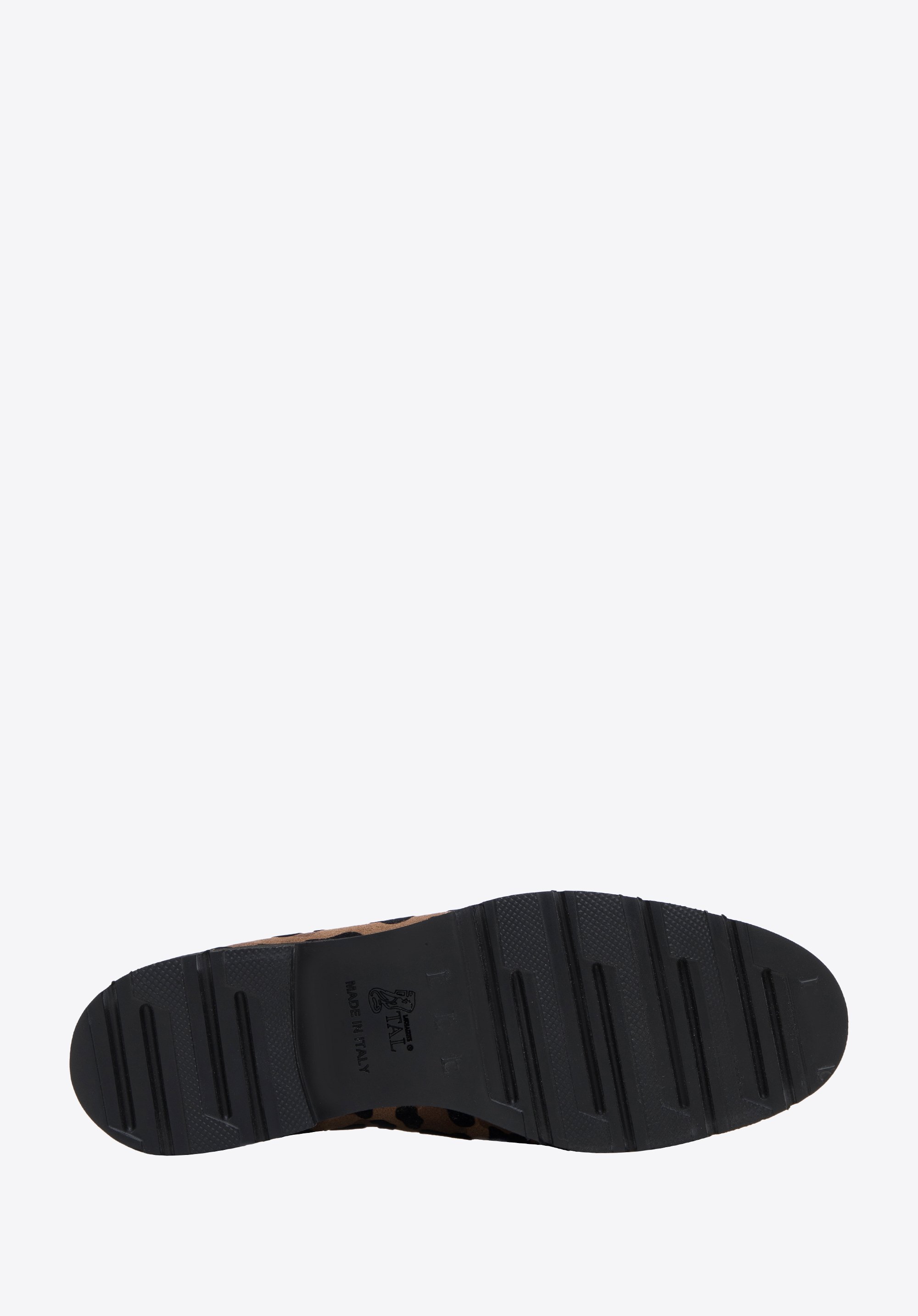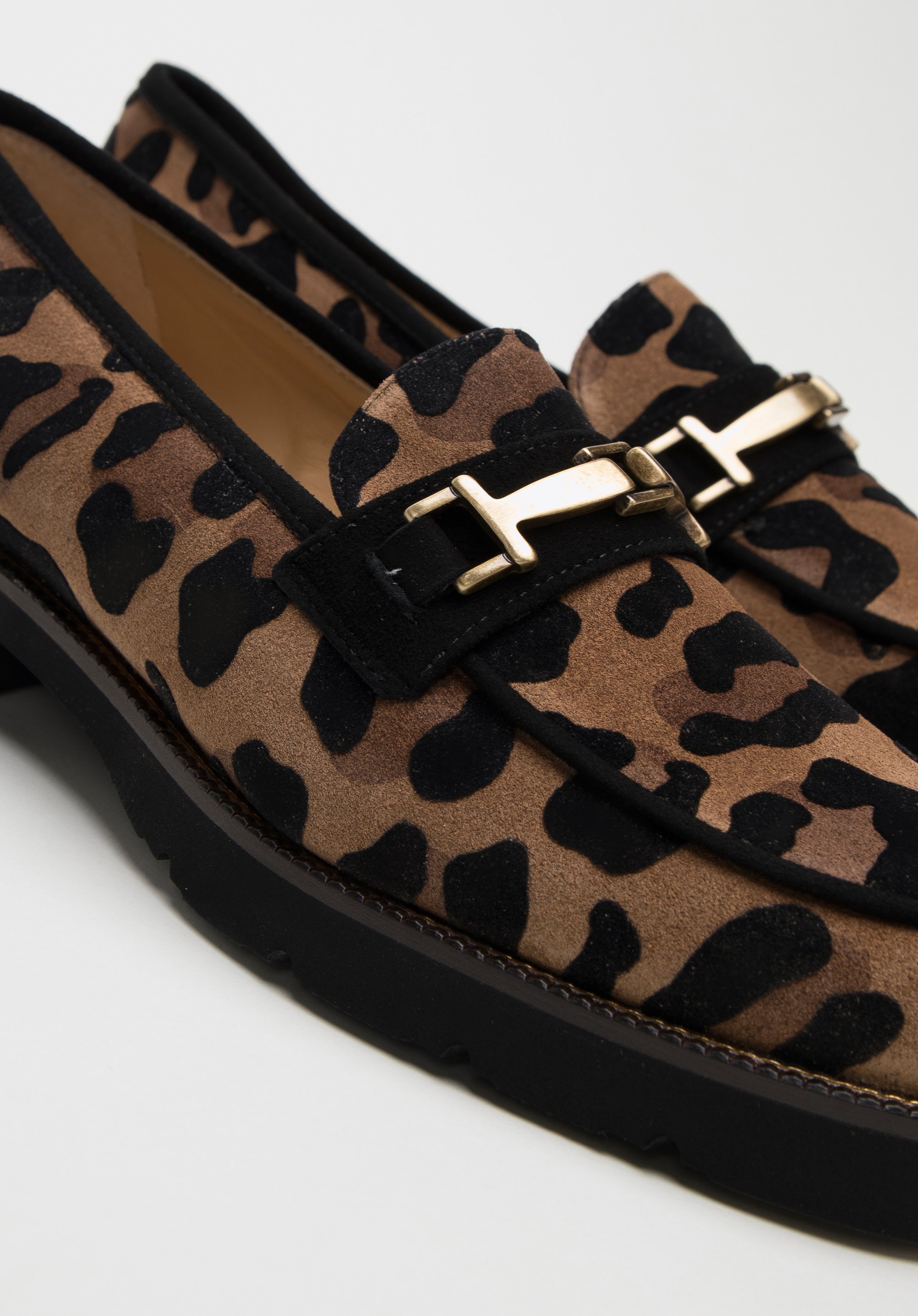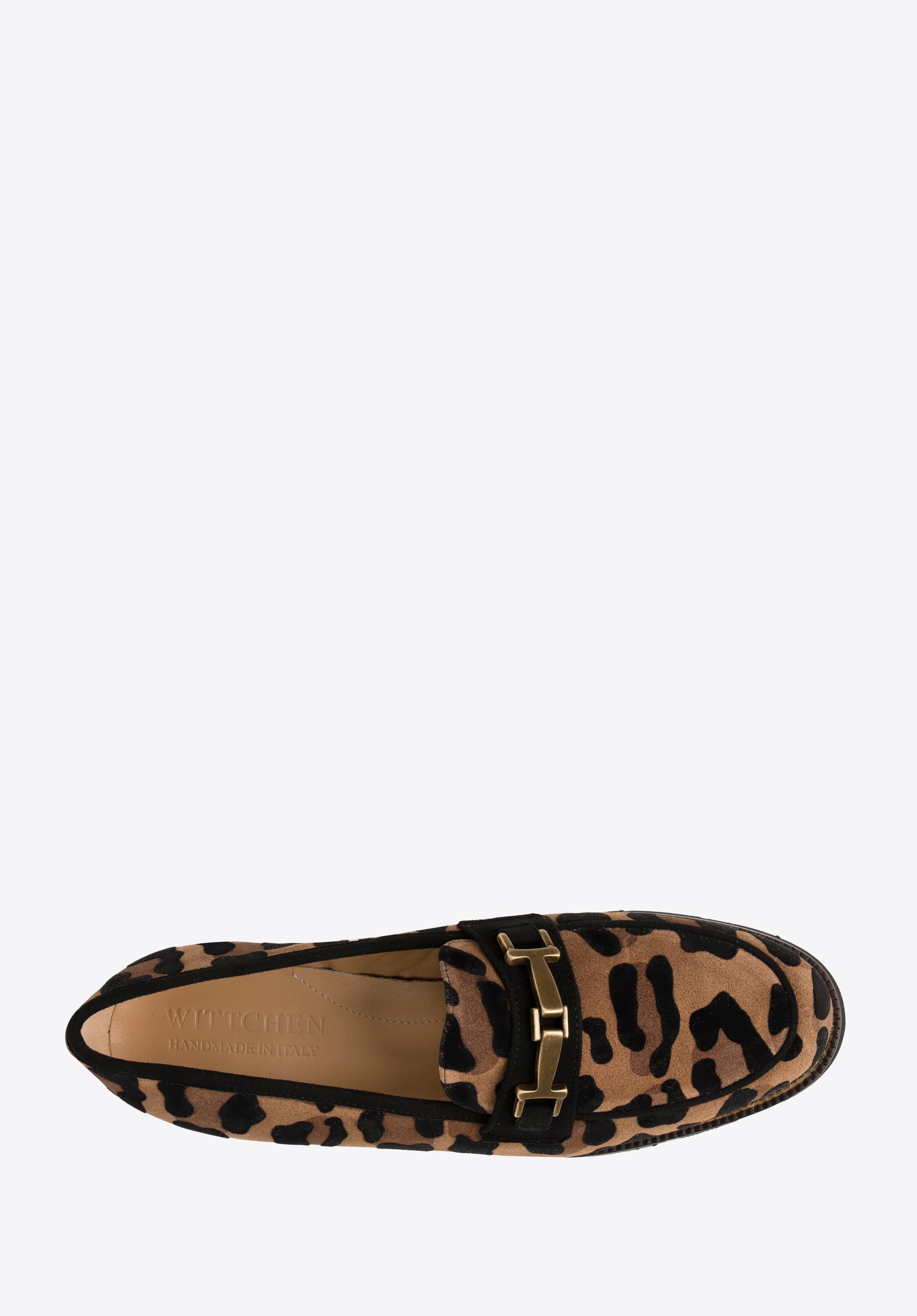 Damskie mokasyny zamszowe w panterkę z błyszczącą klamrą to modny dodatek, w którym możesz chodzić codziennie.
