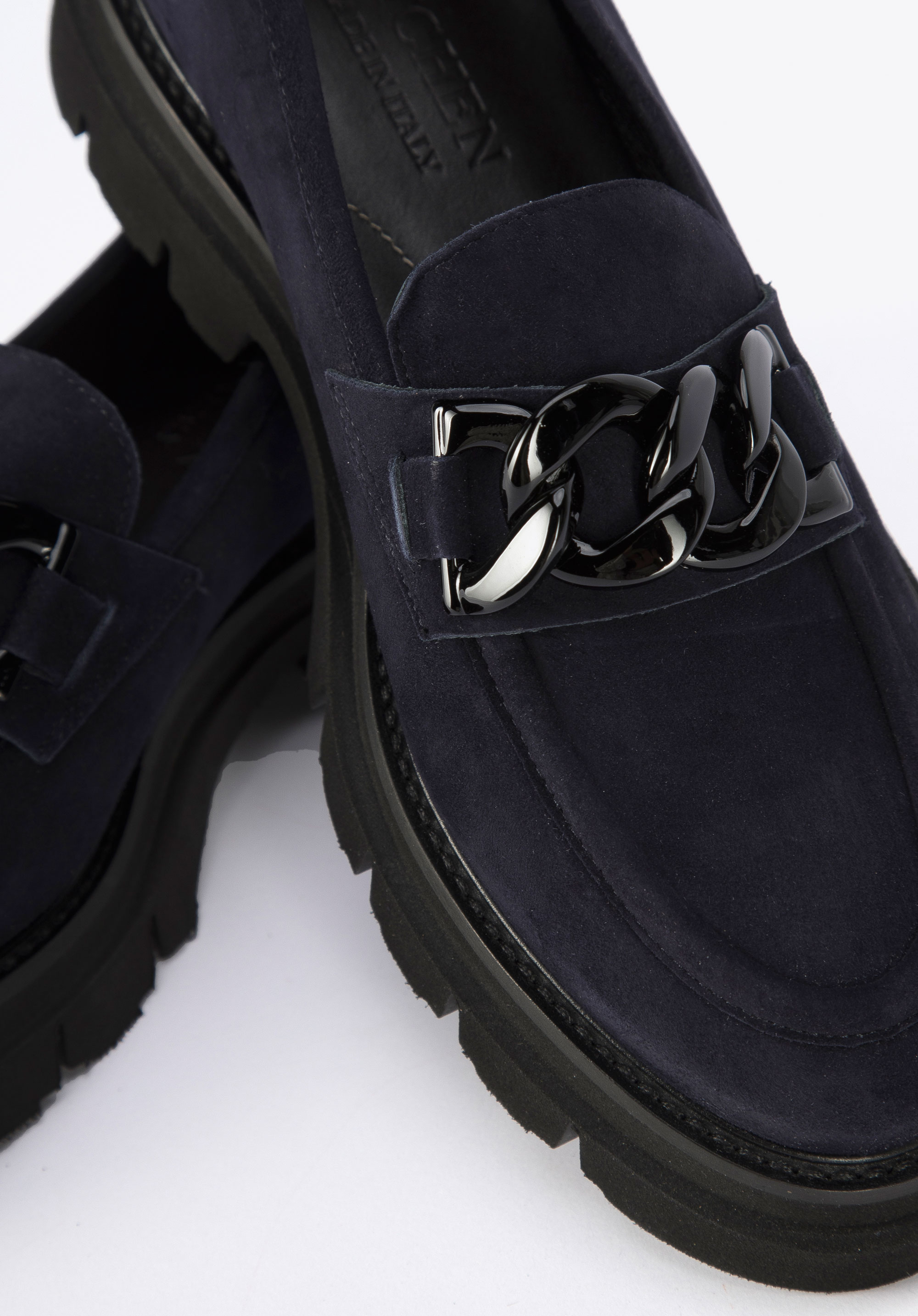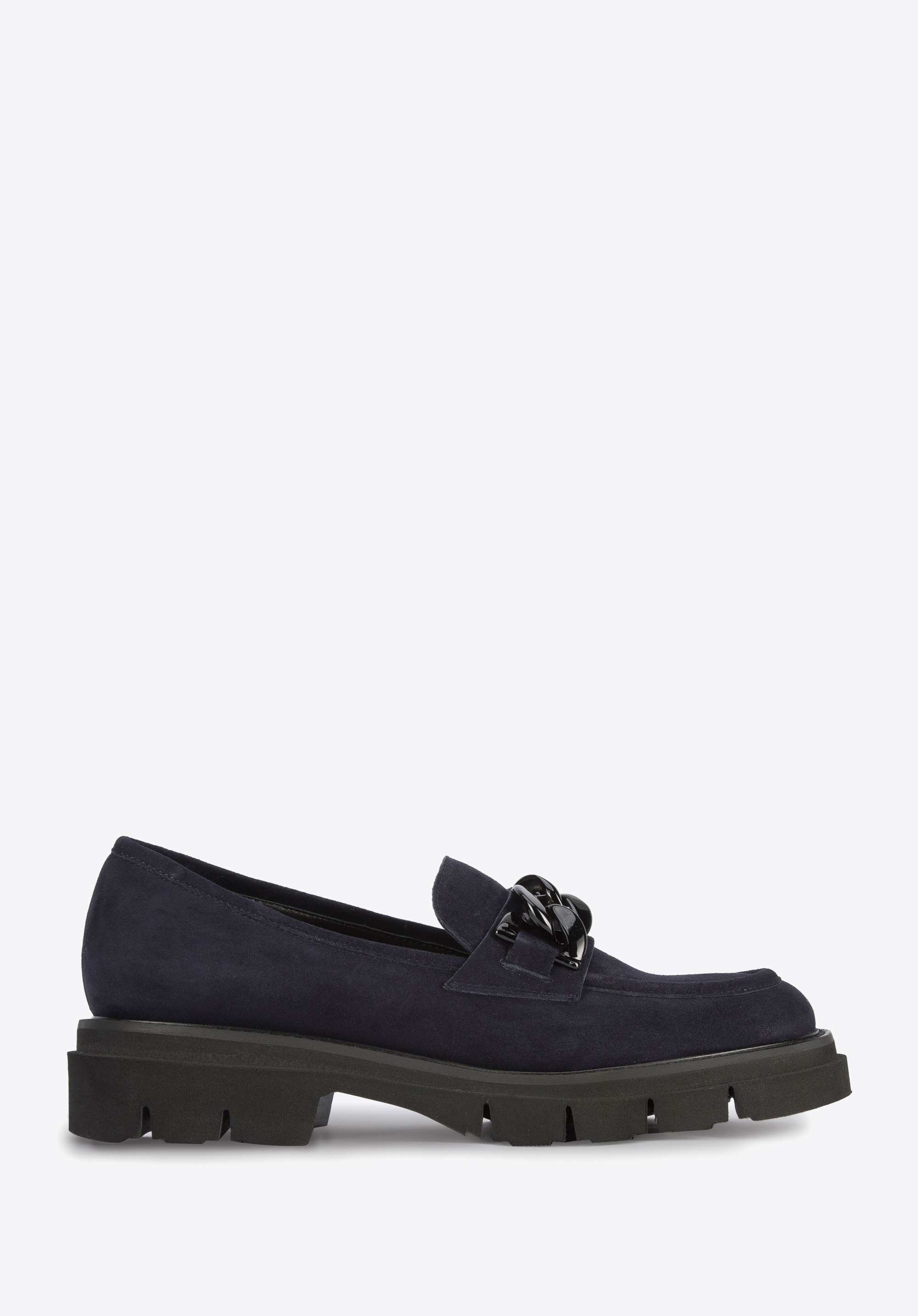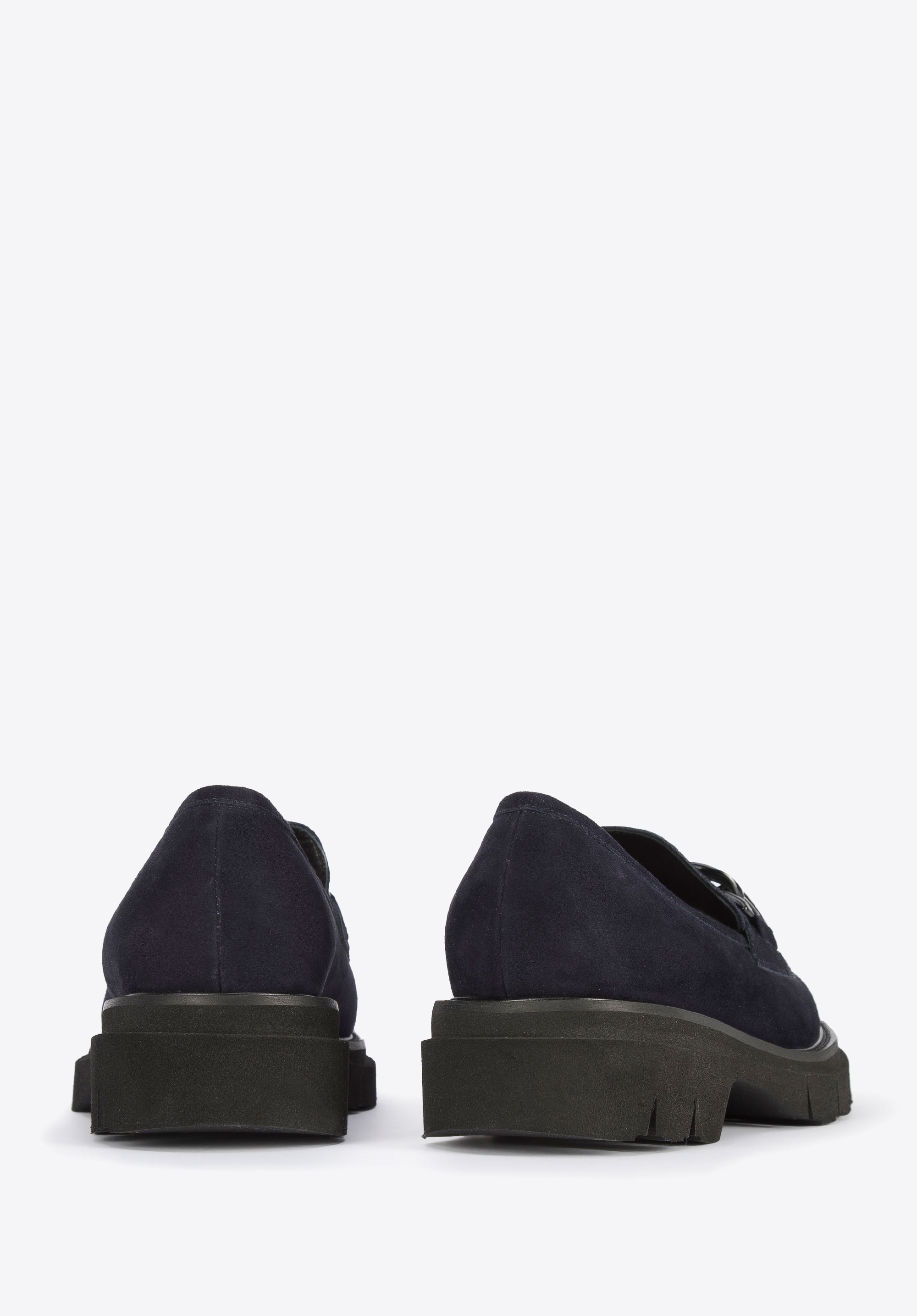 delikatnie połyskujący łańcuch o dużych ogniwach. Podeszwa z wyraźnym bieżnikiem jest zaskakująco lekka, więc komfortowo przechodzisz w nich cały dzień. To świetne buty zarówno na co dzień do pracy, jak i po pracy: i do chinosów, i do spódnicy mini.
