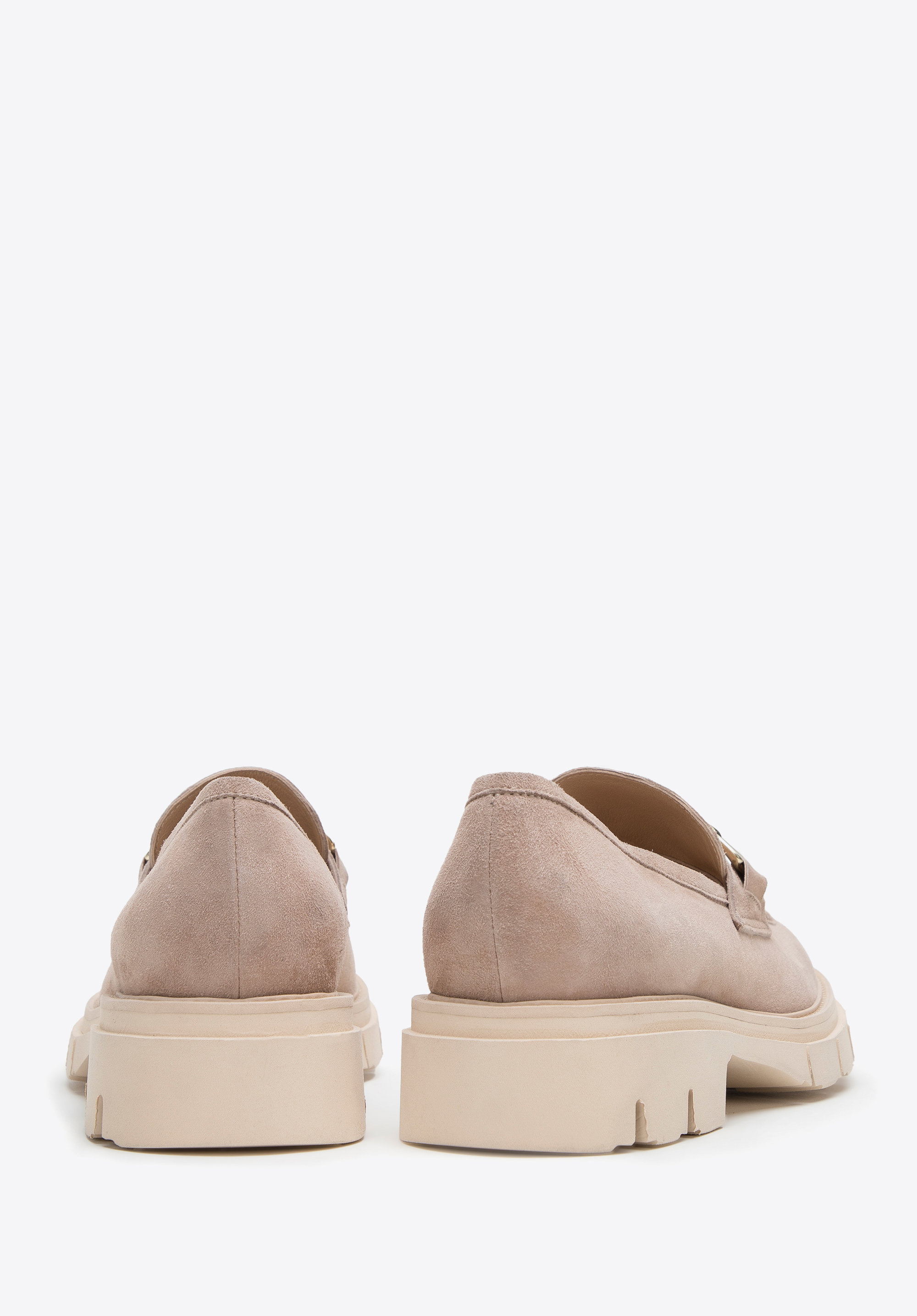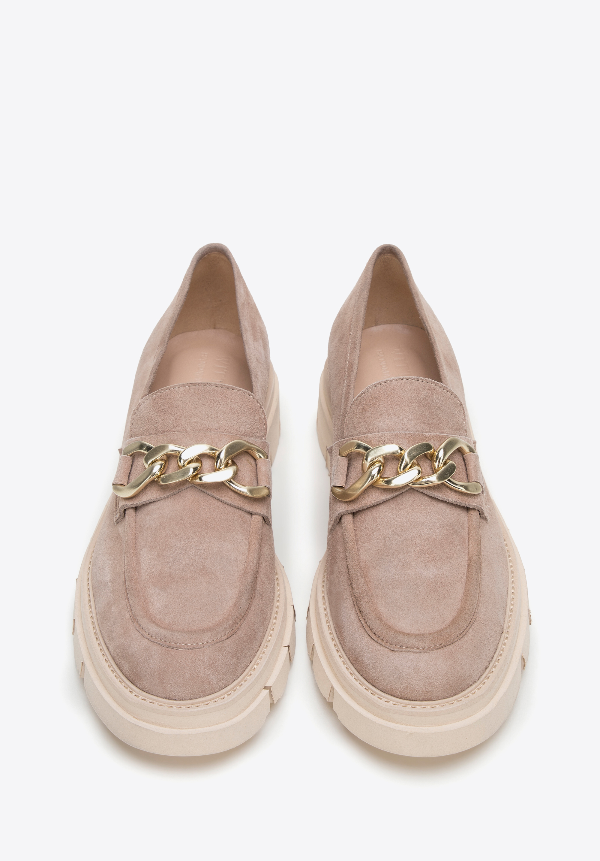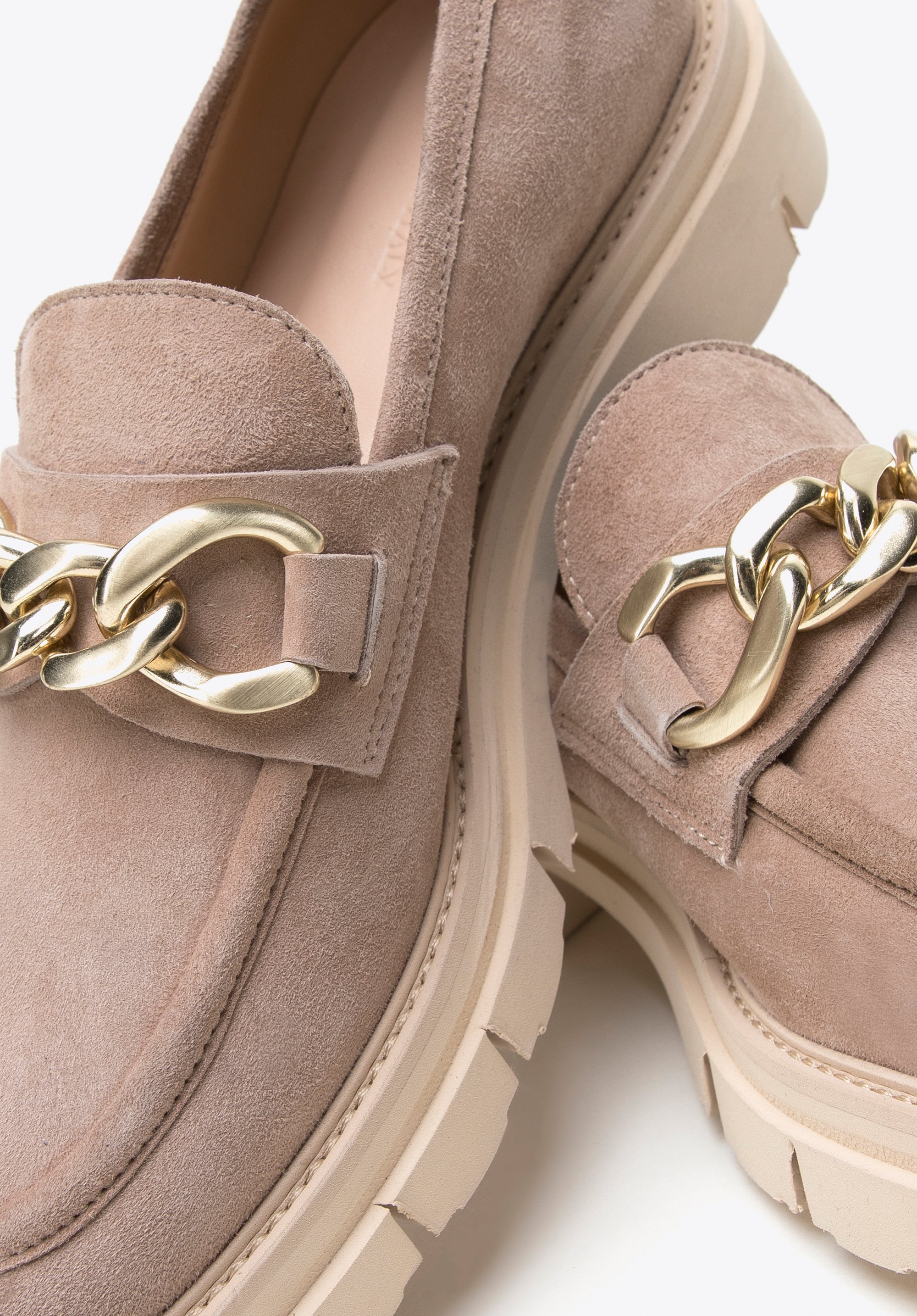 Damskie mokasyny zamszowe z łańcuchem na platformie beżowe