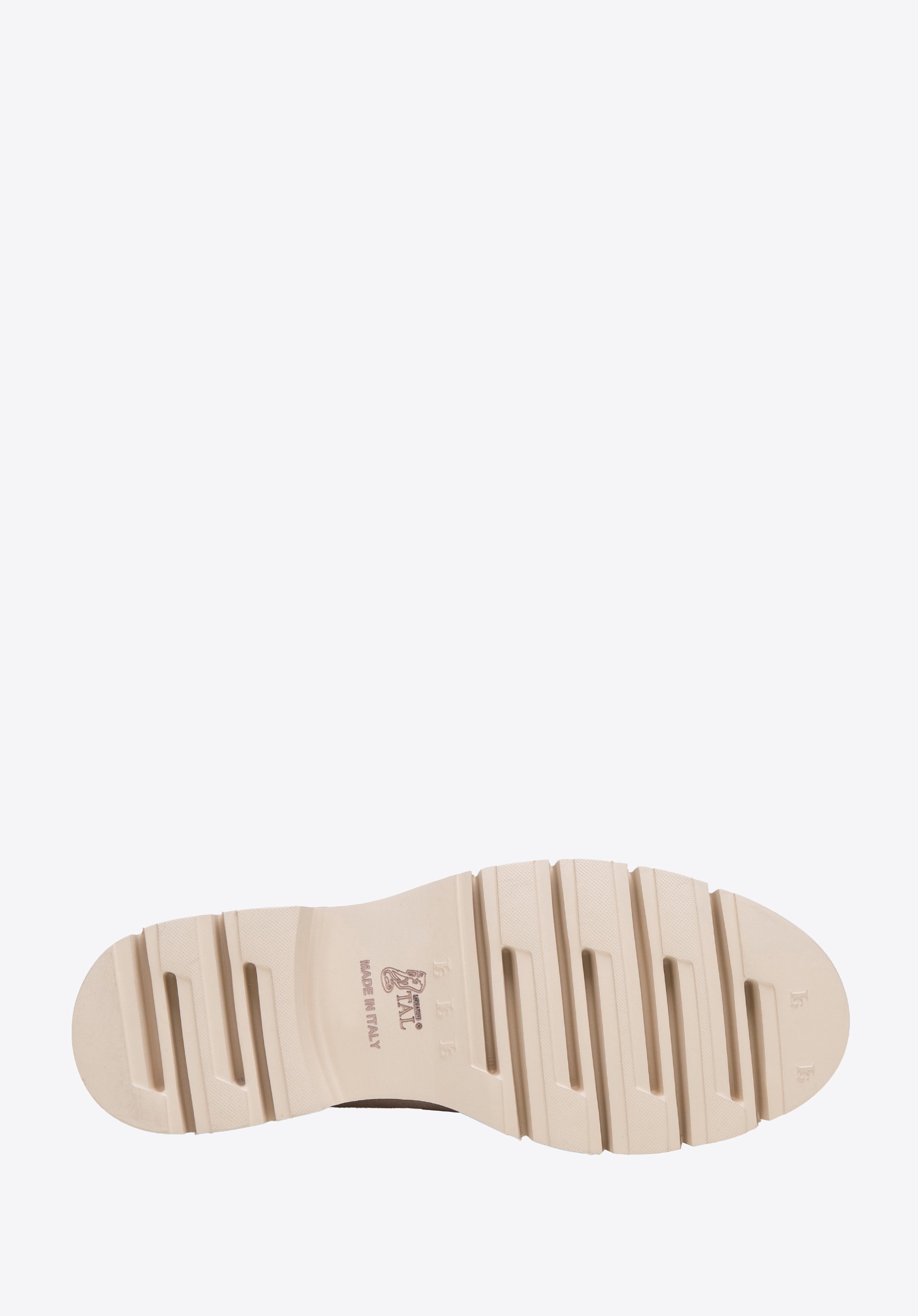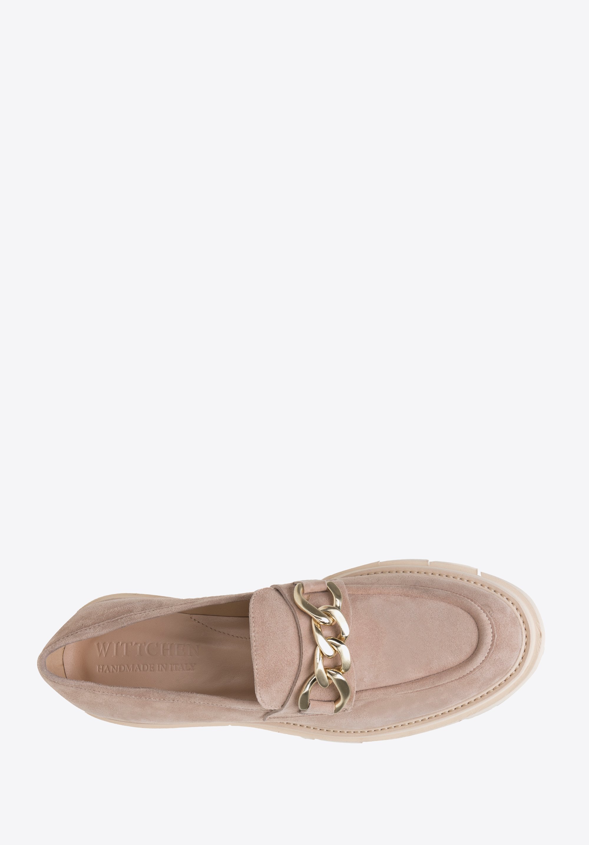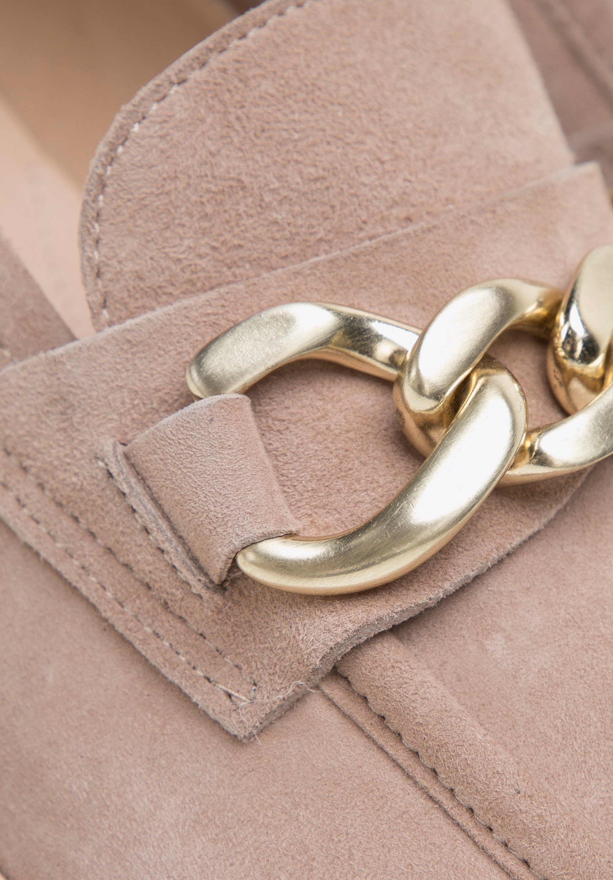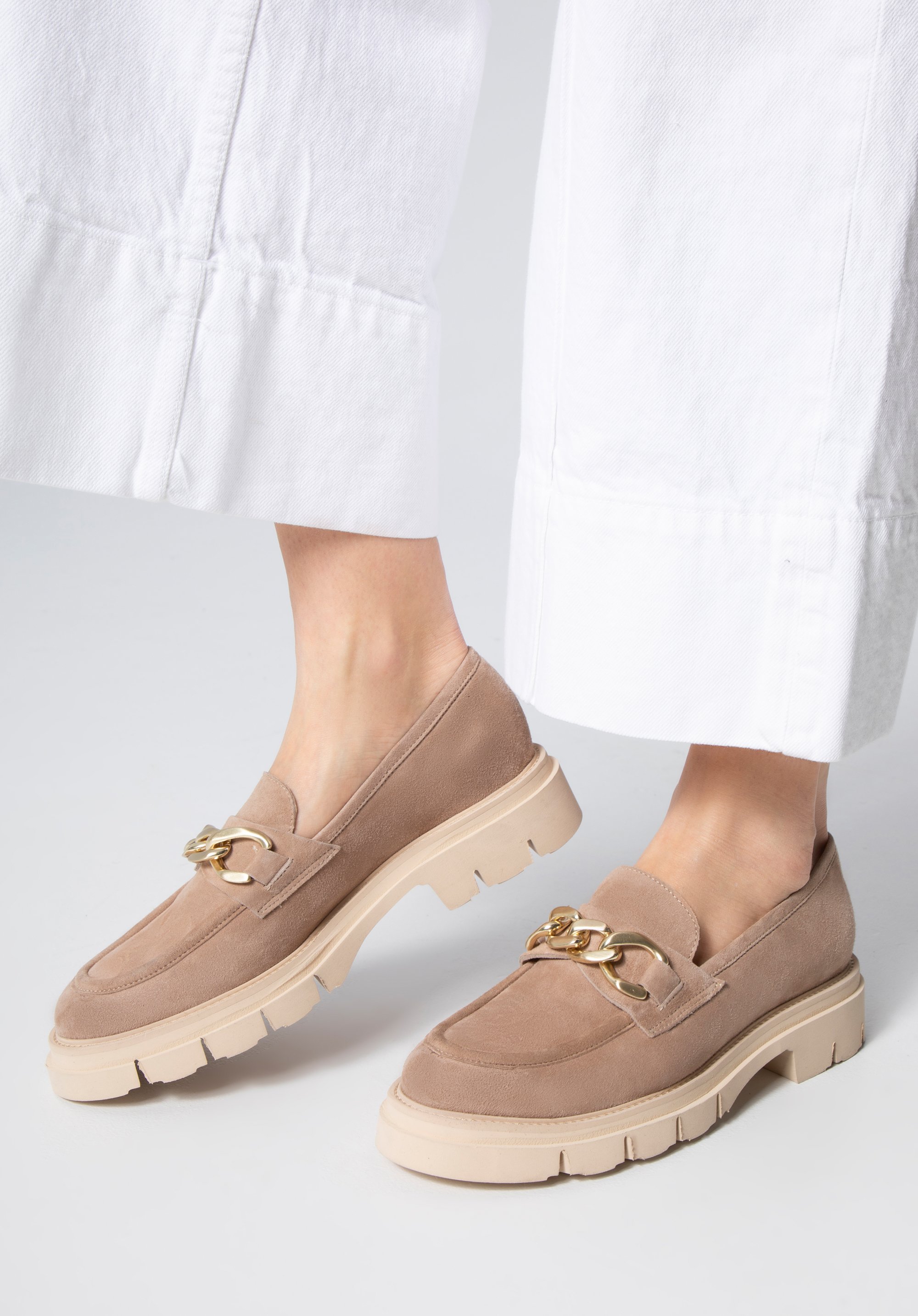 Damskie mokasyny zamszowe z łańcuchem na platformie beżowe