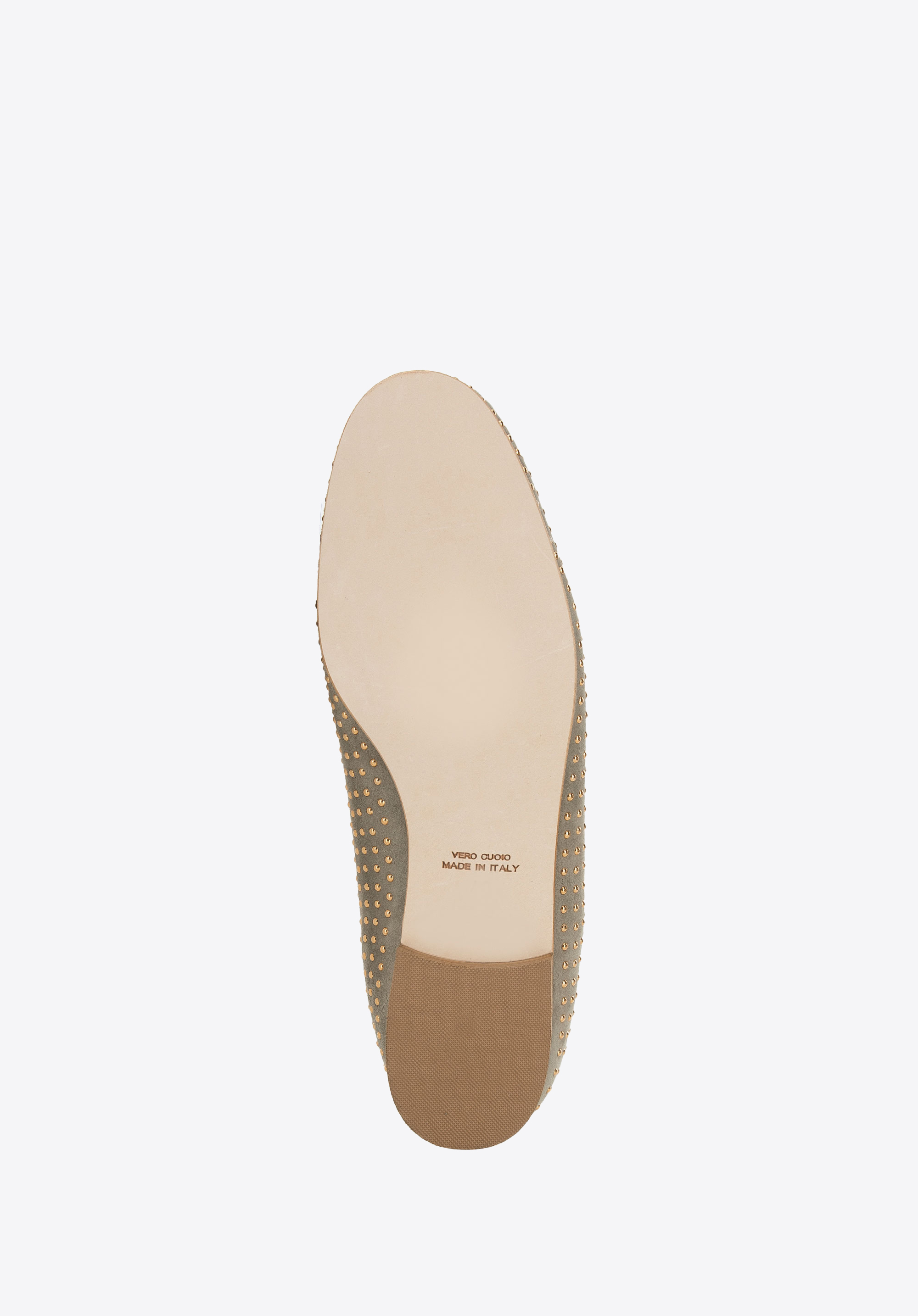 oryginalne nitowanie na całej powierzchni, które sprawia wrażenie deseniu w kropki. Mają smukłą linię pięknie eksponującą stopę i kostkę.