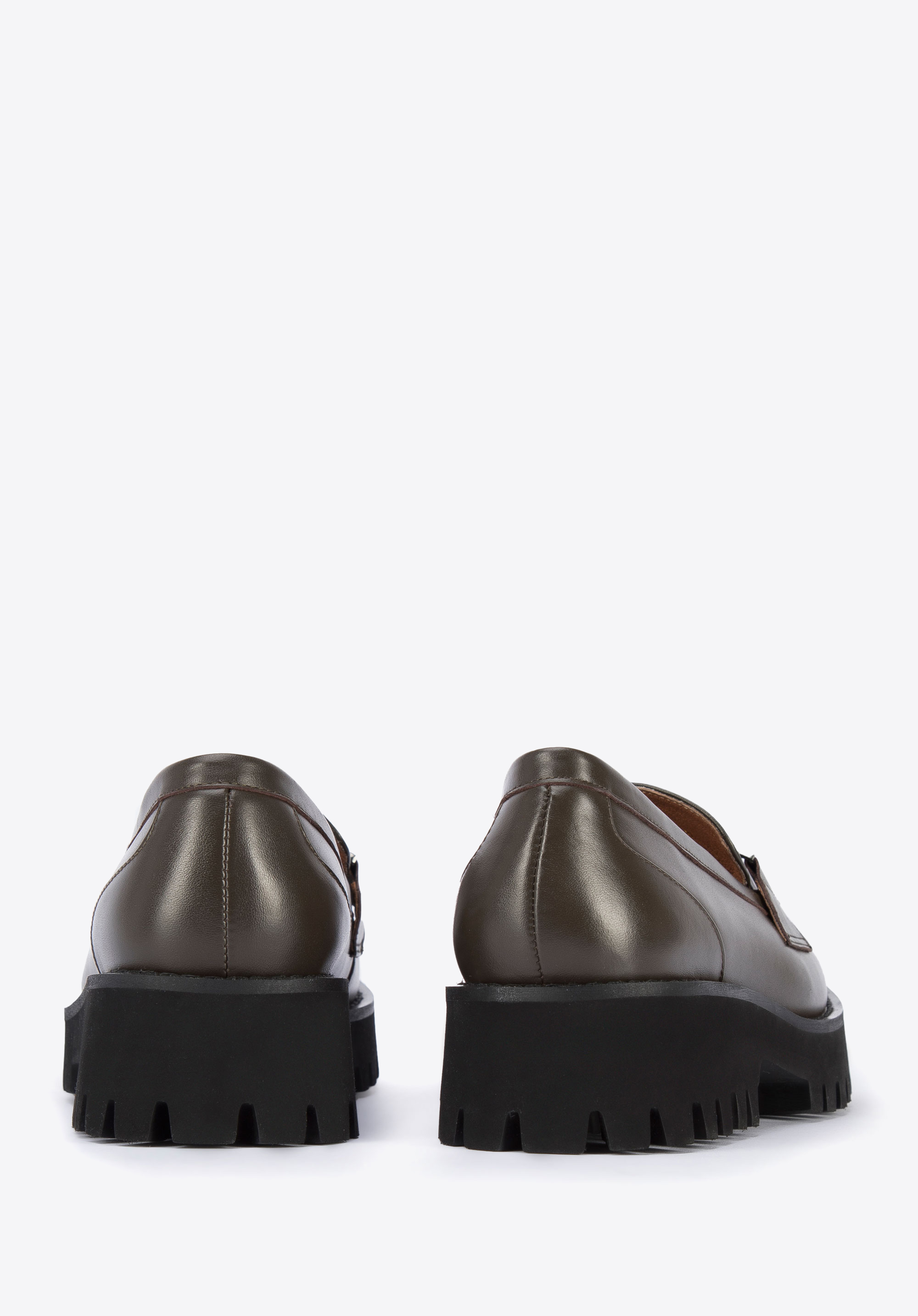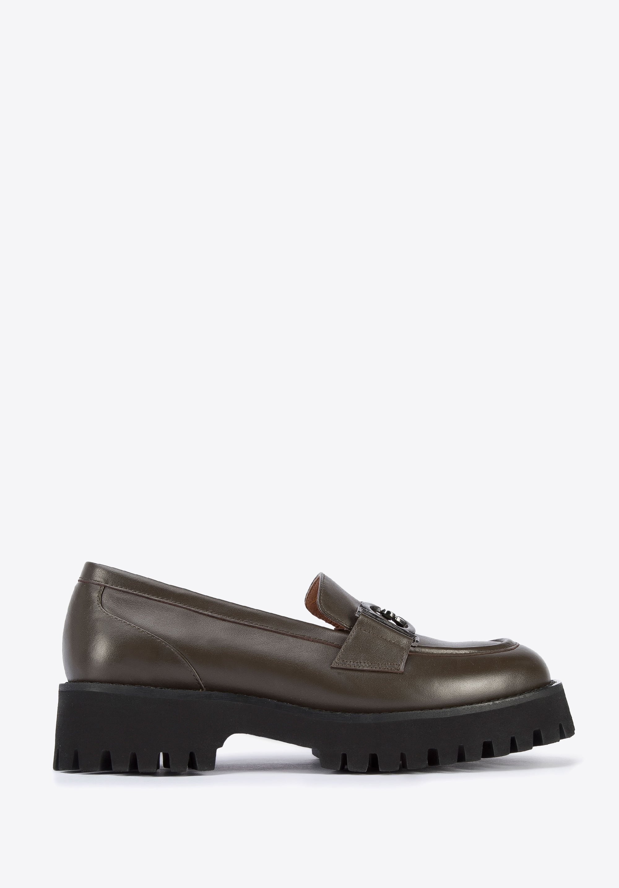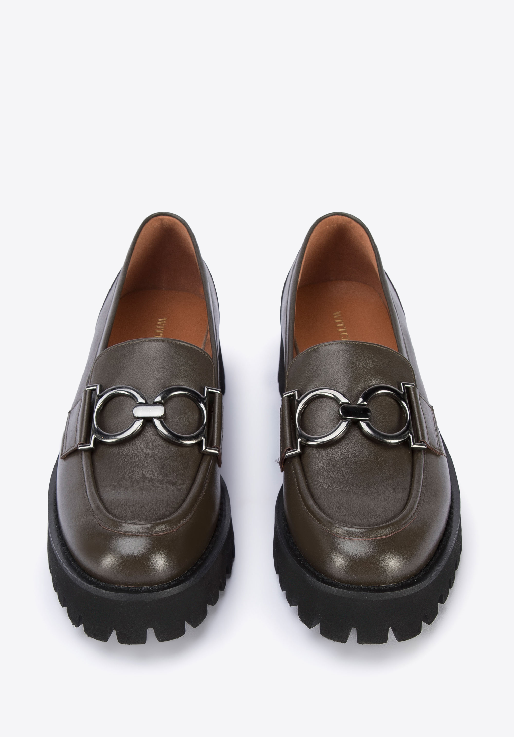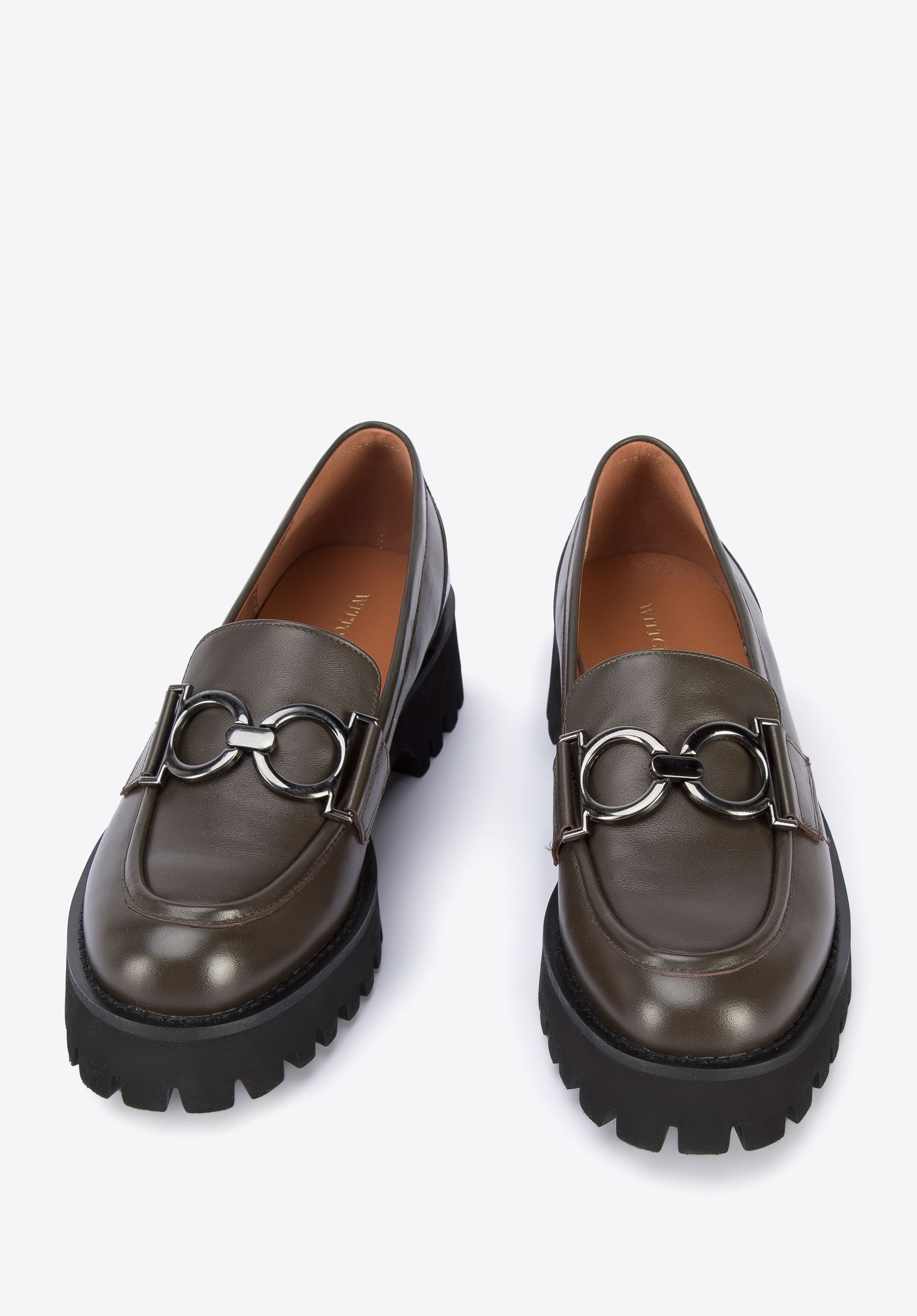 Damskie mokasyny ze skóry z klamrą na grubej podeszwie to eleganckie obuwie na wiele okazji.