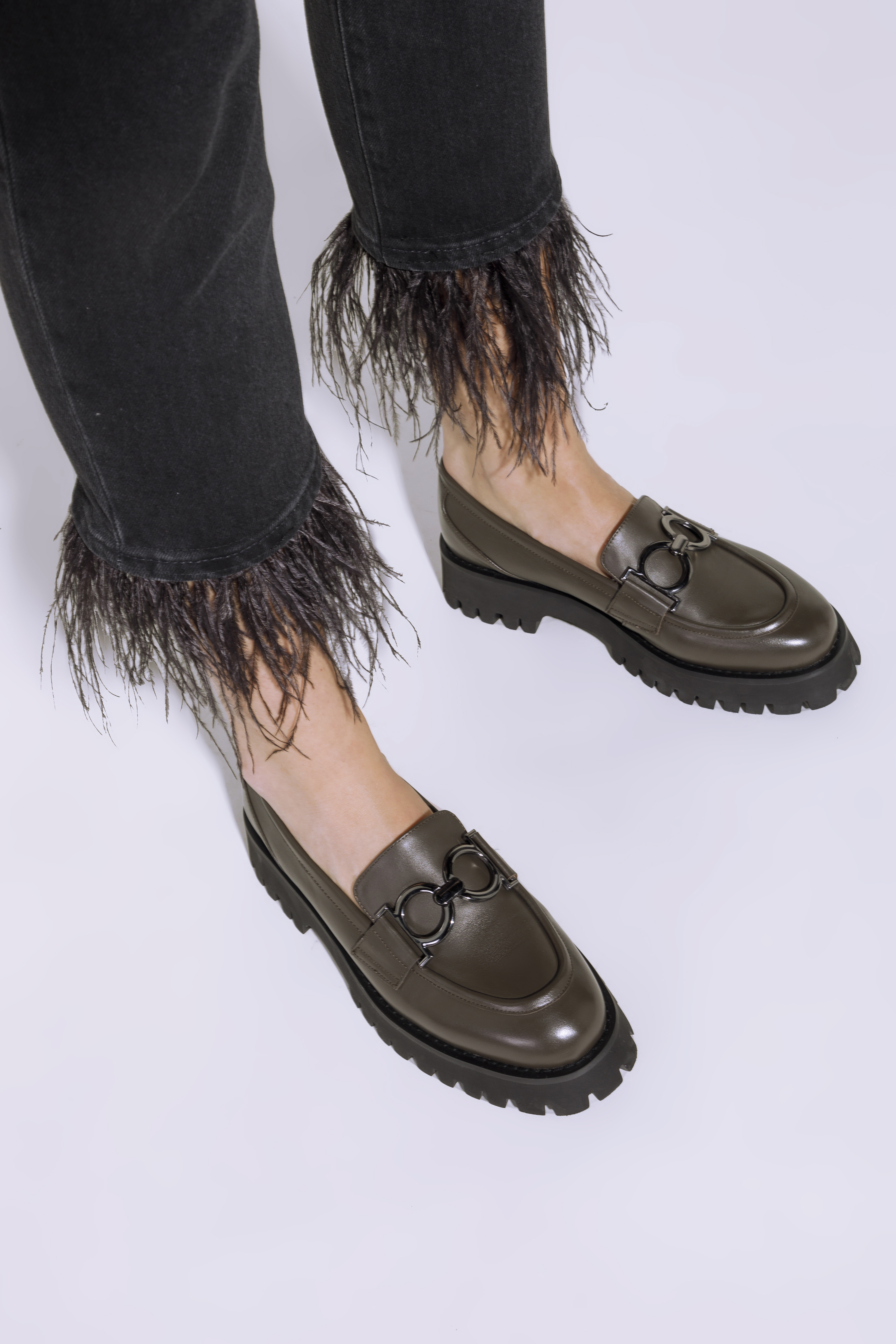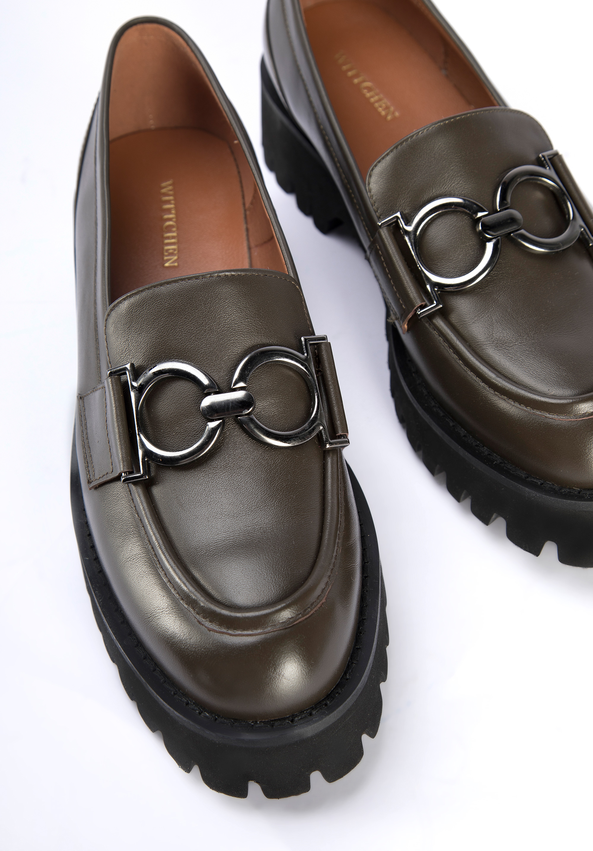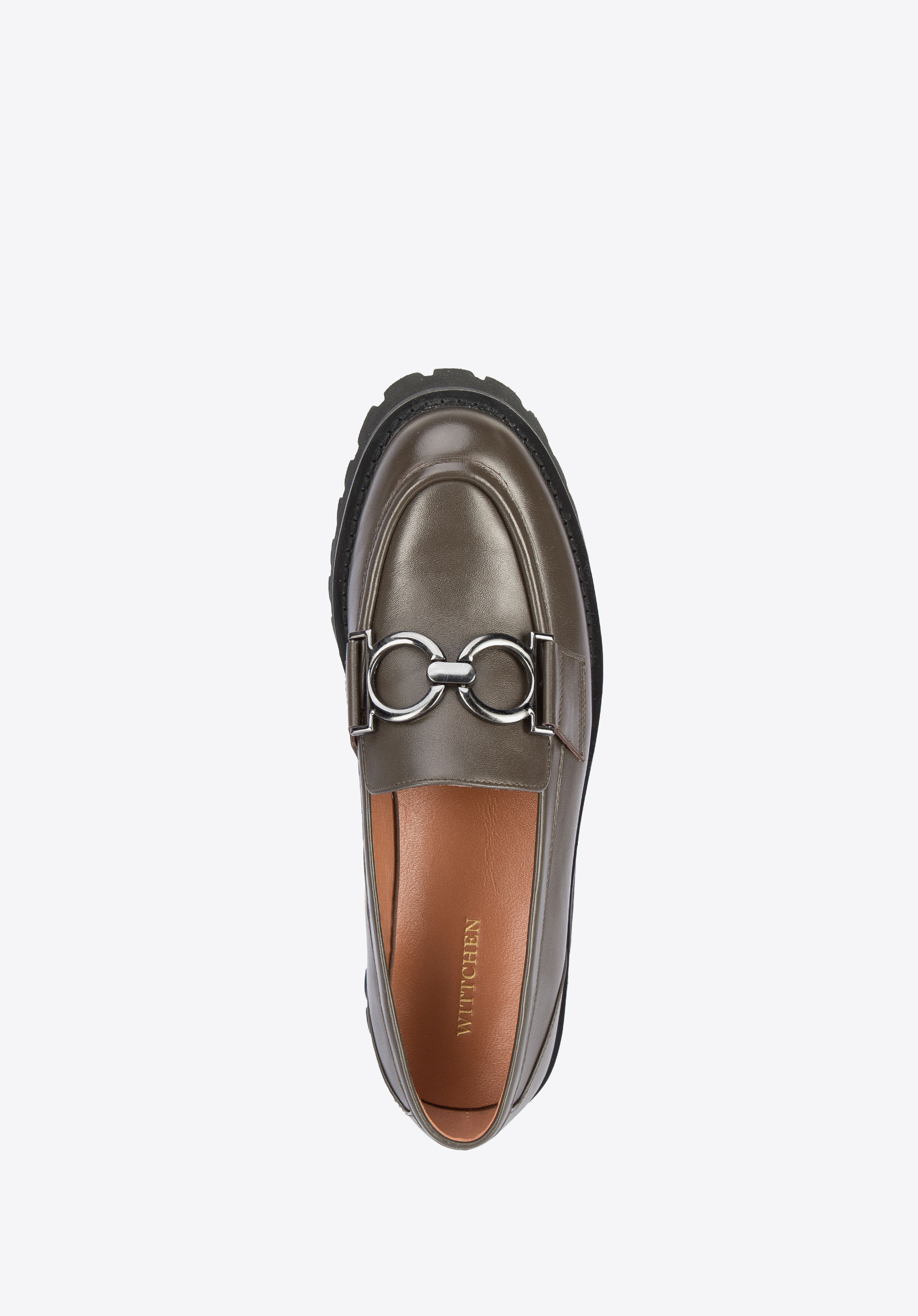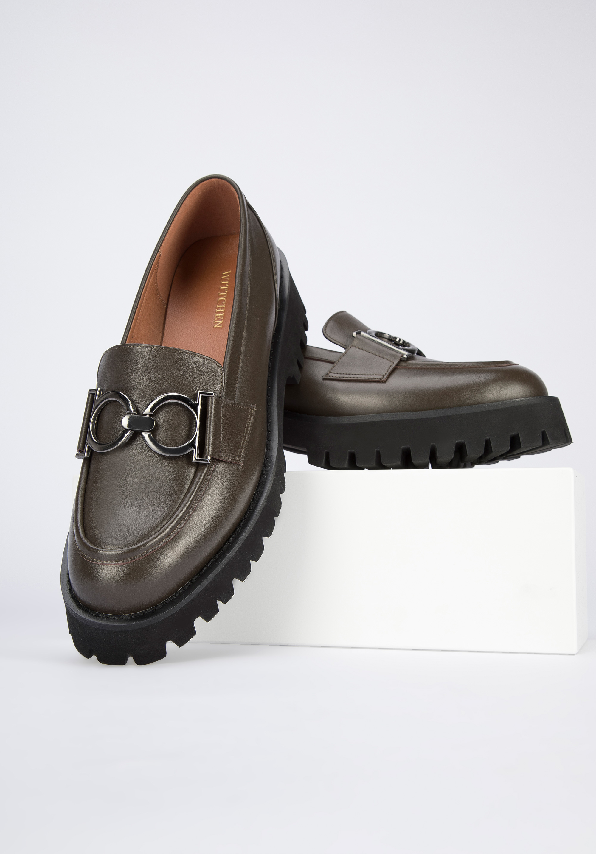 Damskie mokasyny ze skóry z klamrą na grubej podeszwie to eleganckie obuwie na wiele okazji.