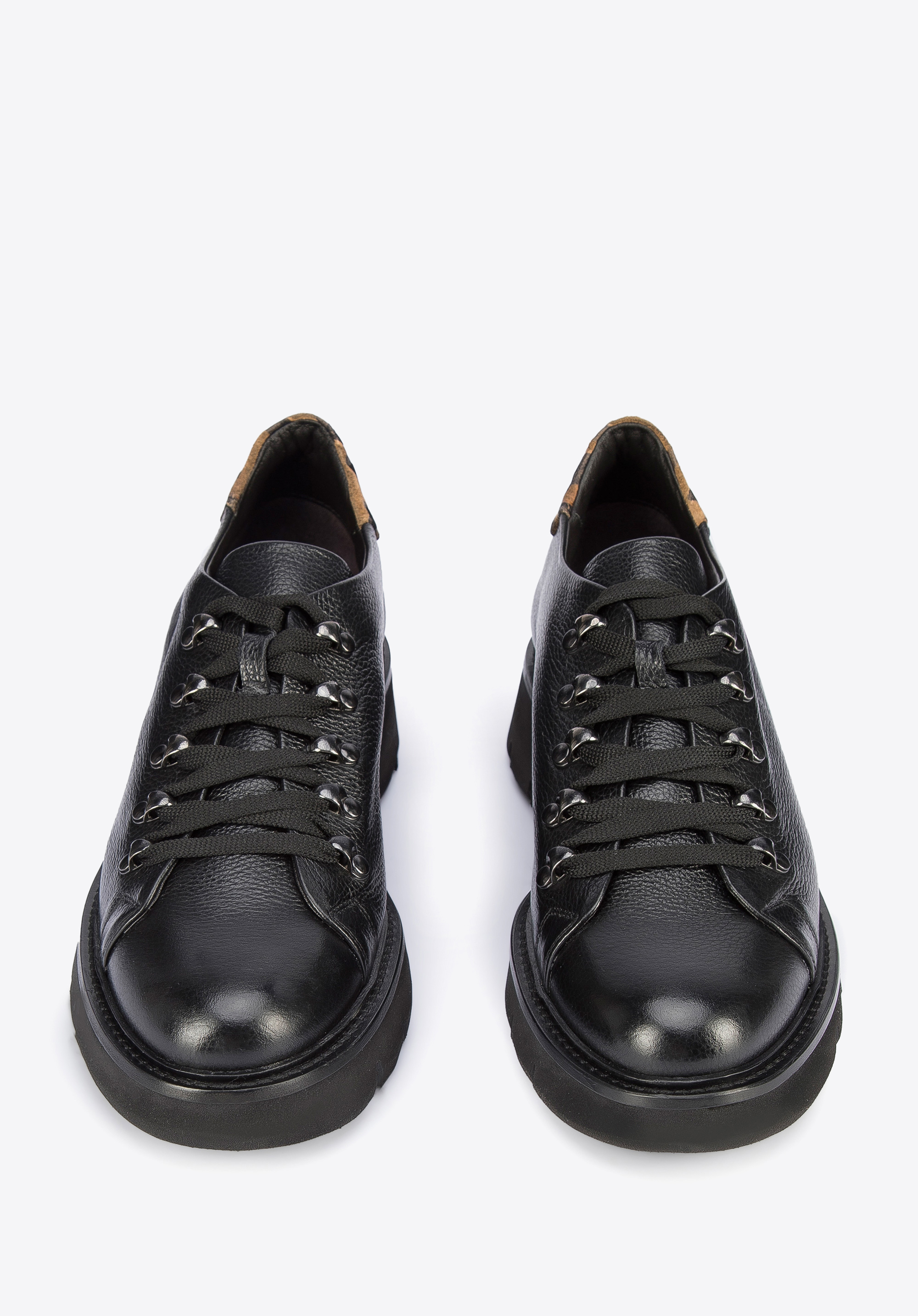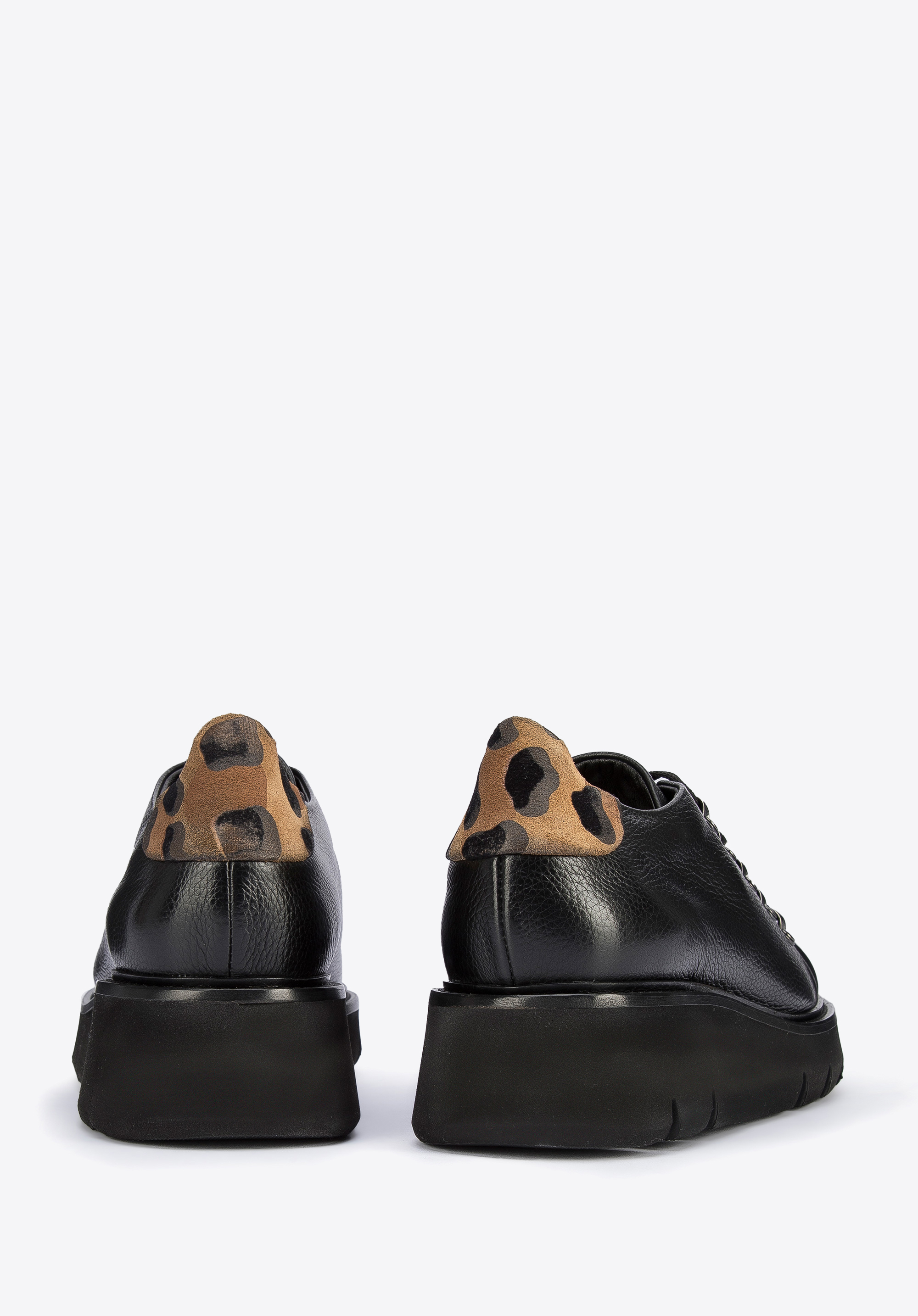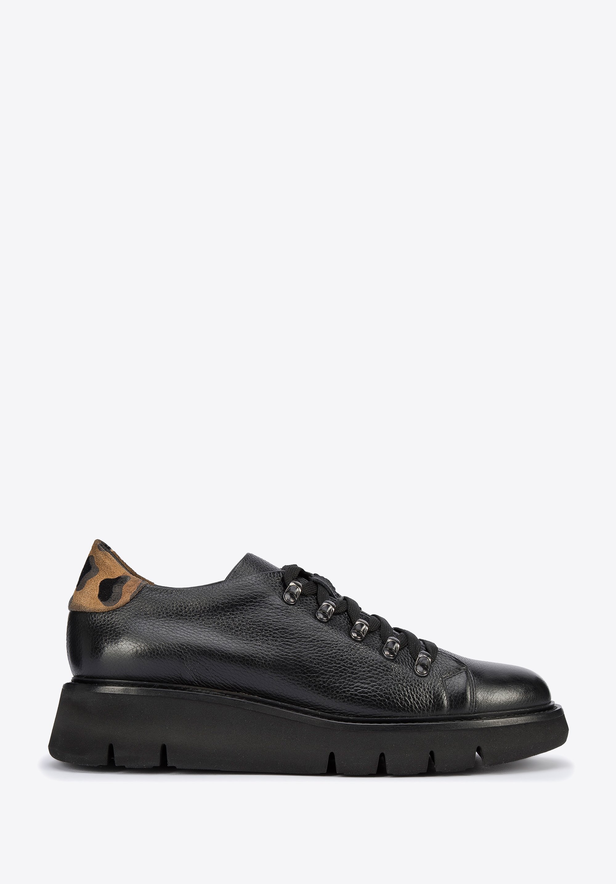 Te stylowe buty spodobają się miłośniczkom klasyki z twistem. Mają zapiętek ze skóry zamszowej w panterkę, który dodaje im pazura. Góra buta to prostota z odcieniem retro; nawiązuje do klasycznego obuwia turystycznego. Za to gruba, ale lekka platforma jest bardzo nowoczesna. Doda Ci także kilku centymetrów wzrostu. Półbuty wykonane zostały we Włoszech z wysokiej jakości groszkowanej skóry naturalnej. Możesz je nosić na co dzień zarówno do sztruksowych spodni i swetra, jak i do casualowych sukienek – każdej stylizacji dodadzą retro szyku. Damskie półbuty skórzane ze wstawką w panterkę mogą stać się Twoimi ulubionymi codziennymi butami.