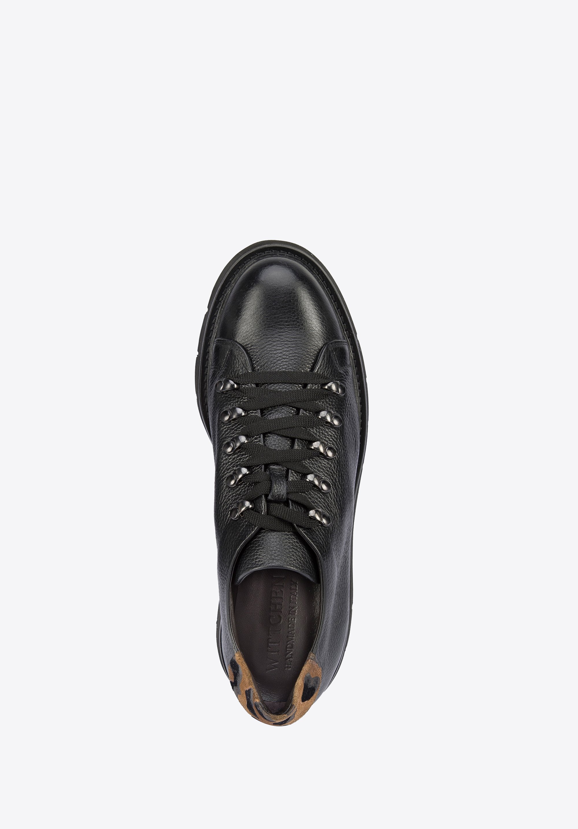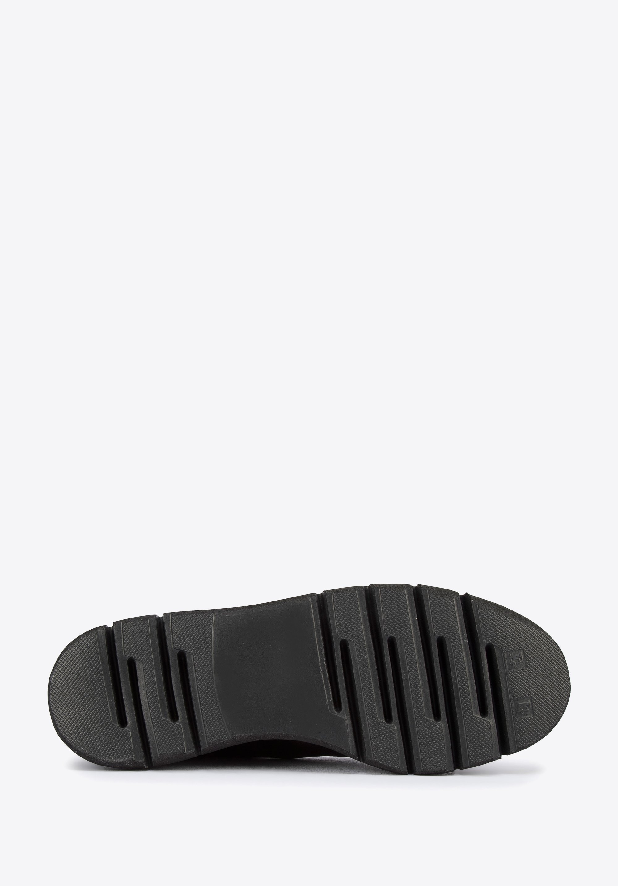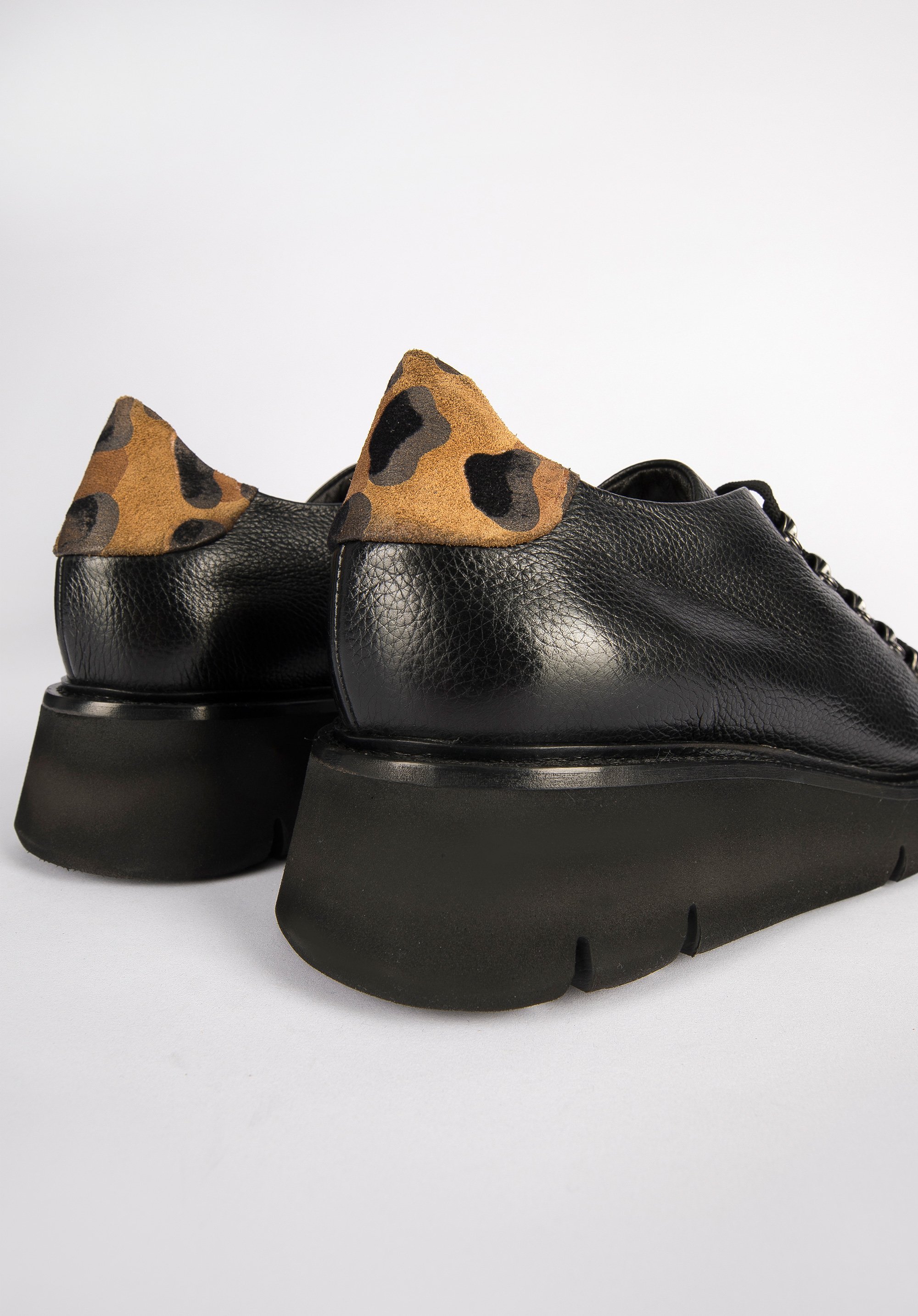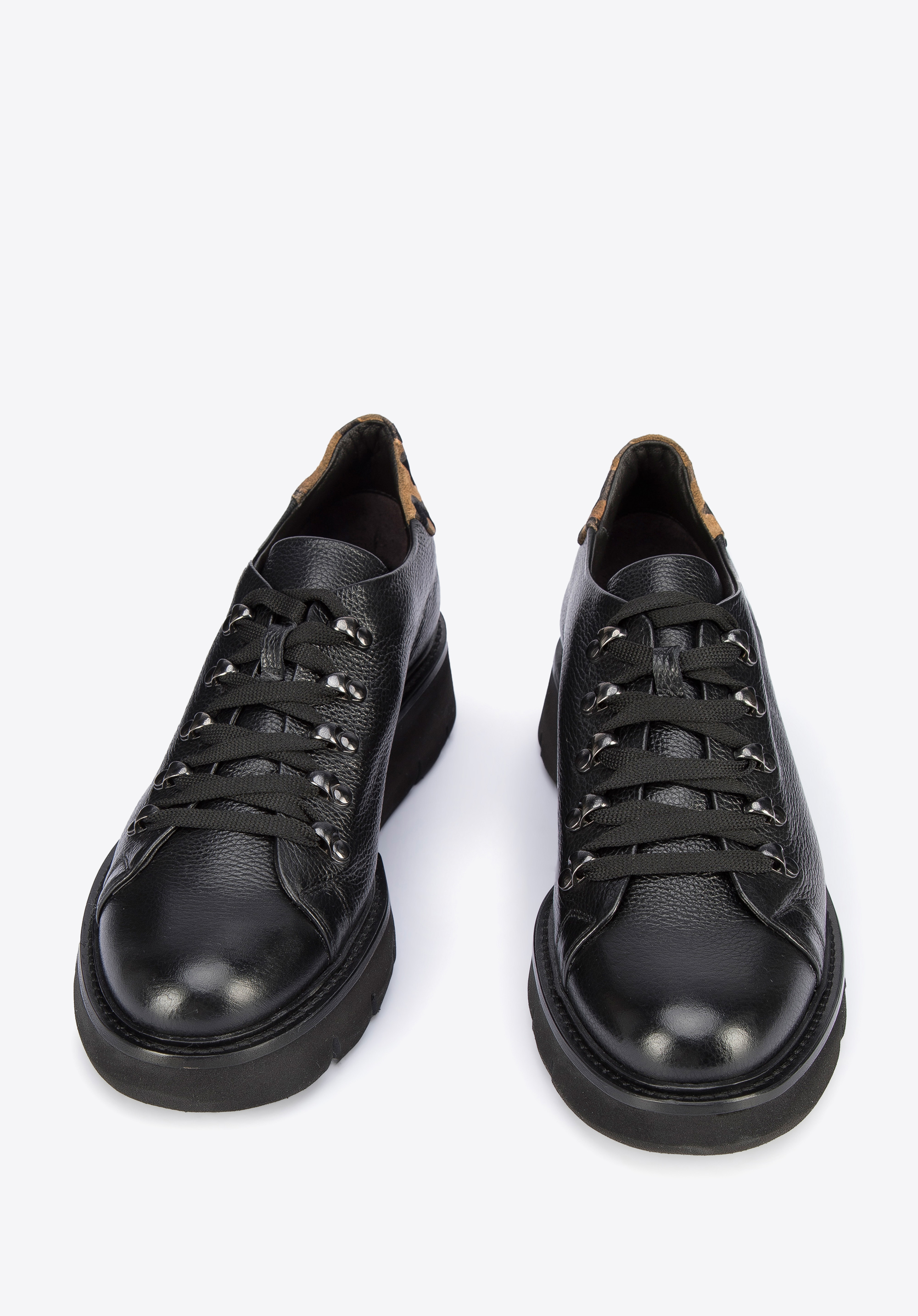 Te stylowe buty spodobają się miłośniczkom klasyki z twistem. Mają zapiętek ze skóry zamszowej w panterkę, który dodaje im pazura. Góra buta to prostota z odcieniem retro; nawiązuje do klasycznego obuwia turystycznego. Za to gruba, ale lekka platforma jest bardzo nowoczesna. Doda Ci także kilku centymetrów wzrostu. Półbuty wykonane zostały we Włoszech z wysokiej jakości groszkowanej skóry naturalnej. Możesz je nosić na co dzień zarówno do sztruksowych spodni i swetra, jak i do casualowych sukienek – każdej stylizacji dodadzą retro szyku. Damskie półbuty skórzane ze wstawką w panterkę mogą stać się Twoimi ulubionymi codziennymi butami.