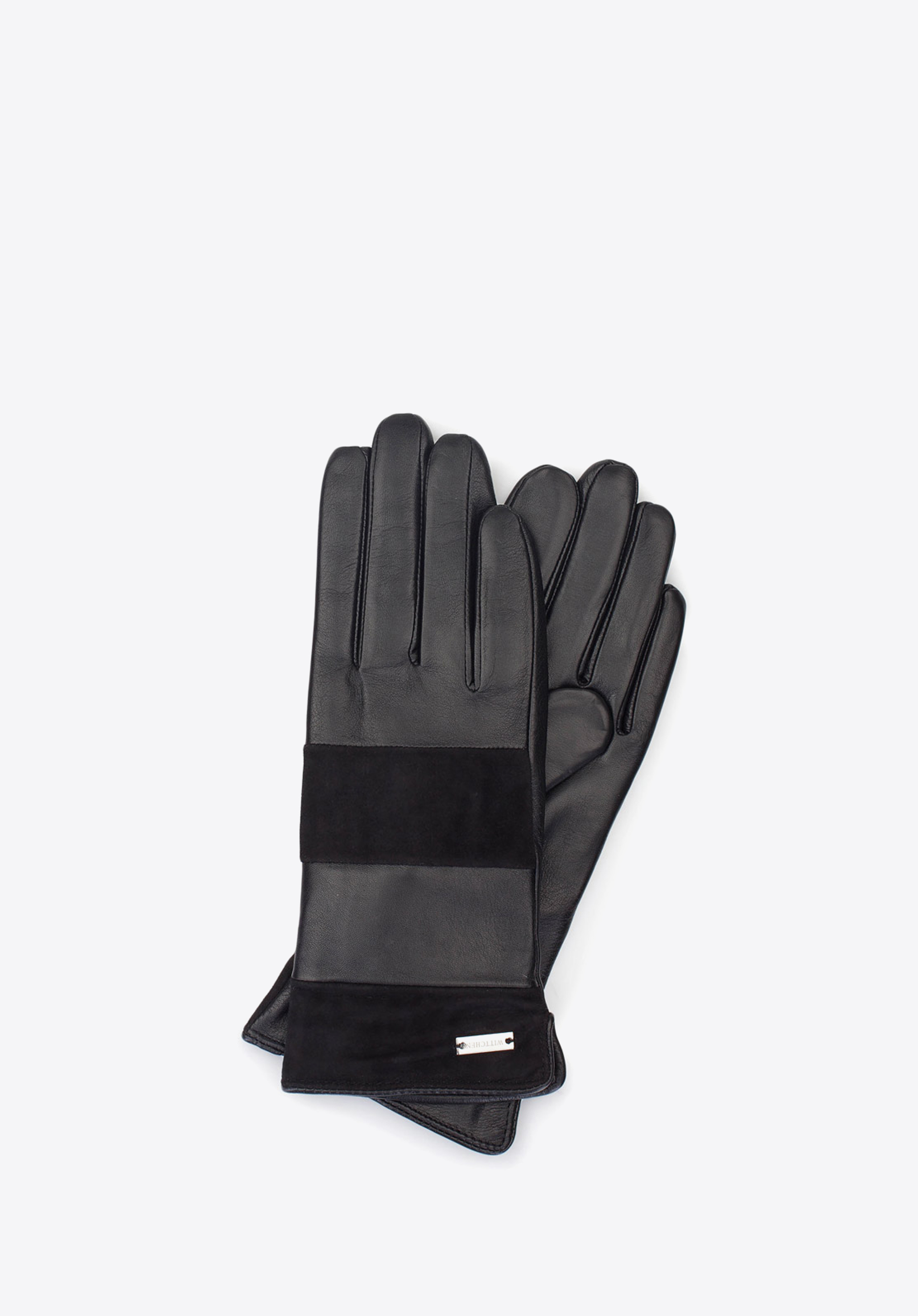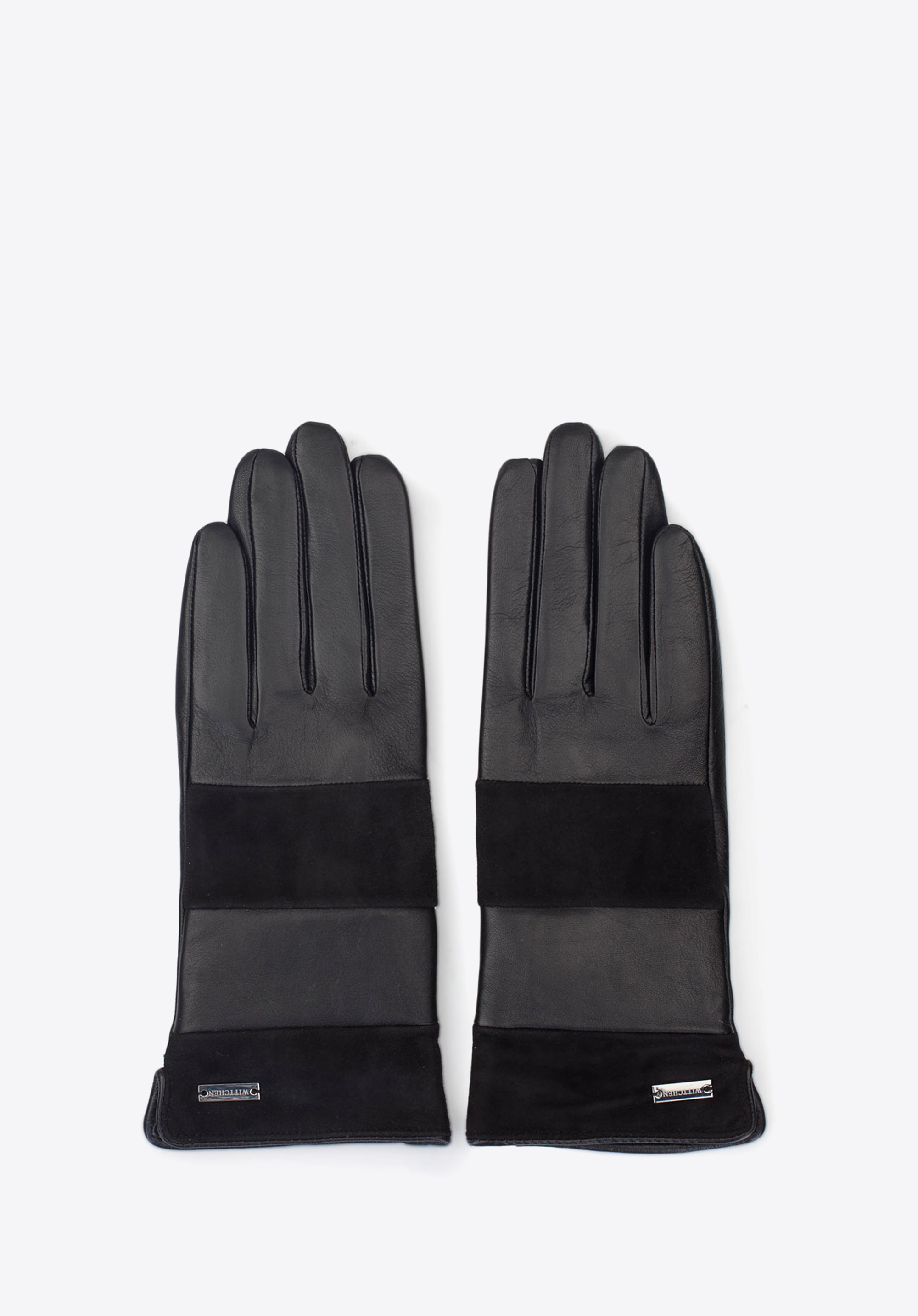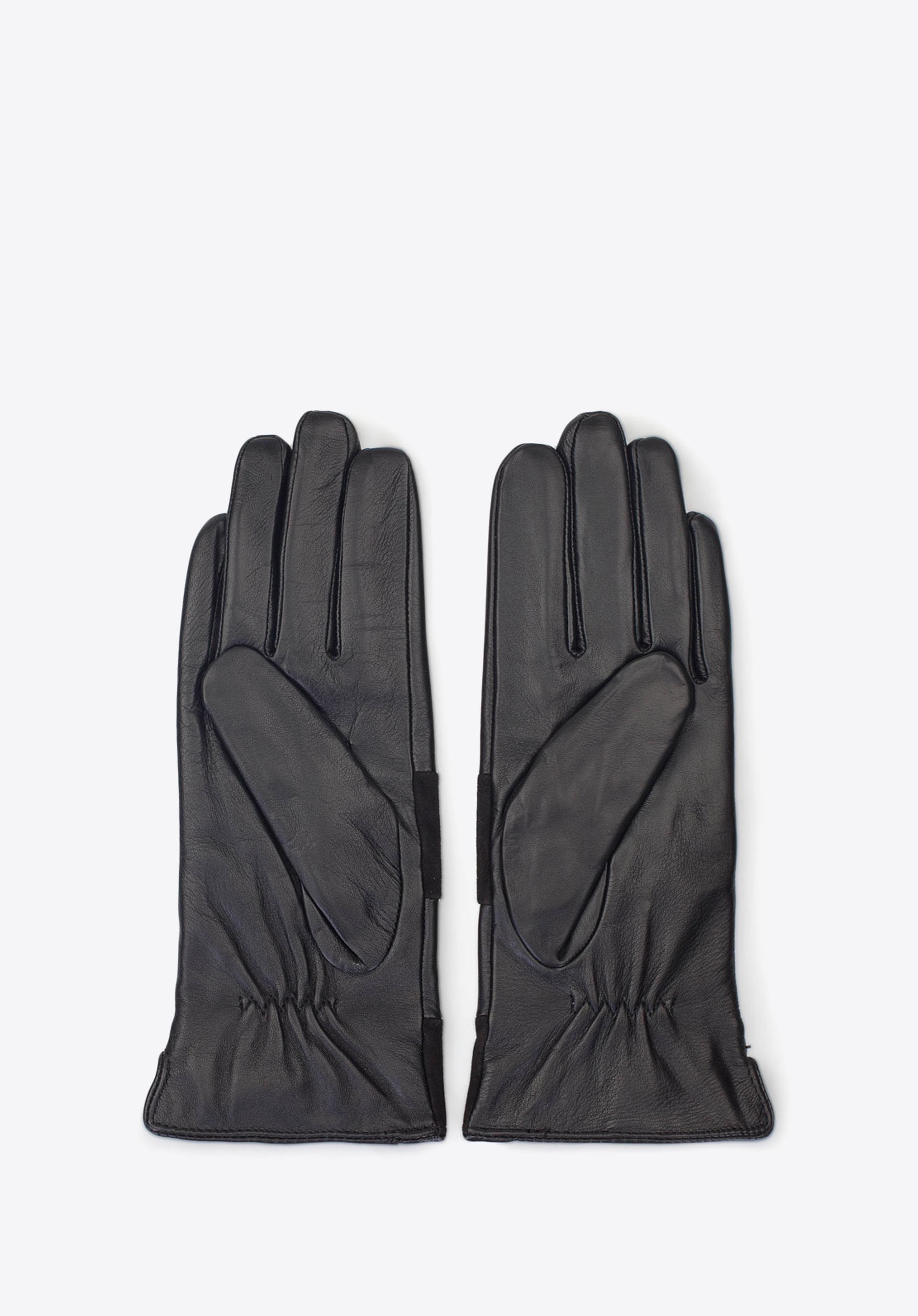 skóry owczej. Model z poziomymi wstawkami ze skóry zamszowej urzeka elegancją. Od wewnętrznej strony wszyto elastyczną gumkę, która dodatkowo optycznie wysmukla dłoń.