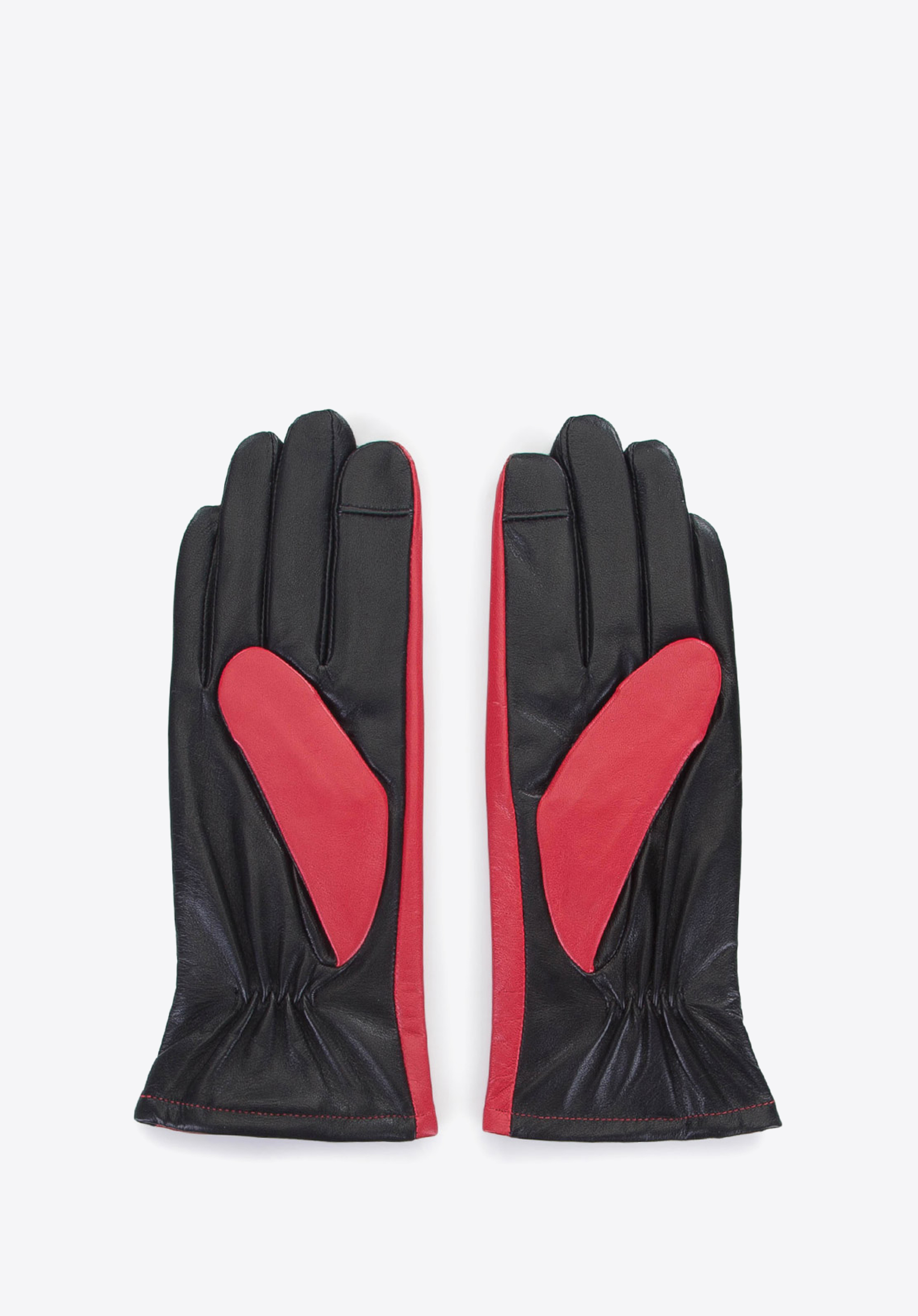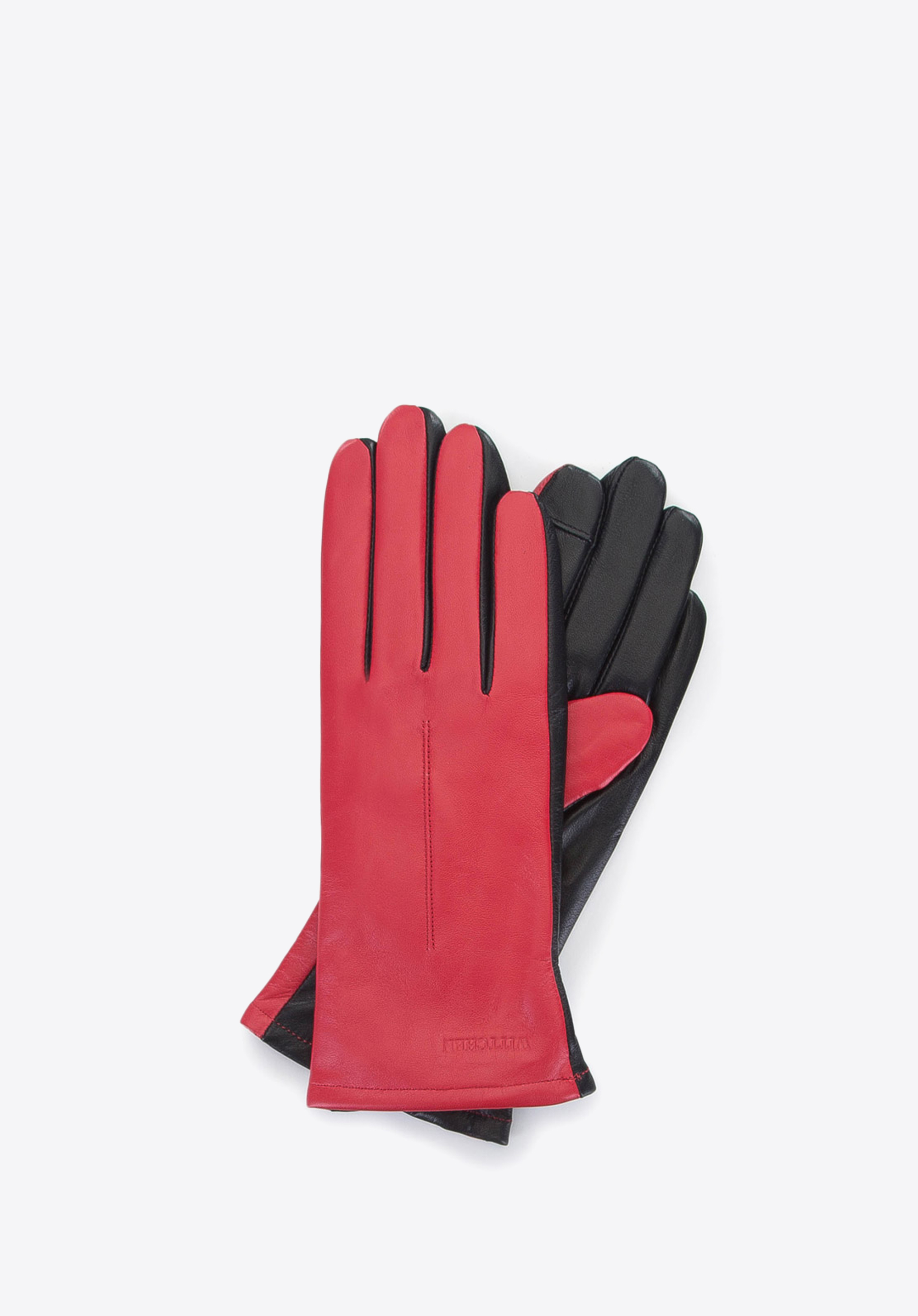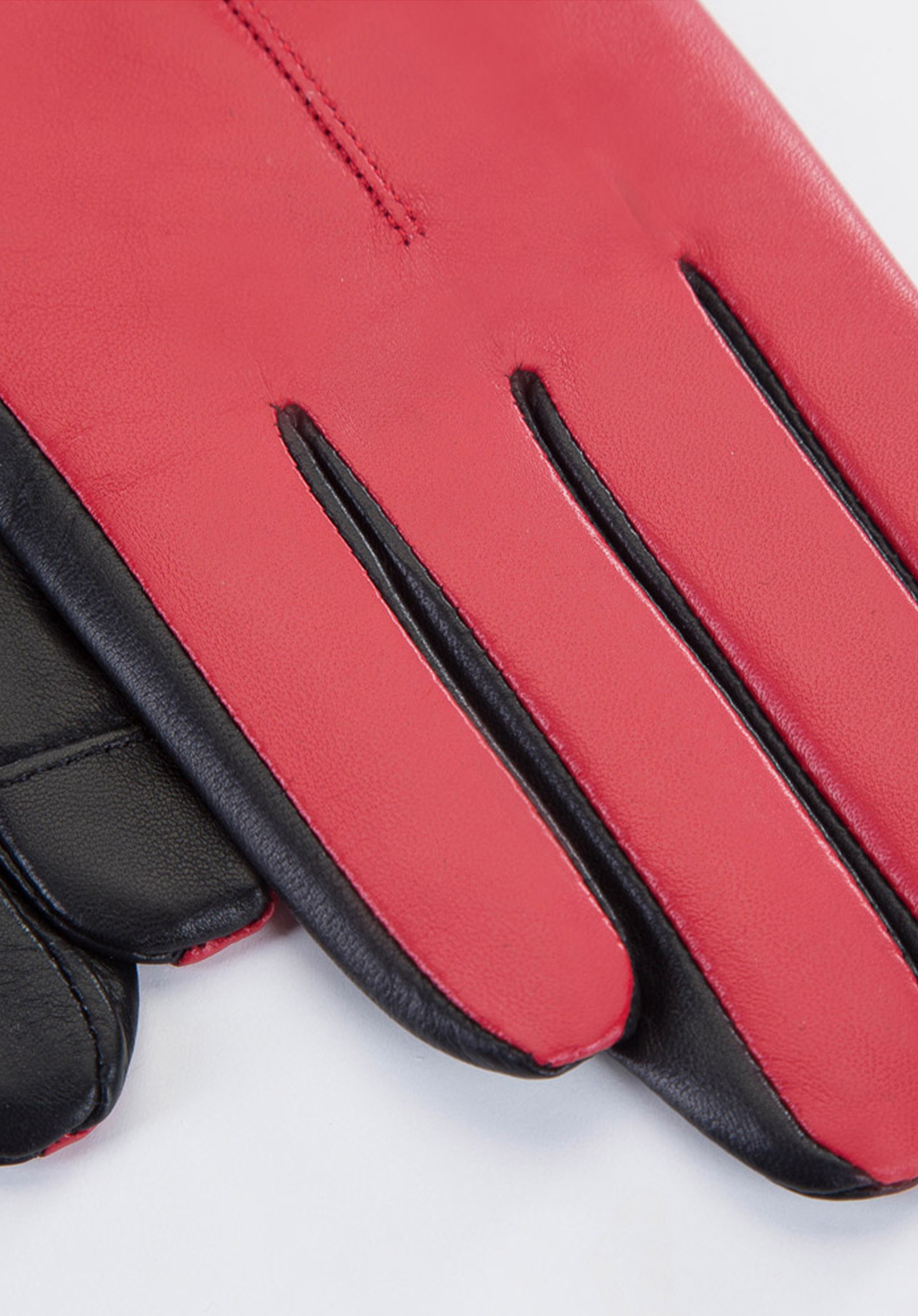 Rękawiczki o prostym fasonie w nieoczywistym ujęciu. Są uszyte z wysokiej jakości skóry naturalnej w dwóch kolorach, innym na wierzchniej stronie i kontrastującym od spodu. Dodatkowo na wierzchu dłoni mają krótkie przeszycie. Wkładanie ułatwi Ci ściągacz wszyty od dołu. Te rękawiczki z dwóch kolorów skóry to niezastąpiony dodatek w damskiej garderobie. Będzie Ci w nich ciepło w ręce, a do tego perfekcyjnie wykończą cały strój.