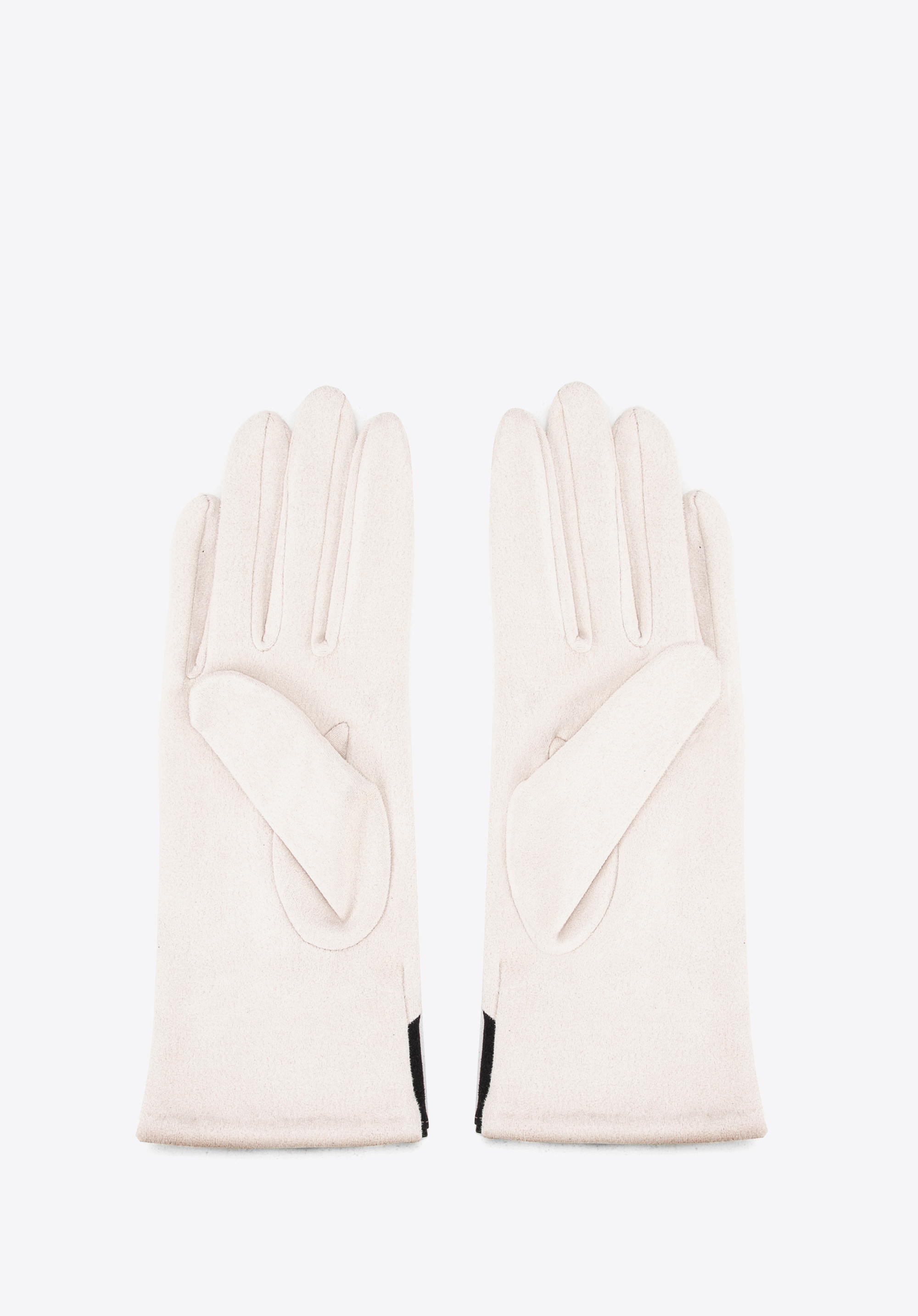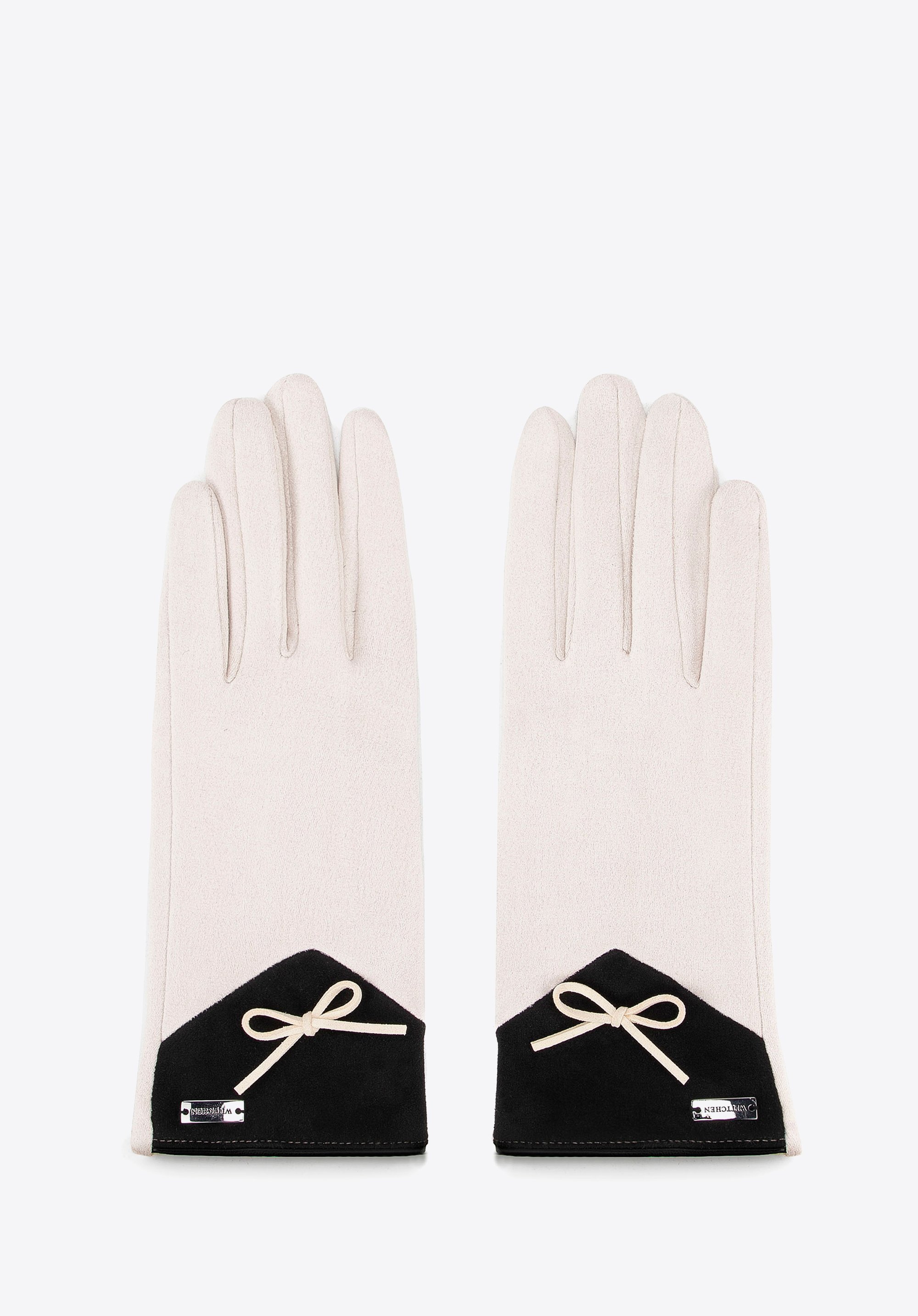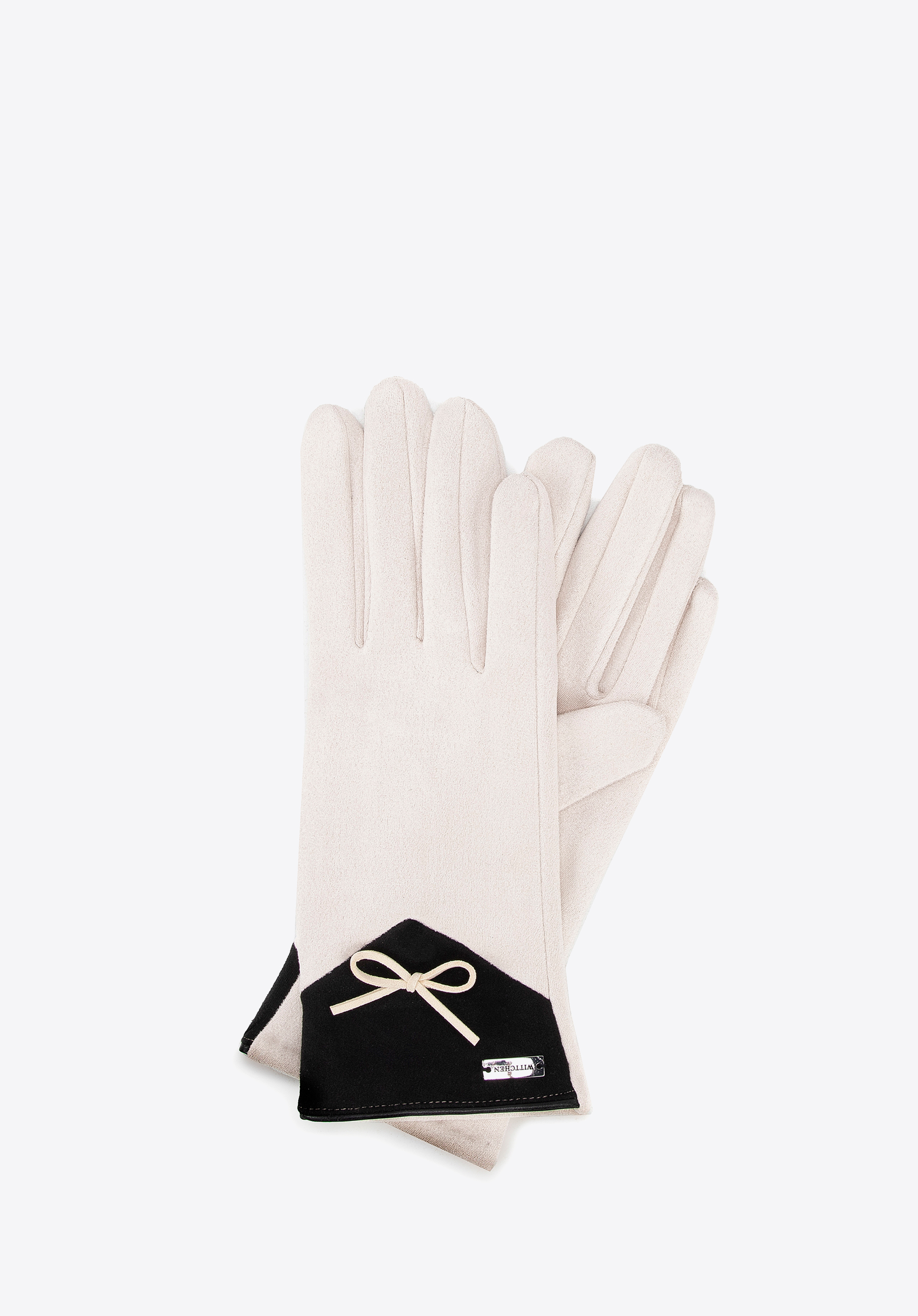 Damskie rękawiczki z kokardą dopełnią stylizacje na co dzień i na bardziej eleganckie wyjścia, gdy chcesz dodać dłoniom subtelnej finezji. Lekki, elastyczny materiał wygodnie dopasowuje się do dłoni, a kokarda i kontrastowe akcenty tworzą efekt dopracowanego detalu.