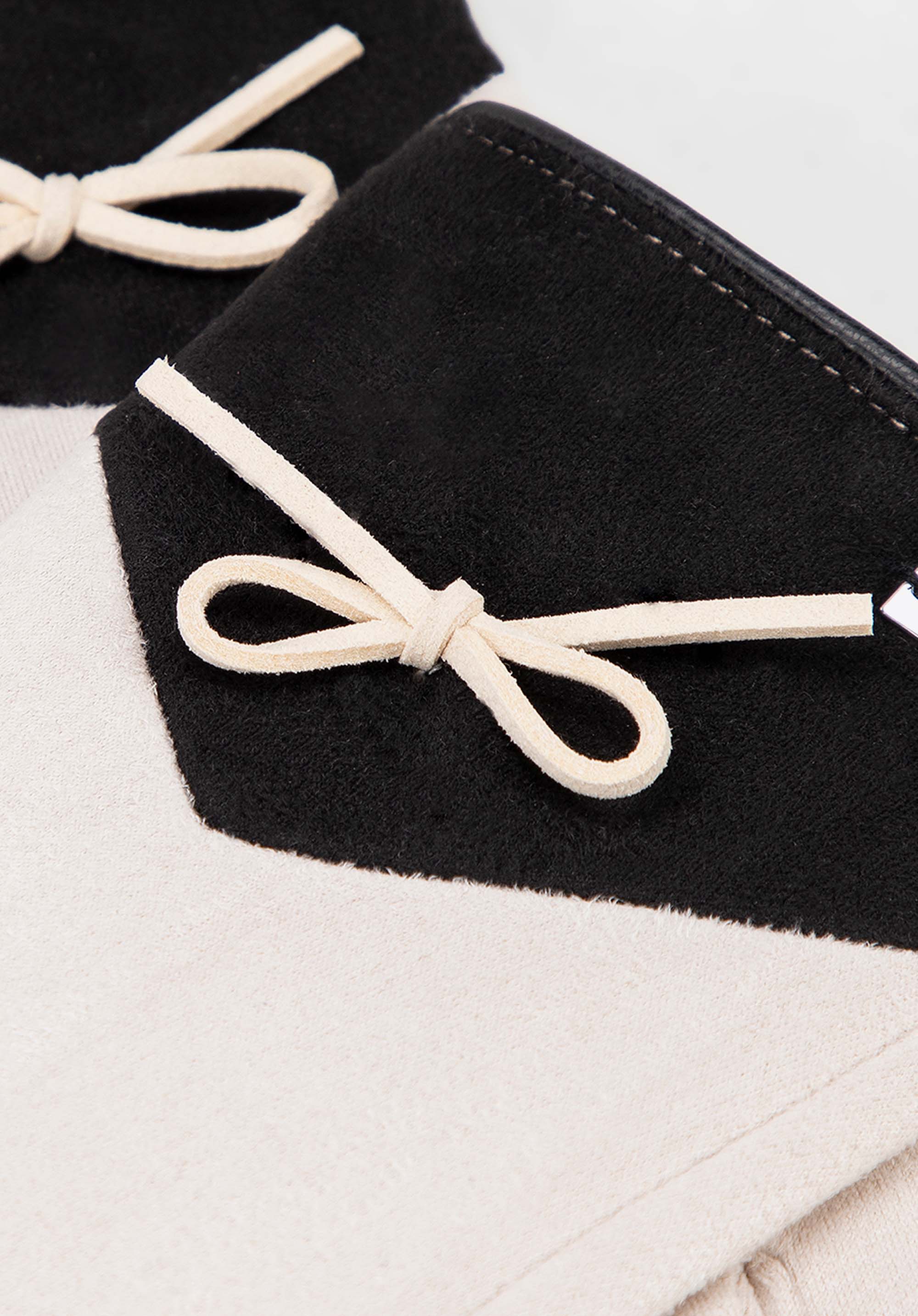 - Estetyczne detale: Dekoracyjna kokarda oraz kontrastowe kolory rękawiczek dodają im unikalnego charakteru i stylu. Te subtelne detale przyciągają wzrok, podkreślając indywidualność i elegancję. Dzięki nim rękawiczki wyróżniają się na tle innych akcesoriów, stanowiąc efektowny dodatek do każdej stylizacji i dodając jej odrobinę luksusu.