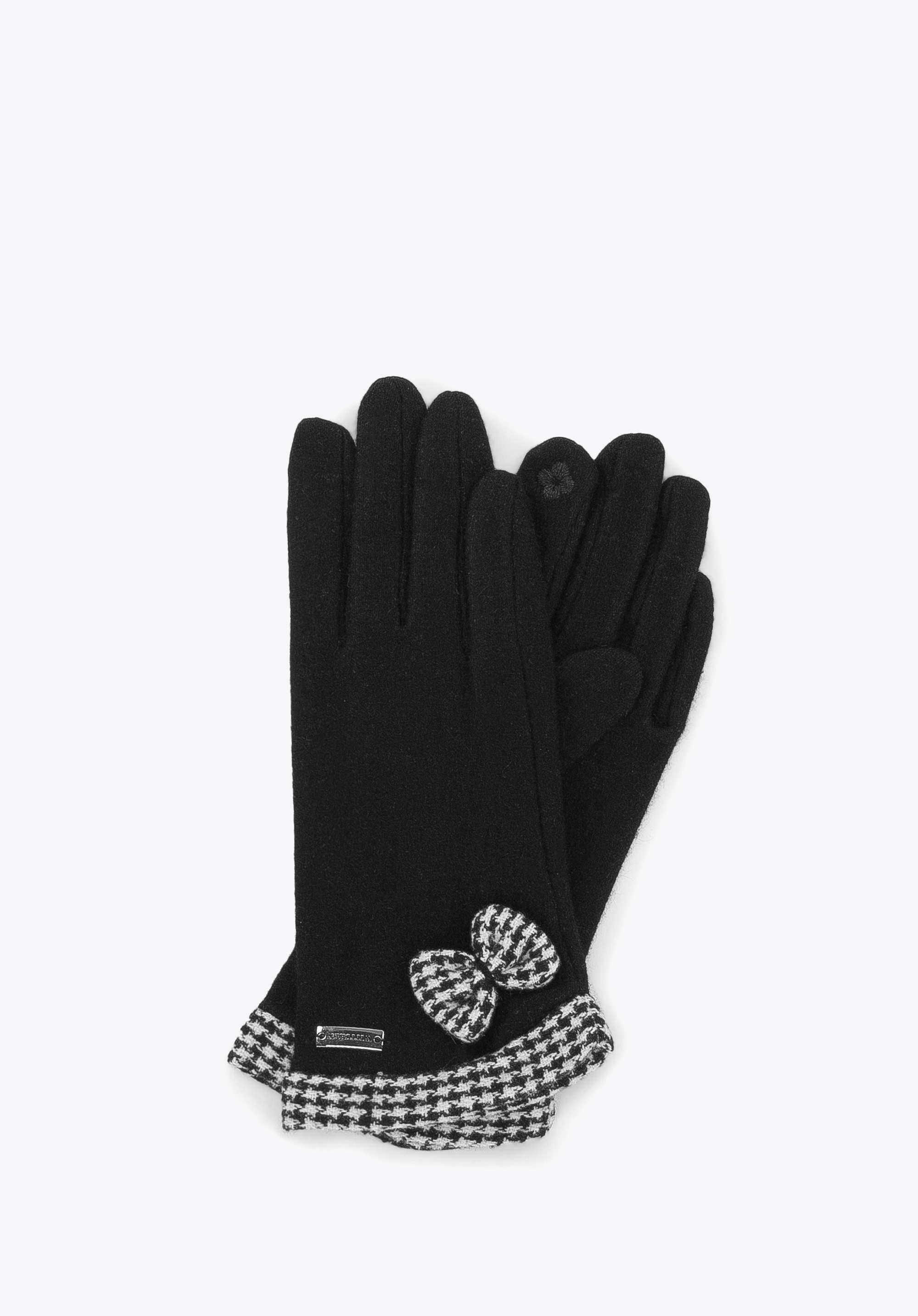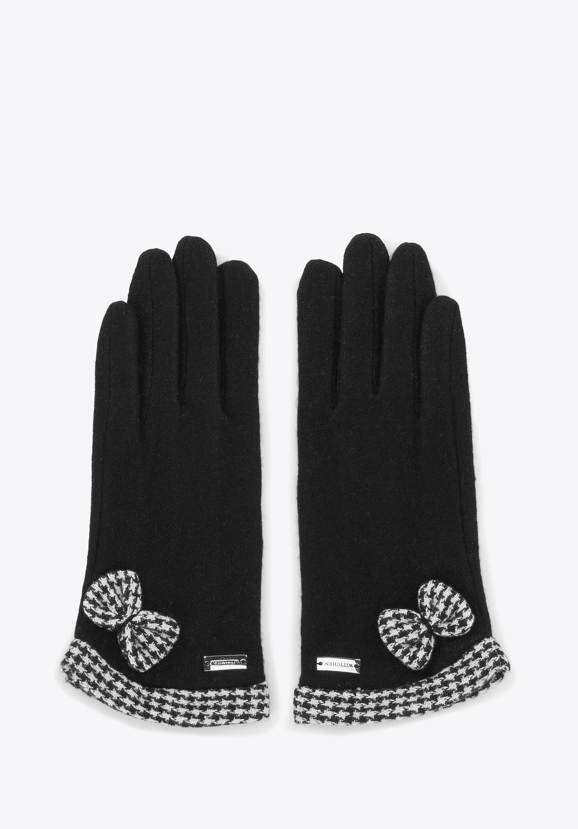 Eleganckie i stylowe damskie rękawiczki na chłodniejsze dni. Wykonane są w 70% z wełny, która zapewni ciepło Twoim dłoniom. Klasyczny wzór w pepitkę na kokardce i przy nadgarstku ożywia całość i dodaje im szyku. Specjalny haft pod palcem wskazującym umożliwi obsługę ekranów dotykowych bez konieczności zdejmowania rękawiczki. Będą świetnie wyglądały zestawione z eleganckimi gładkimi płaszczami. Damskie rękawiczki z kokardą w pepitkę to idealny pomysł na prezent dla każdej eleganckiej kobiety.