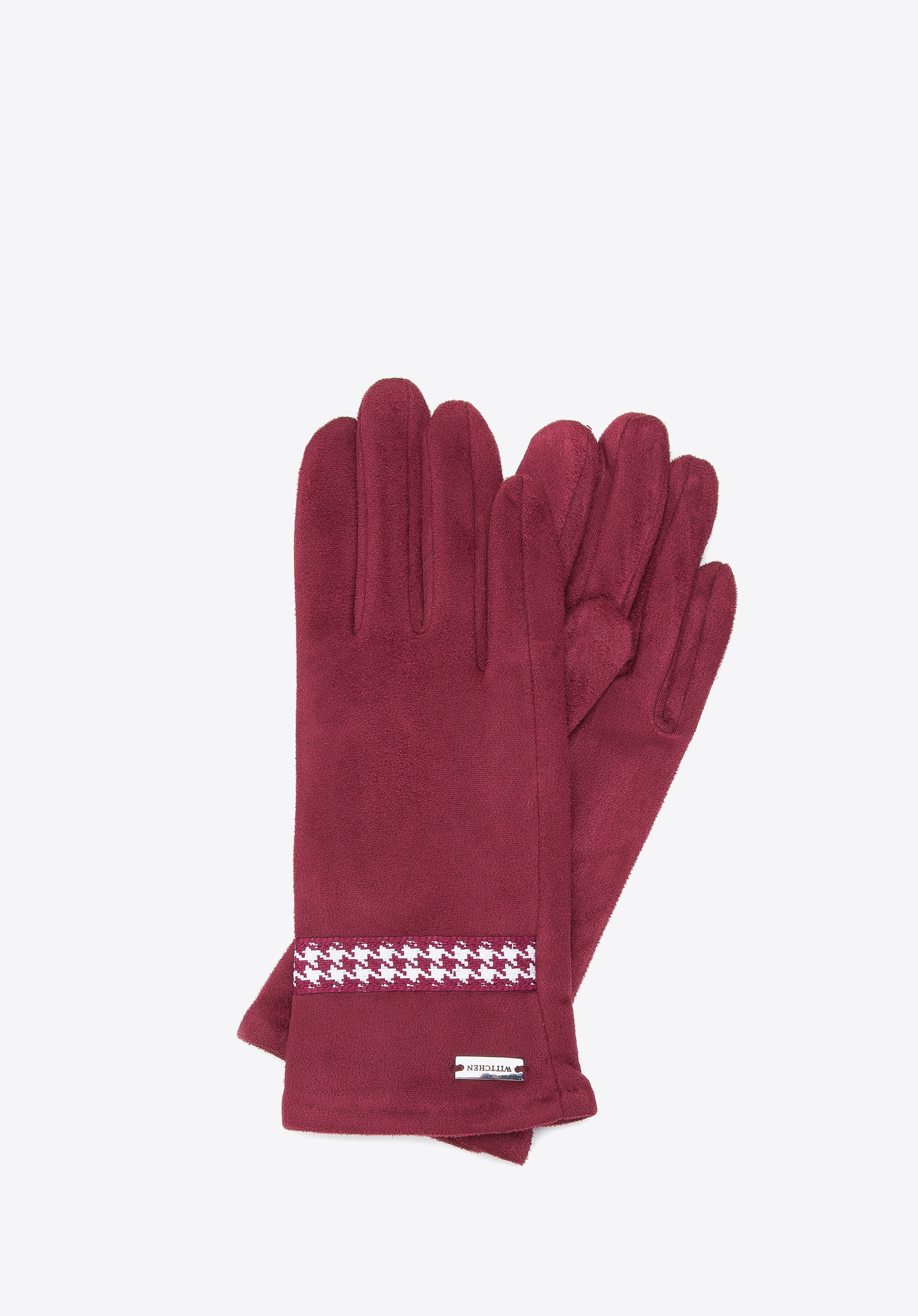 Damskie rękawiczki z wykończeniem w pepitkę dopełnią codzienne stylizacje w duchu klasycznej elegancji, szczególnie w zestawie z płaszczem o skróconym rękawie lub skórzaną ramoneską. Miękkie, zamszowe w dotyku tworzywo oraz dekoracyjny pasek w pepitkę nadają im wyrafinowanego charakteru i zapewniają komfort noszenia przez cały dzień.