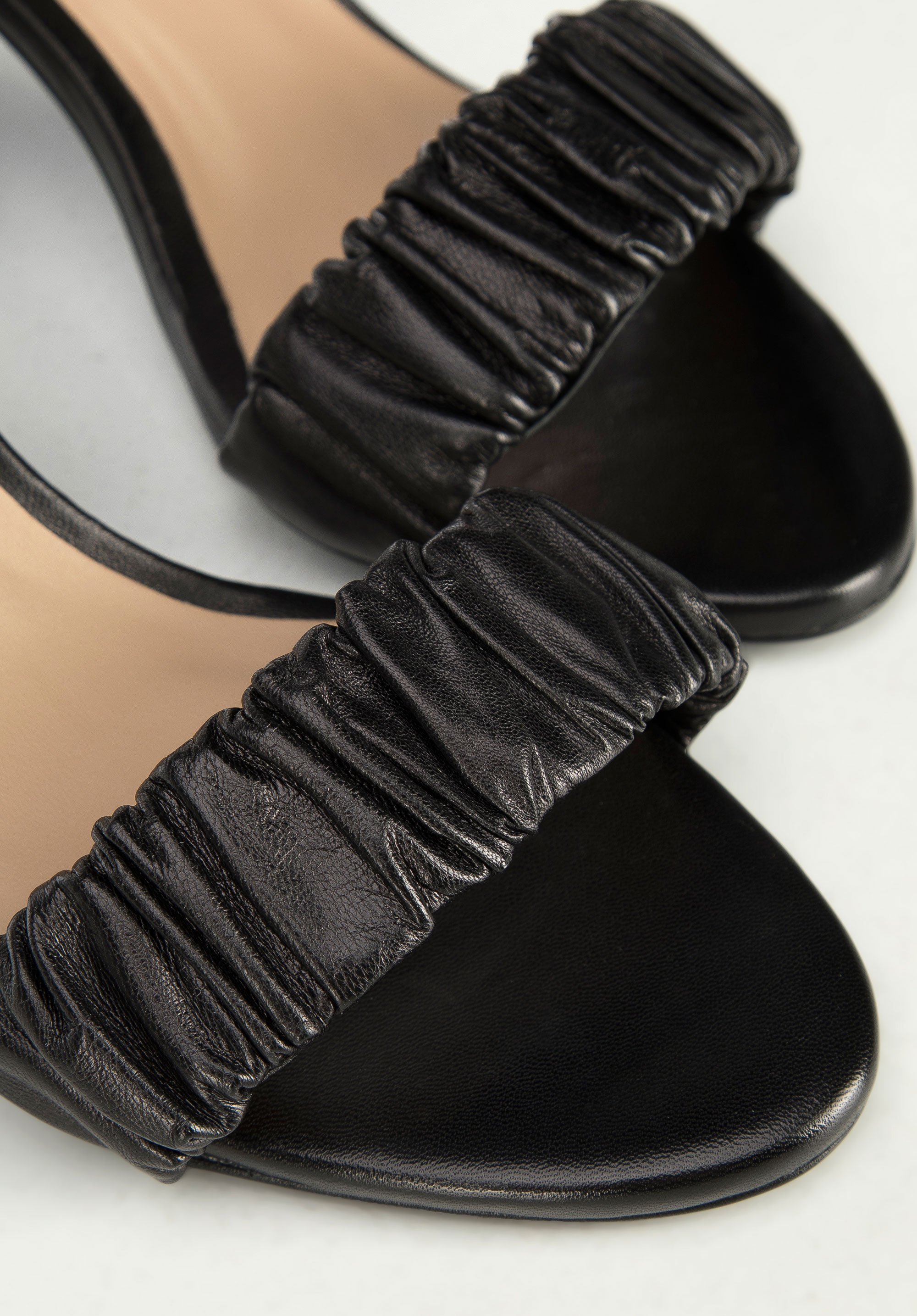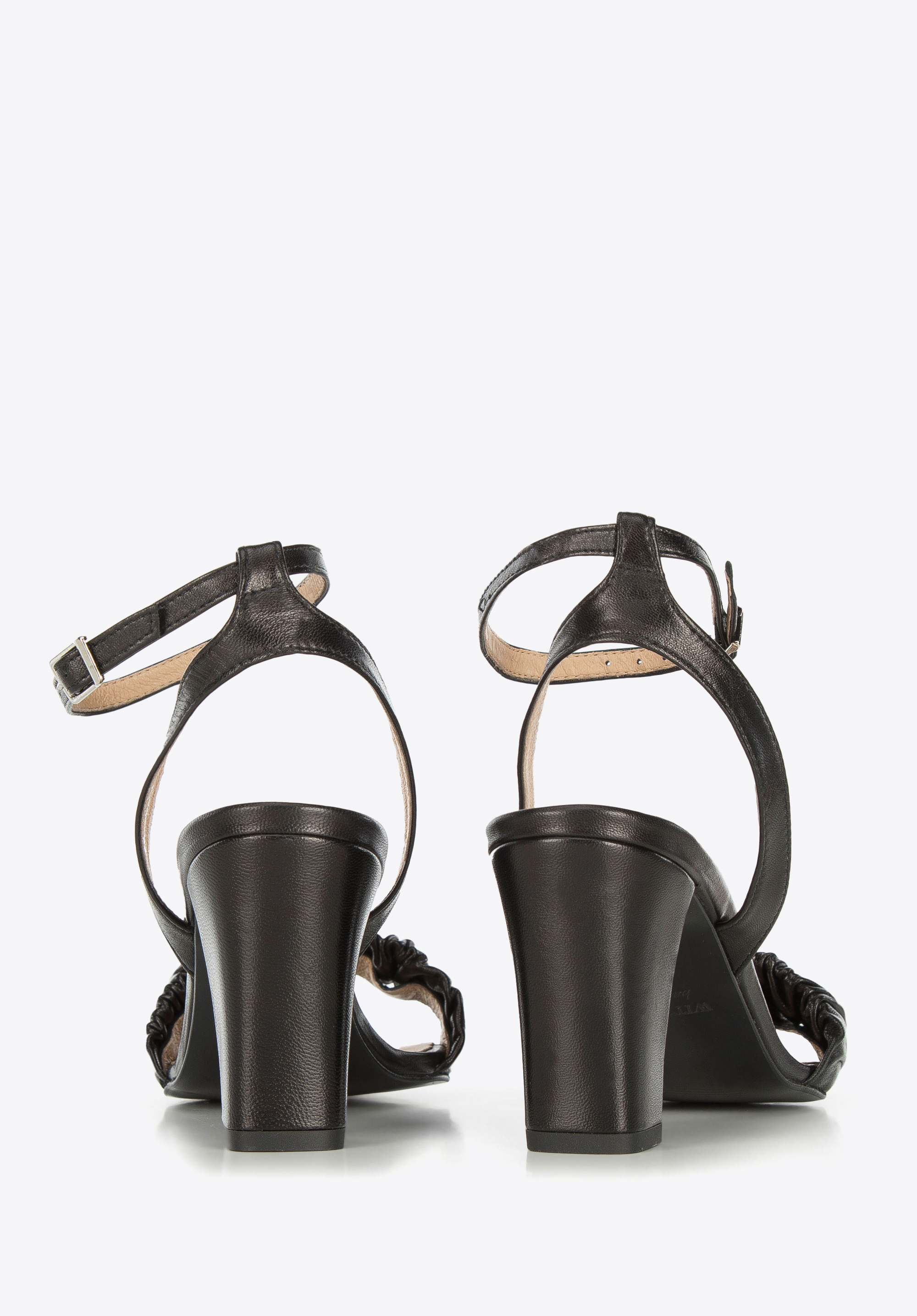 Obcas jest dość wysoki, ale wygodny: ładnie wysmukli Twoją sylwetkę i umożliwi przechodzenie w tych butach wiele godzin. Ten zgrabny model założysz i do zwiewnej sukienki, i do dżinsów z marynarką. Damskie sandały z marszczonej skóry z na słupku to kobiecy dodatek na każdą wyjątkową okazję.