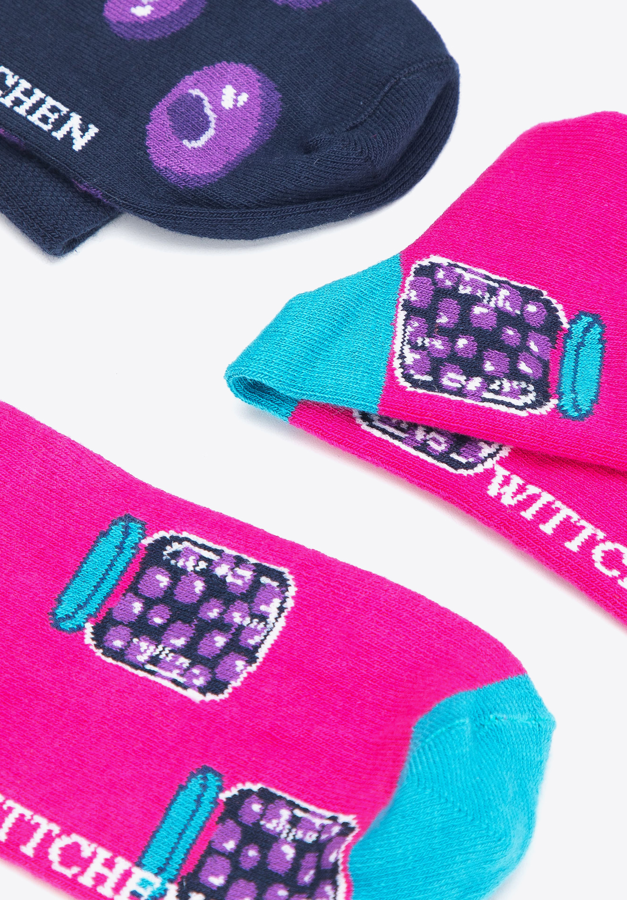 Zestaw składa się z dwóch różnych par we wzór w jagody: granatowe dopasujesz do każdego stroju i stylowo go dopełnisz, a skarpetki w kontrastowym różowo-niebieskim kolorze, to świetny wakacyjny dodatek na każdy dzień. Uszyte zostały