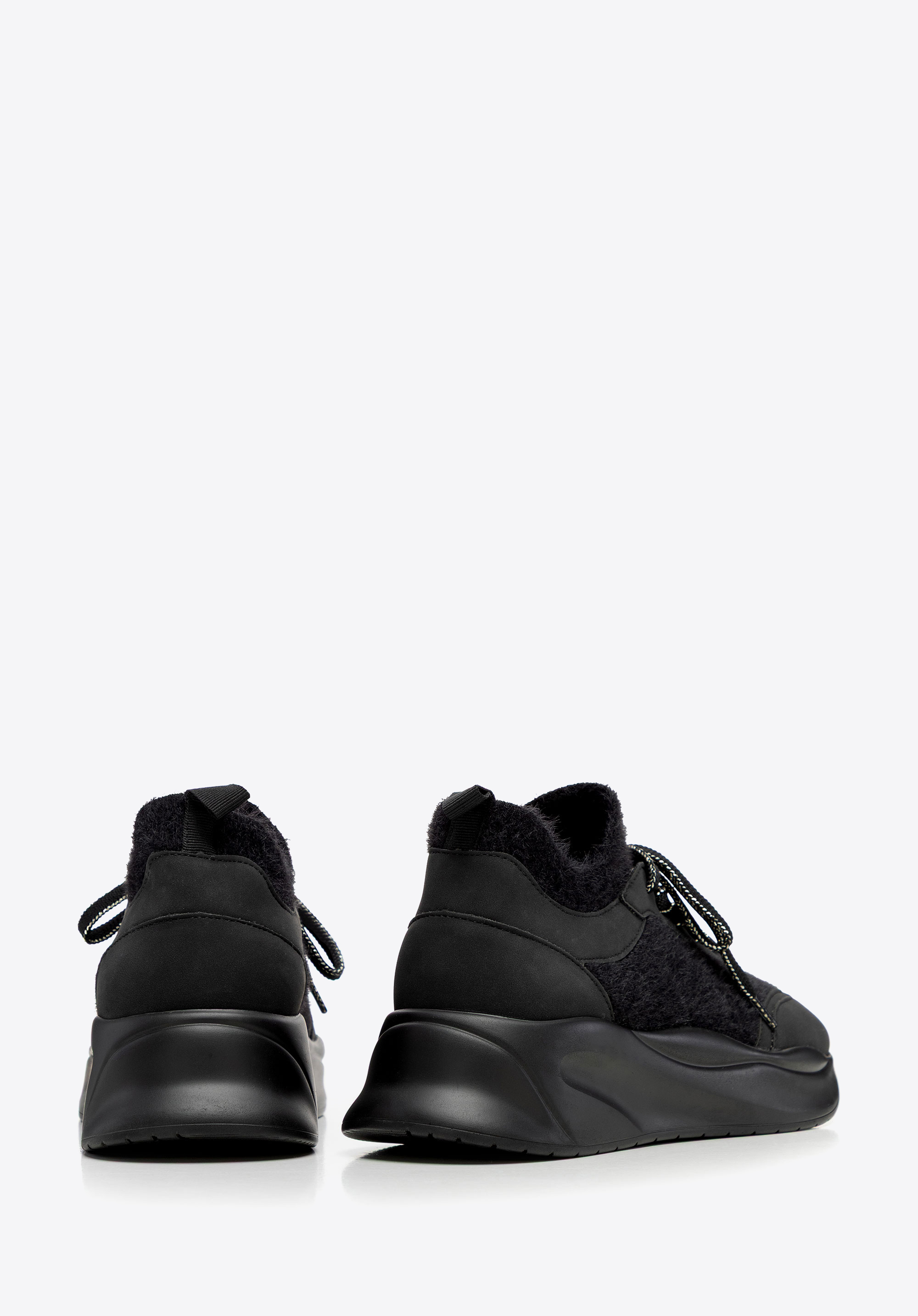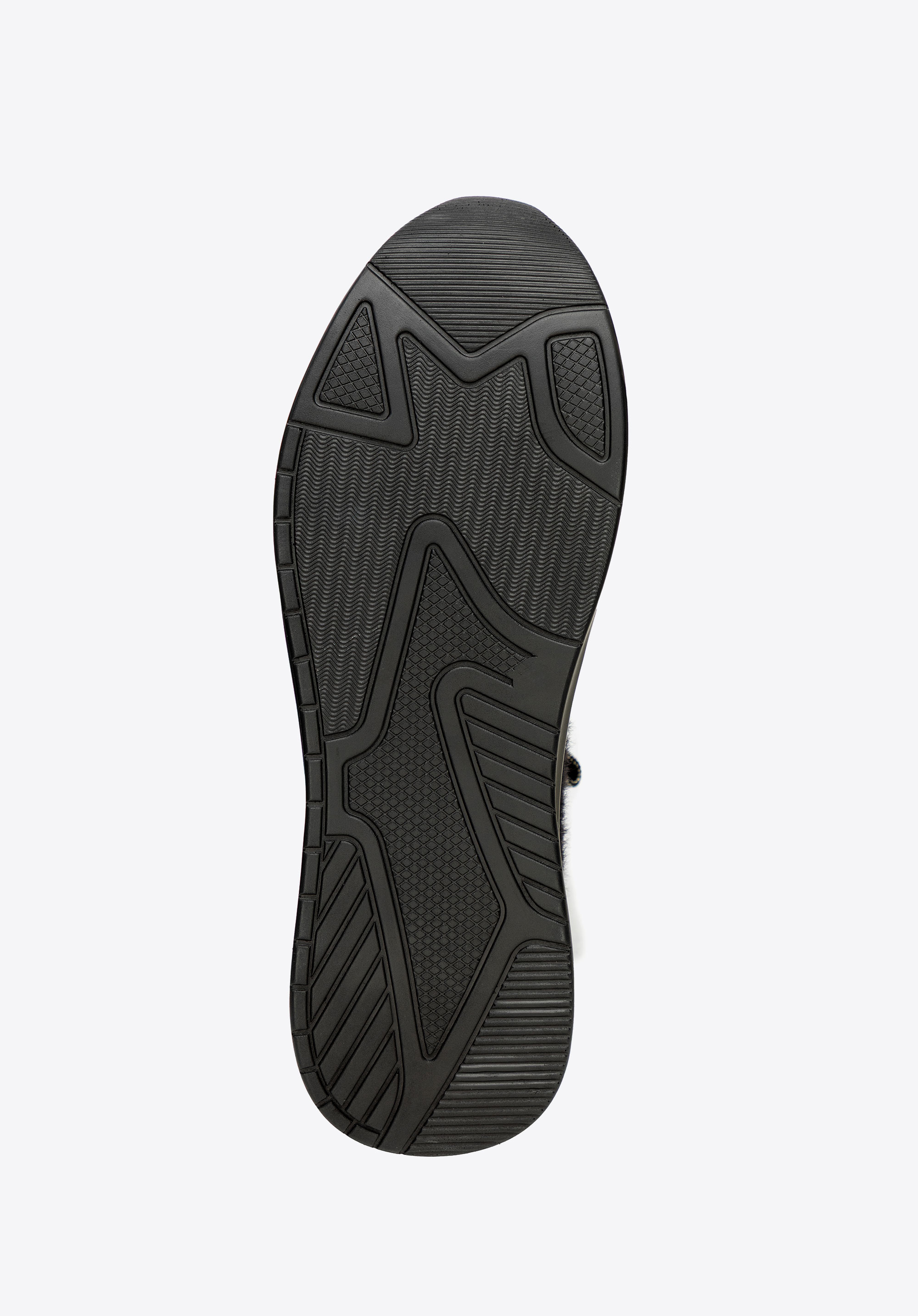 Postaw na połączenie modnego designu z wygodą noszenia. Te damskie sneakersy wykonane zostały z ekoskóry oraz syntetycznego futerka, które nadaje im przytulny i oryginalny charakter. Okrągły nosek zapewnia klasyczny, uniwersalny wygląd, a wsuwany fason delikatnie przytrzymuje stopę, łącząc praktyczność z miejskim stylem.