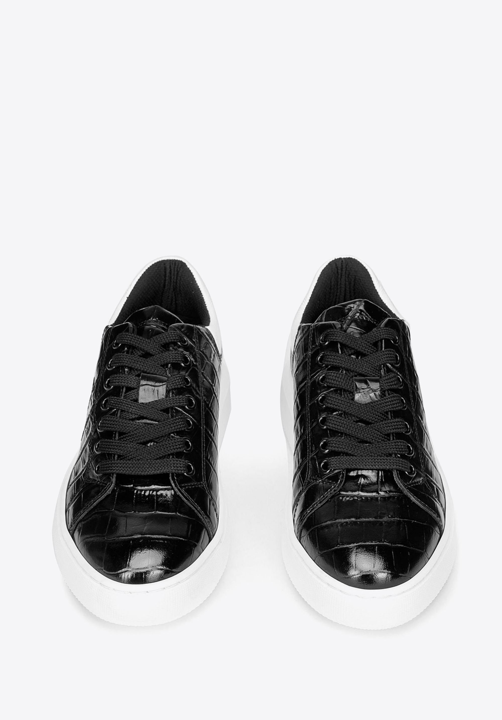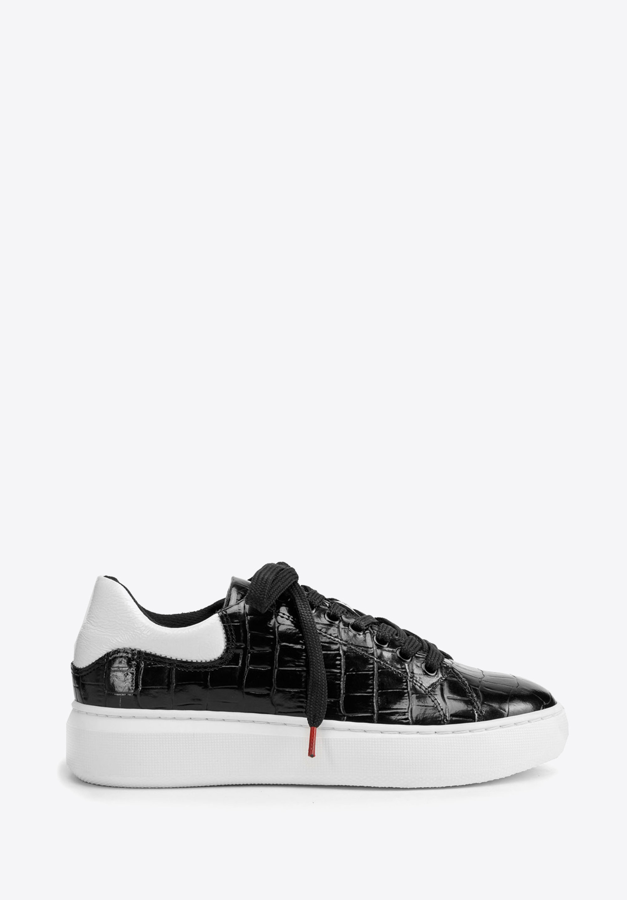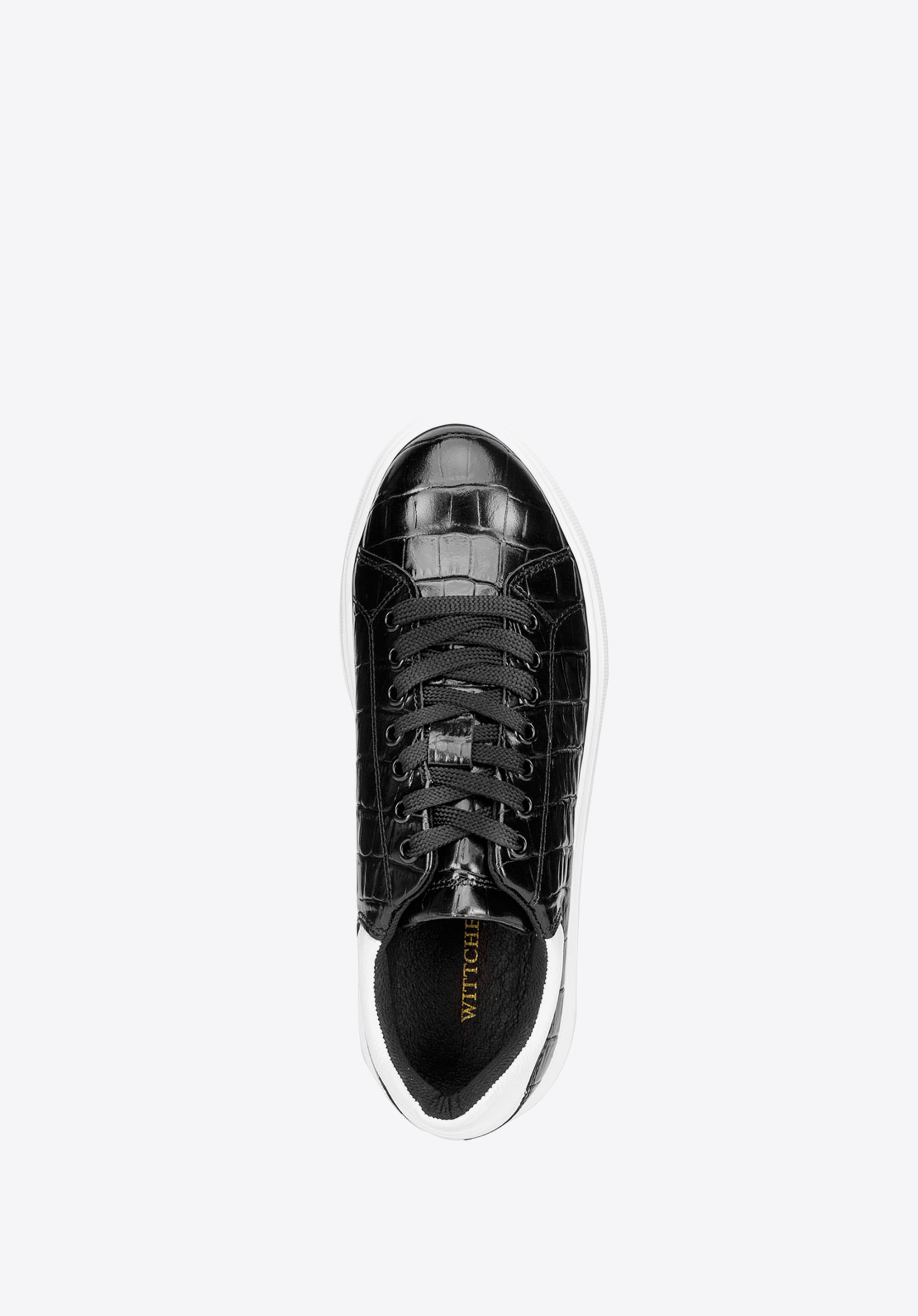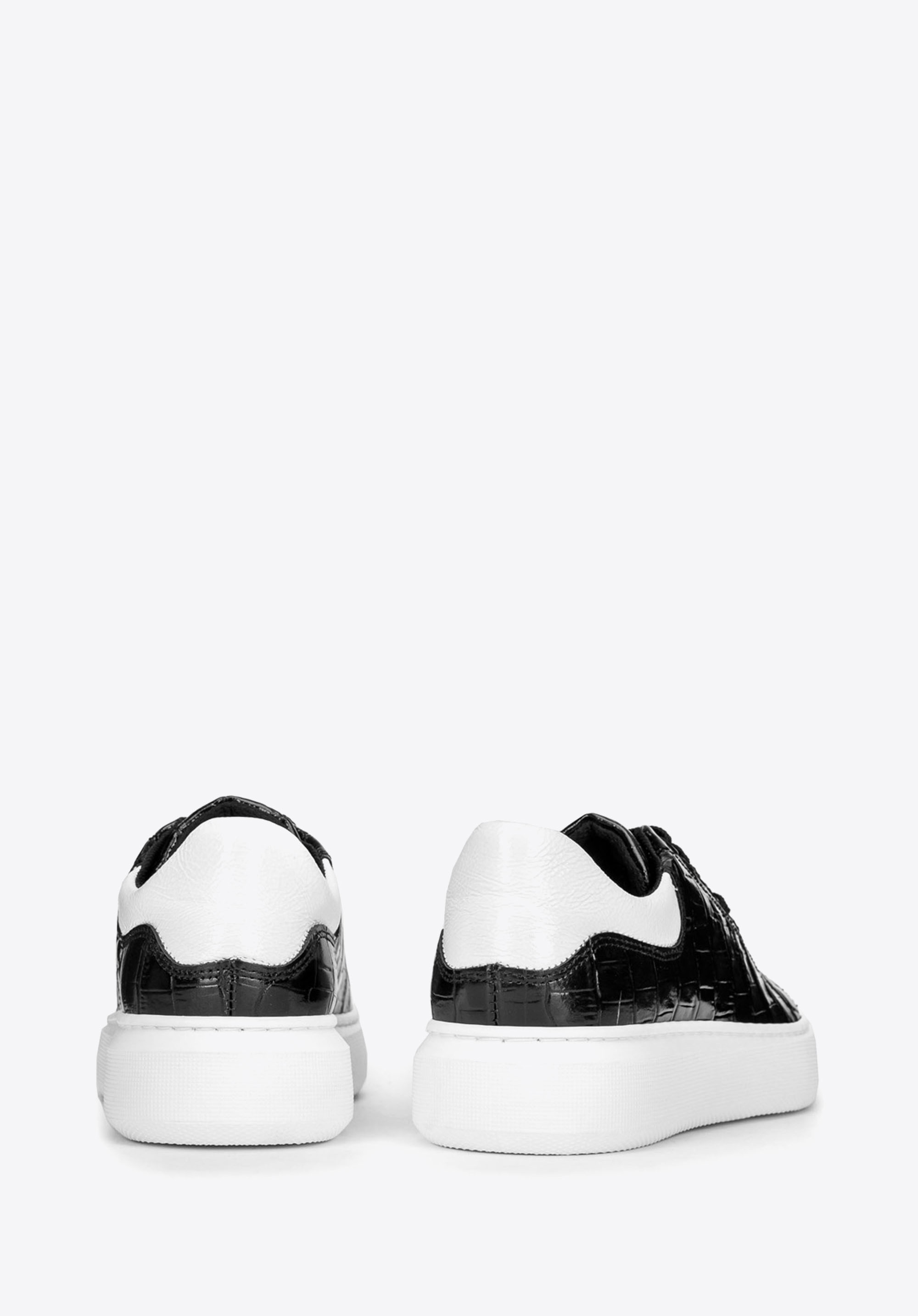 Damskie sneakersy z lakierowanej skóry o krokodylej fakturze czarno-białe