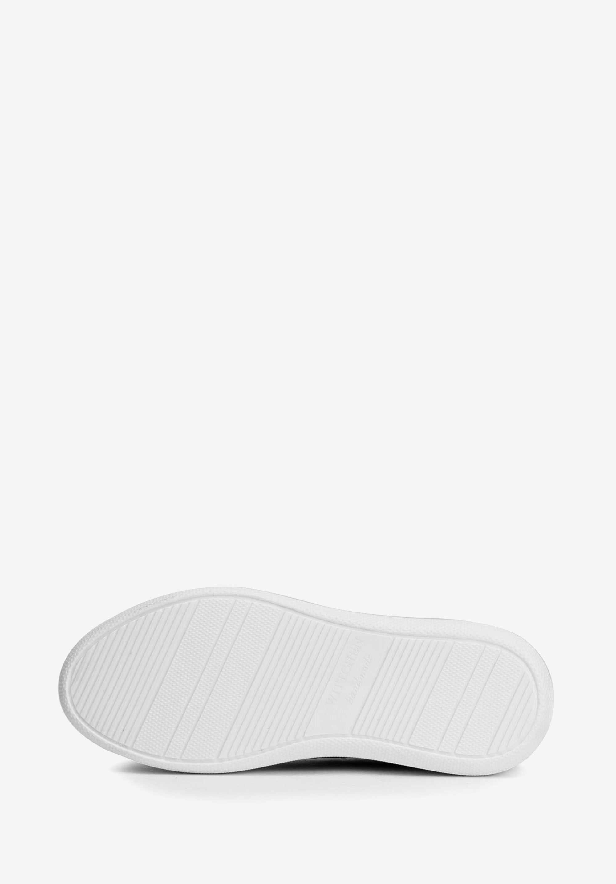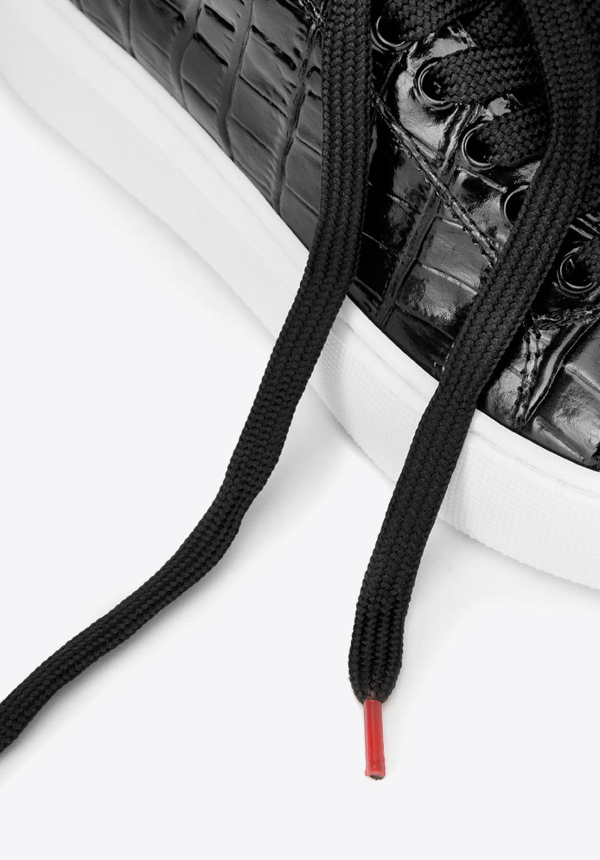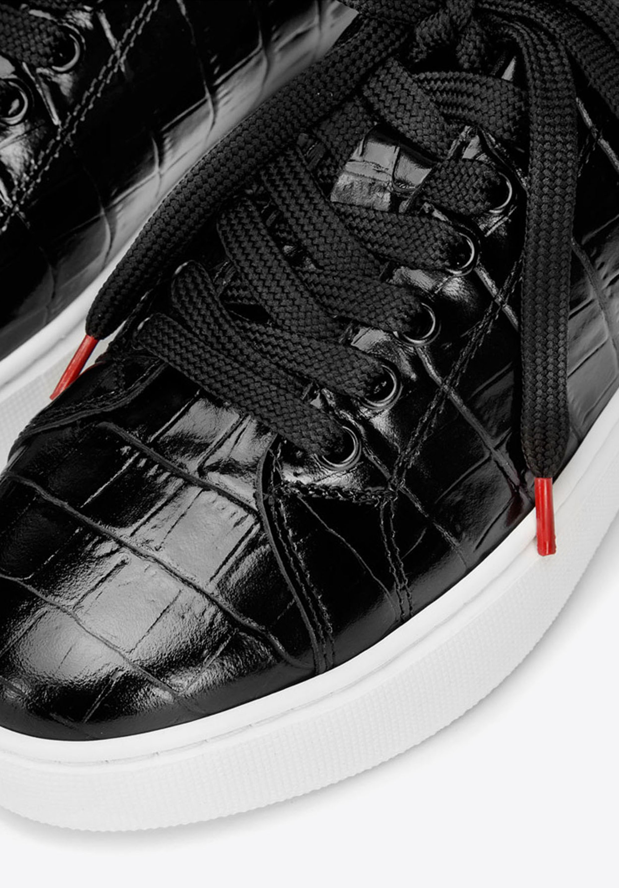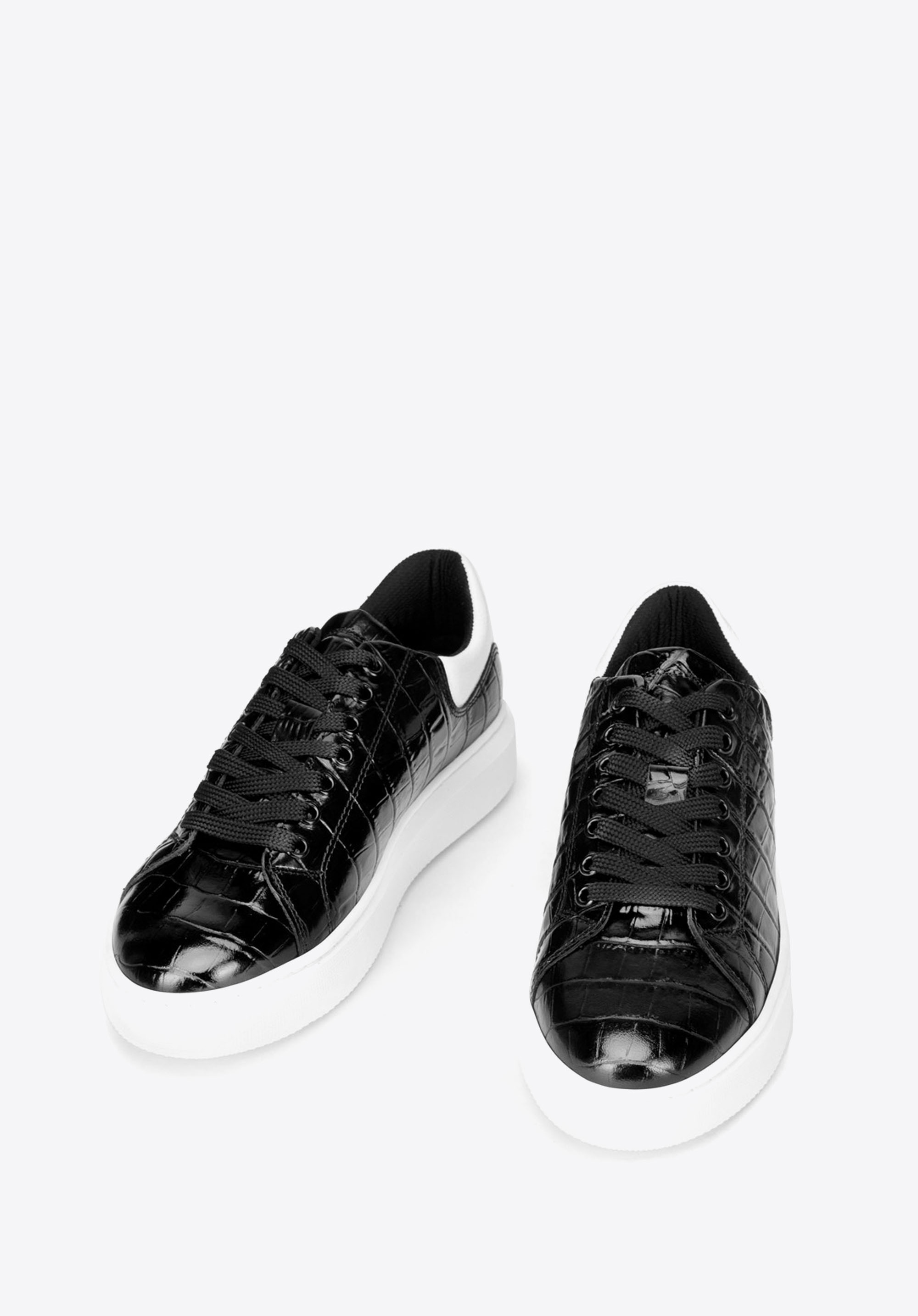 Damskie sneakersy z lakierowanej skóry o krokodylej fakturze czarno-białe