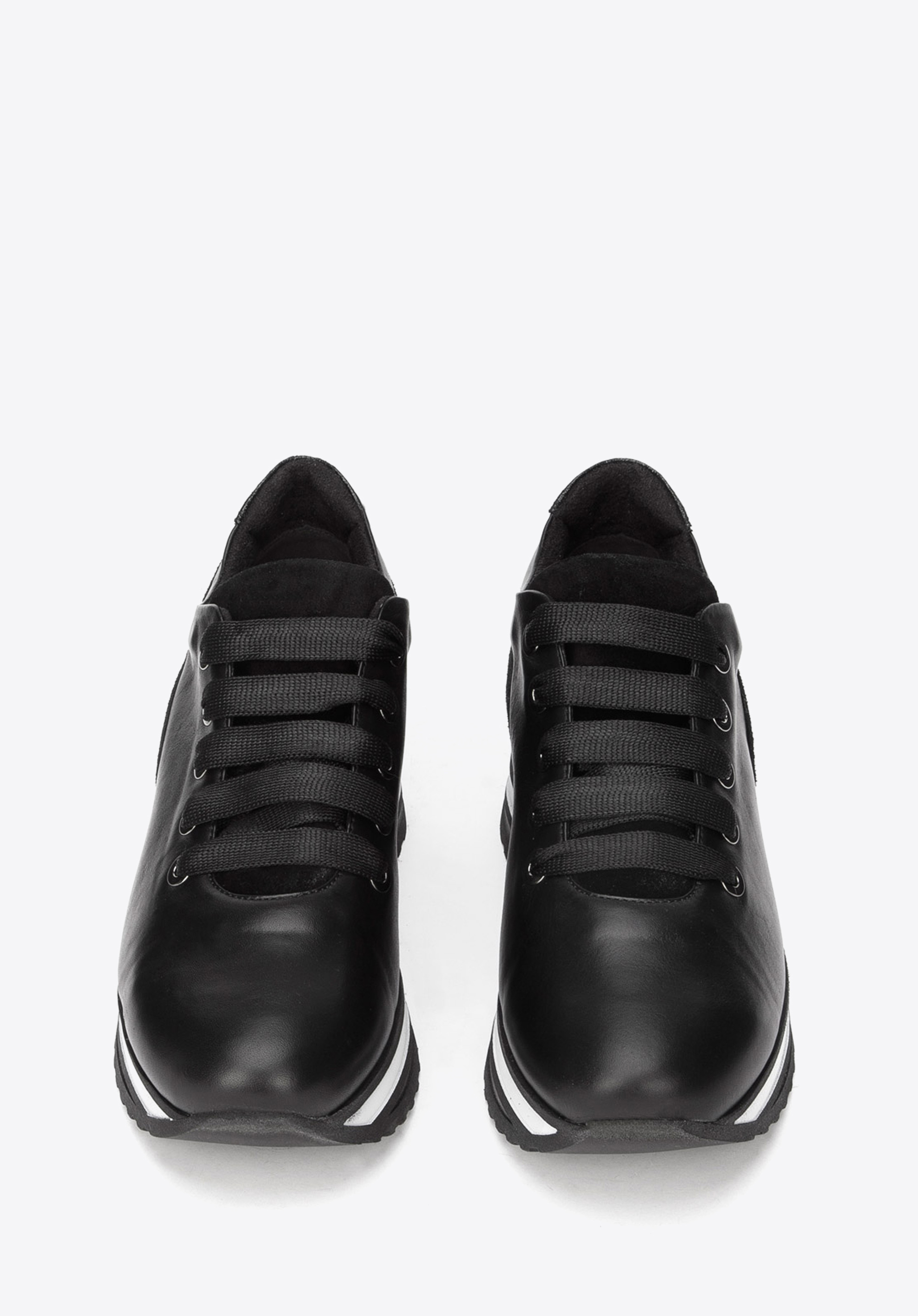Wygodne buty uszyte we Włoszech z wysokiej klasy skóry o naturalnym wykończeniu, wyprawionej substancjami roślinnymi. Buty mają także wstawki ze skóry zamszowej oraz metalicznej, co razem daje bardzo ciekawy efekt. Są osadzone na piankowej platformie w paski, o kształcie zapożyczonym z obuwia sportowego. Te starannie wykończone, solidne buty posłużą Ci wiele sezonów. Damskie sneakersy z trzech rodzajów skóry na platformie możesz nosić na różne okazje i do różnych strojów. Będą pasowały do ulubionych dżinsów, ale stylowo przełamią też eleganckie looki, na przykład damski garnitur.