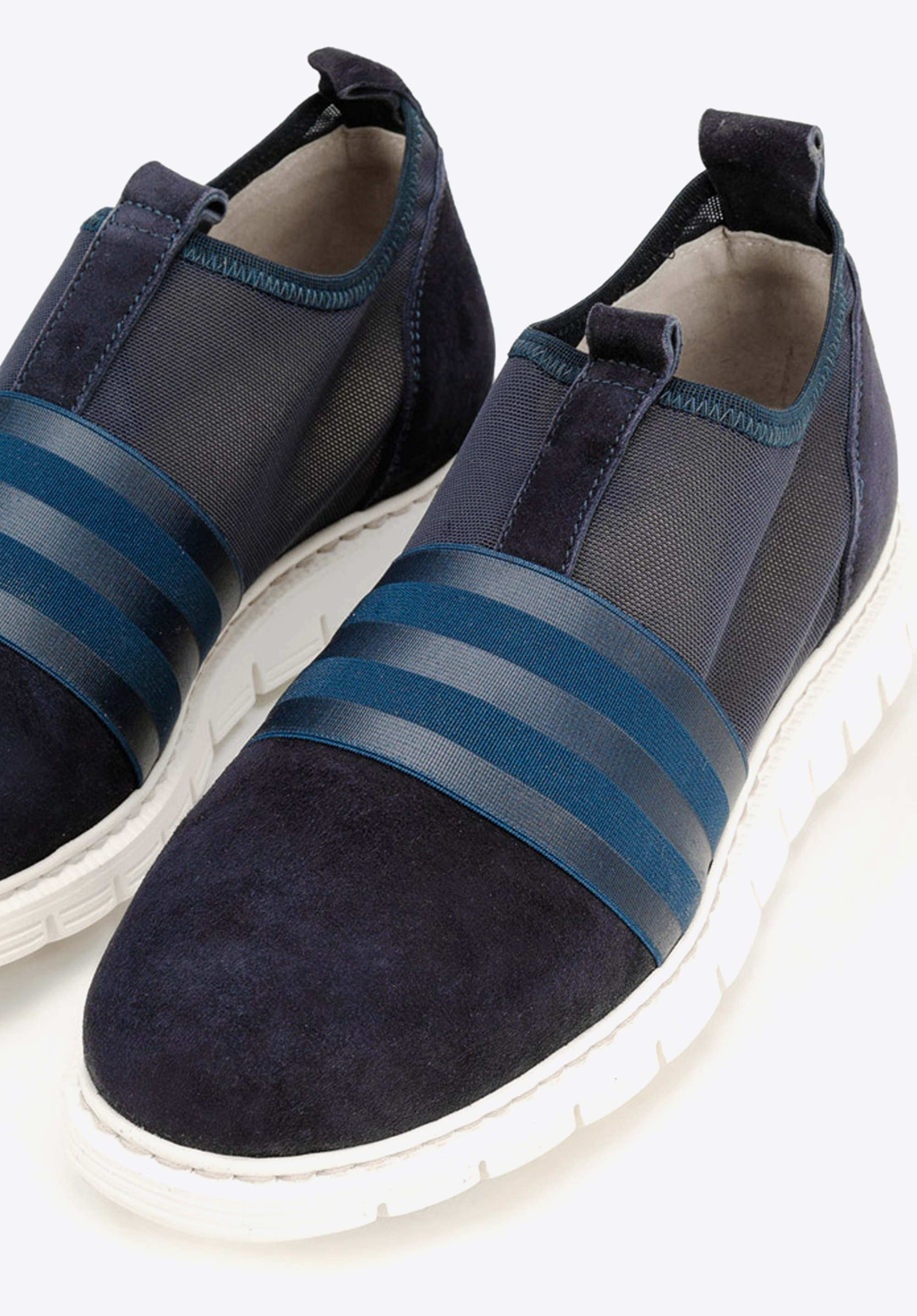 Buty pełne sportowego szyku: swobodne, a jednocześnie niepozbawione elegancji. Z butów sportowych zapożyczyły grubą, ale niezwykle lekką podeszwę, która dzięki nacięciom łatwo się zgina. Zamszowa skóra najwyższej jakości, z której są uszyte, jest uzupełniona modną półprzezroczystą siateczką. Dzięki szerokiej gumie obejmującej śródstopie sneakersy bardzo wygodnie się wsuwa. Guma ma ozdobne, matowe i błyszczące paski, które dodatkowo nawiązują do sportowego stylu butów. Uszyto je we Włoszech, gdzie zostały ręcznie wykończone. Damskie sneakersy zamszowe z gumką będą pasowały zarówno do Twojego ulubionego dresu, jak i do spodni w kant i koszuli.