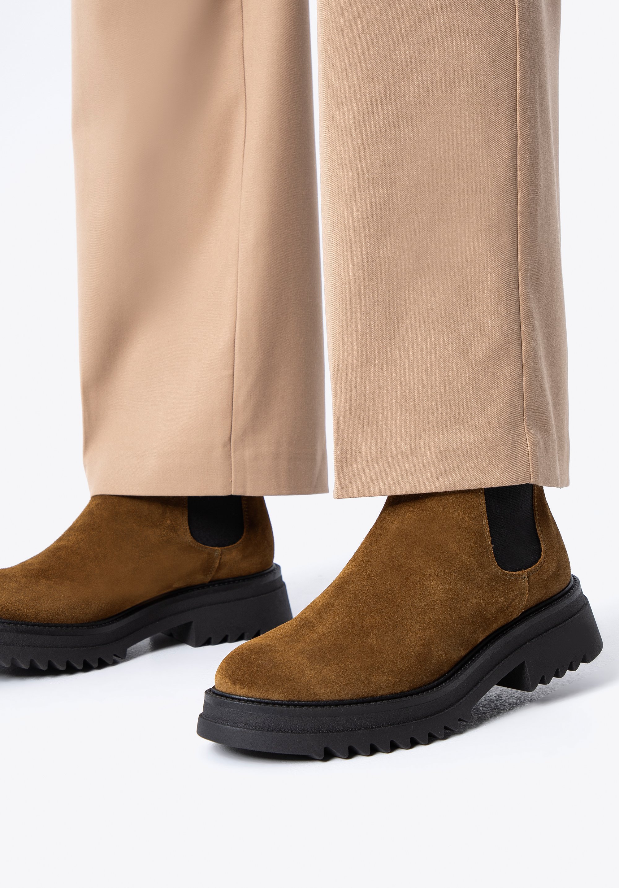 Klasyczny fason z charakterystycznymi gumkami po bokach ładnie dopasuje się do Twojej nogi. Noś je do ulubionej sukienki i skórzanej ramoneski lub połącz z dopasowanymi dżinsami i oversizowym swetrem.