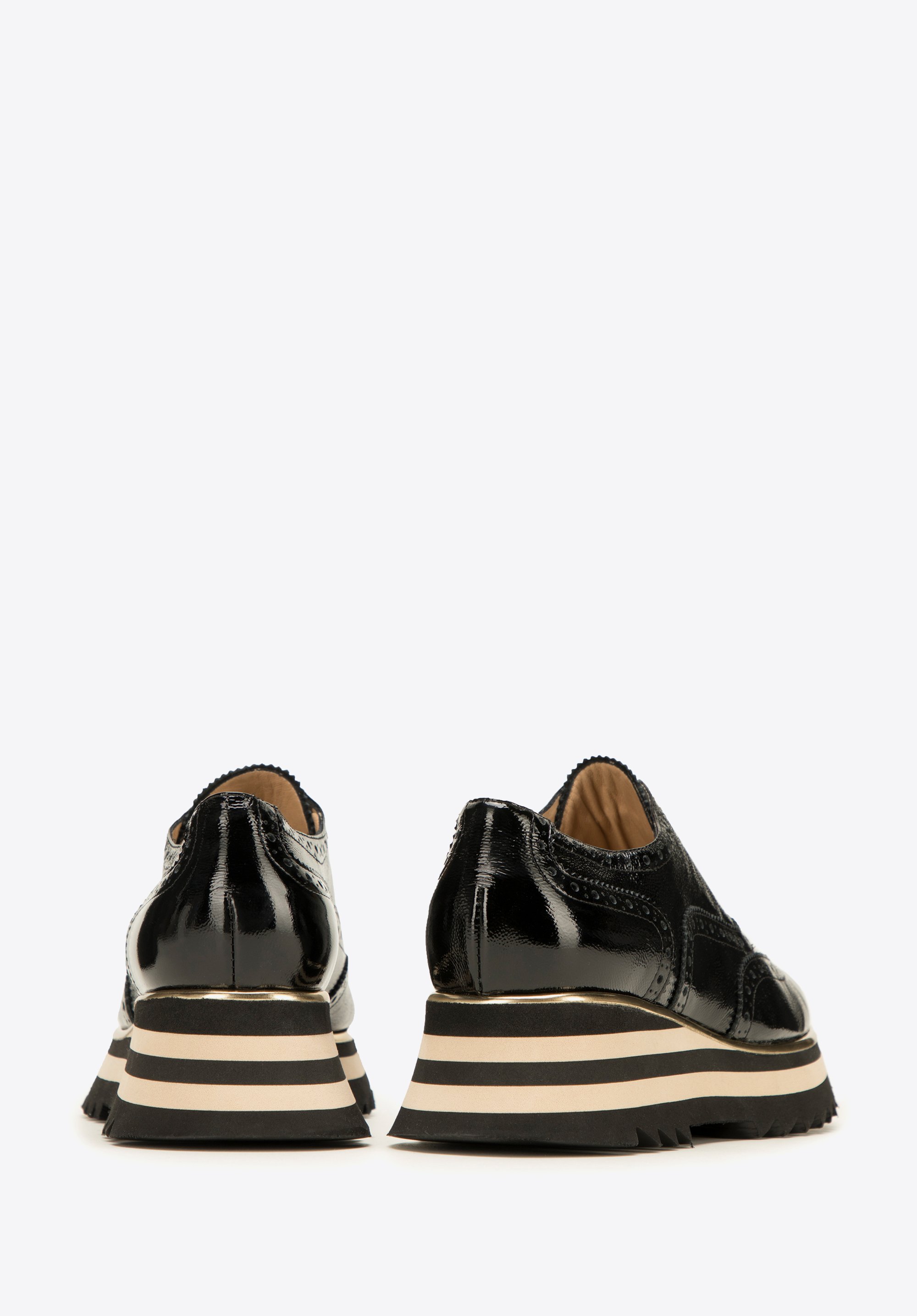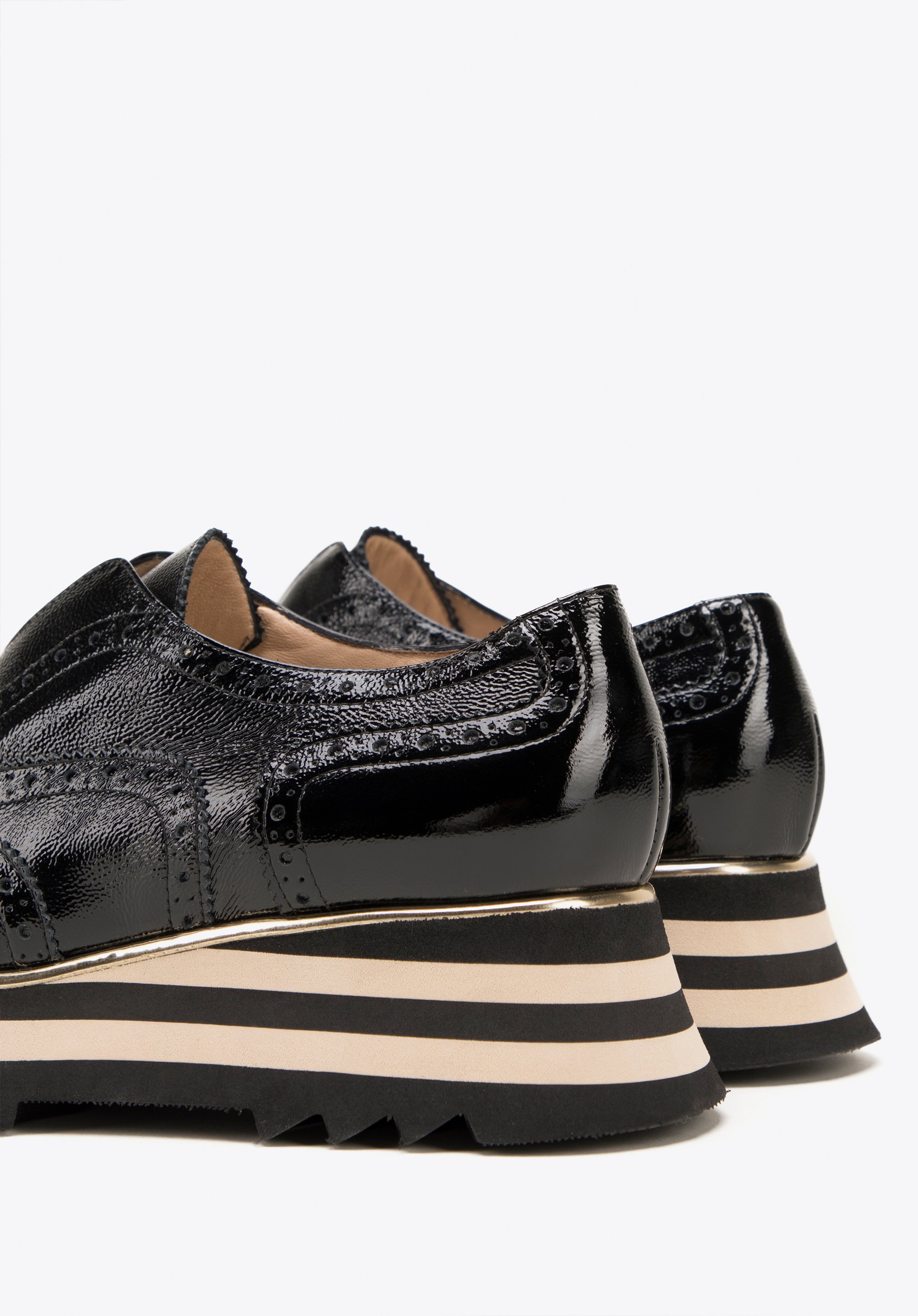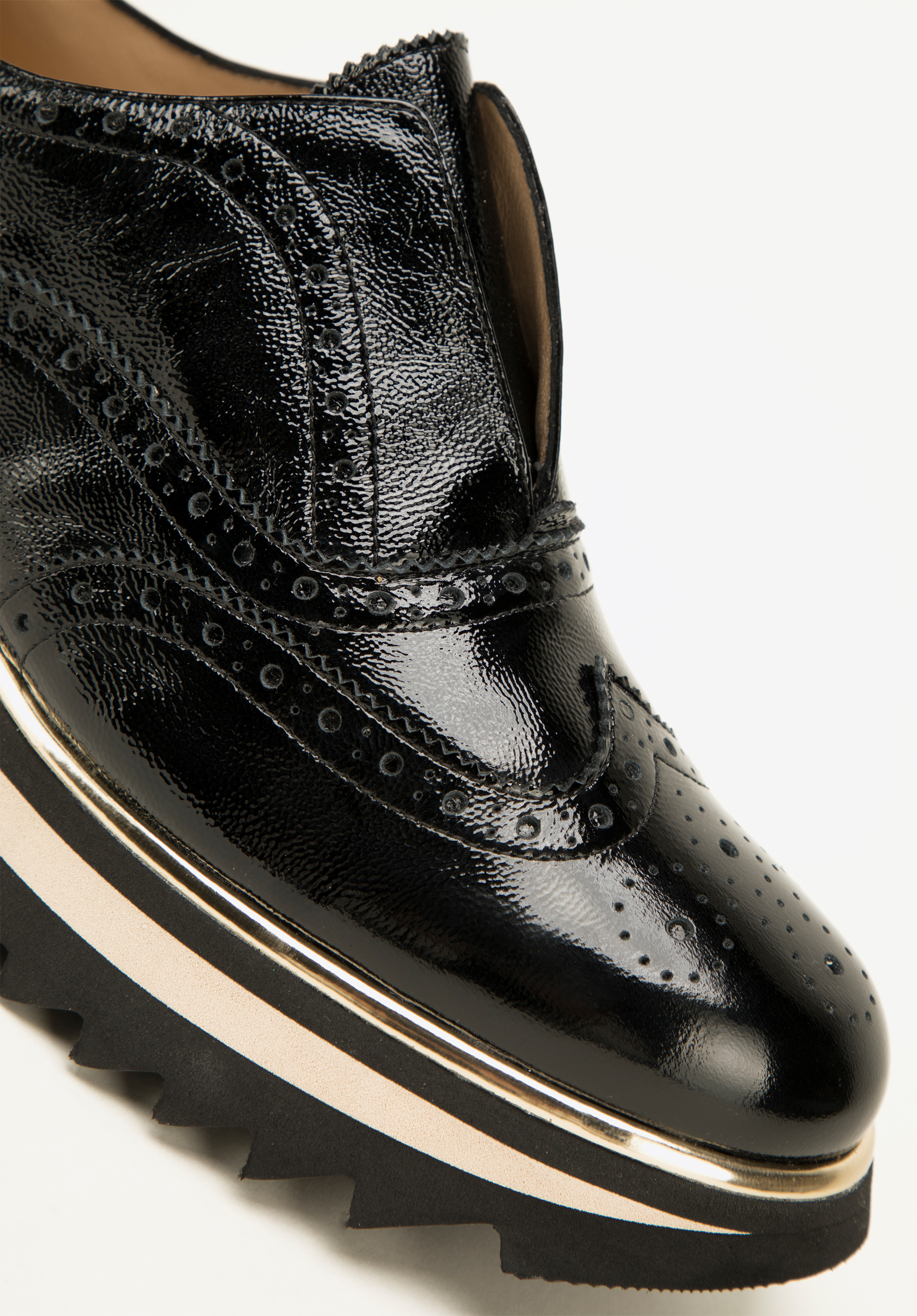 - Design: Uwagę przyciągają: błyszcząca skóra lakierowana oraz perforacje na czubku zdobienia w kształcie rozety, a na cholewce w kształcie skrzydełek z dziurkowaniami i przeszyciami.