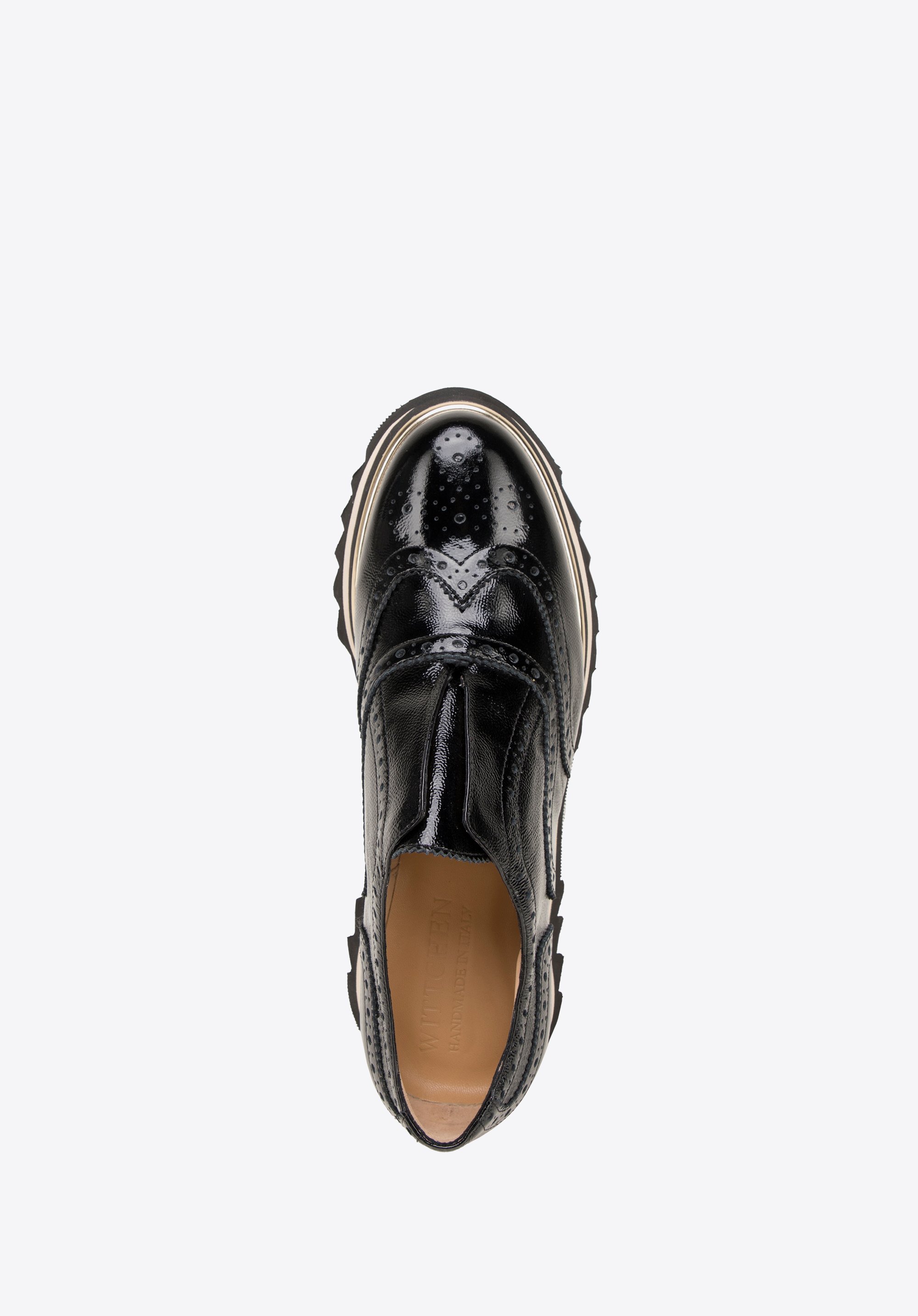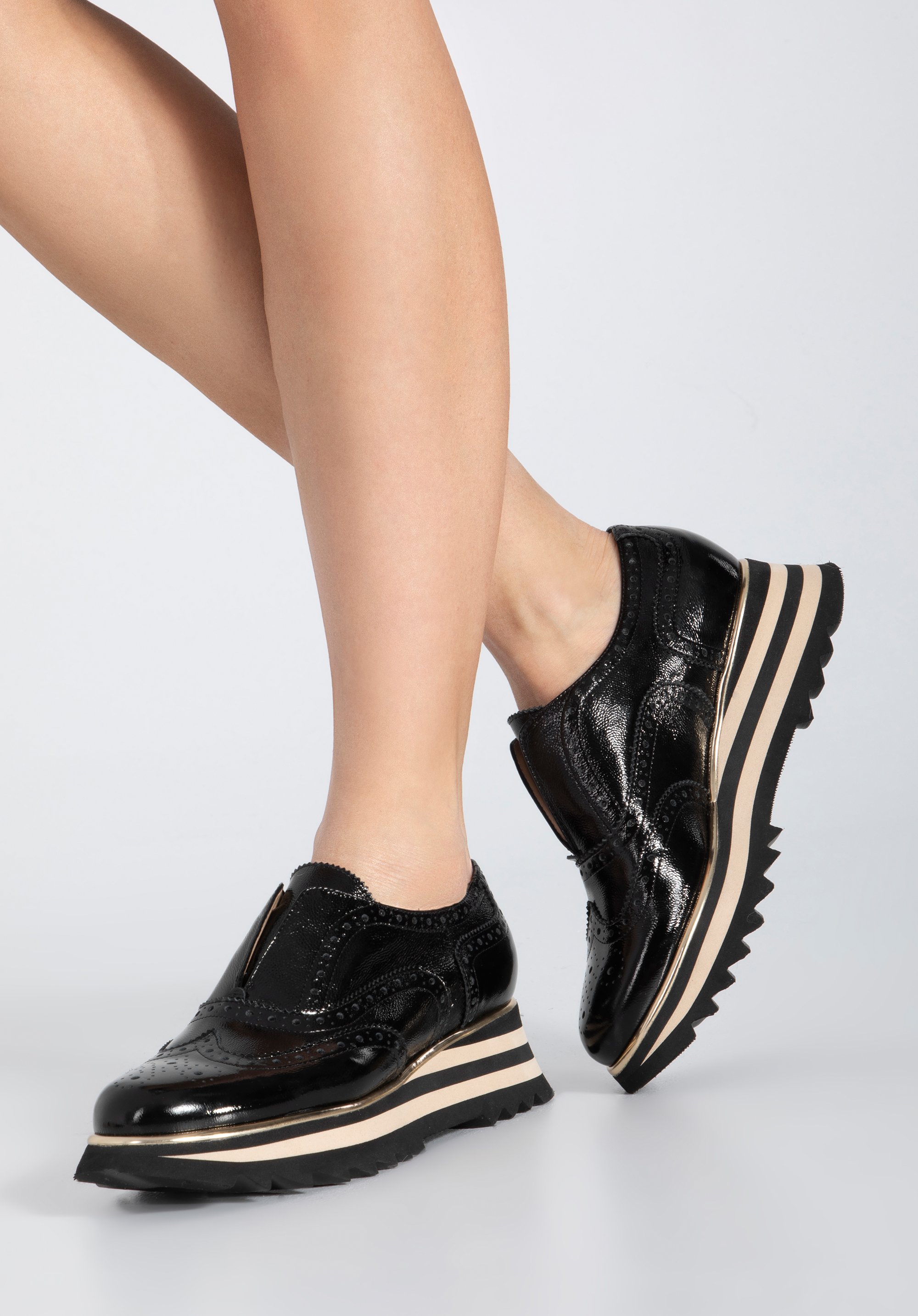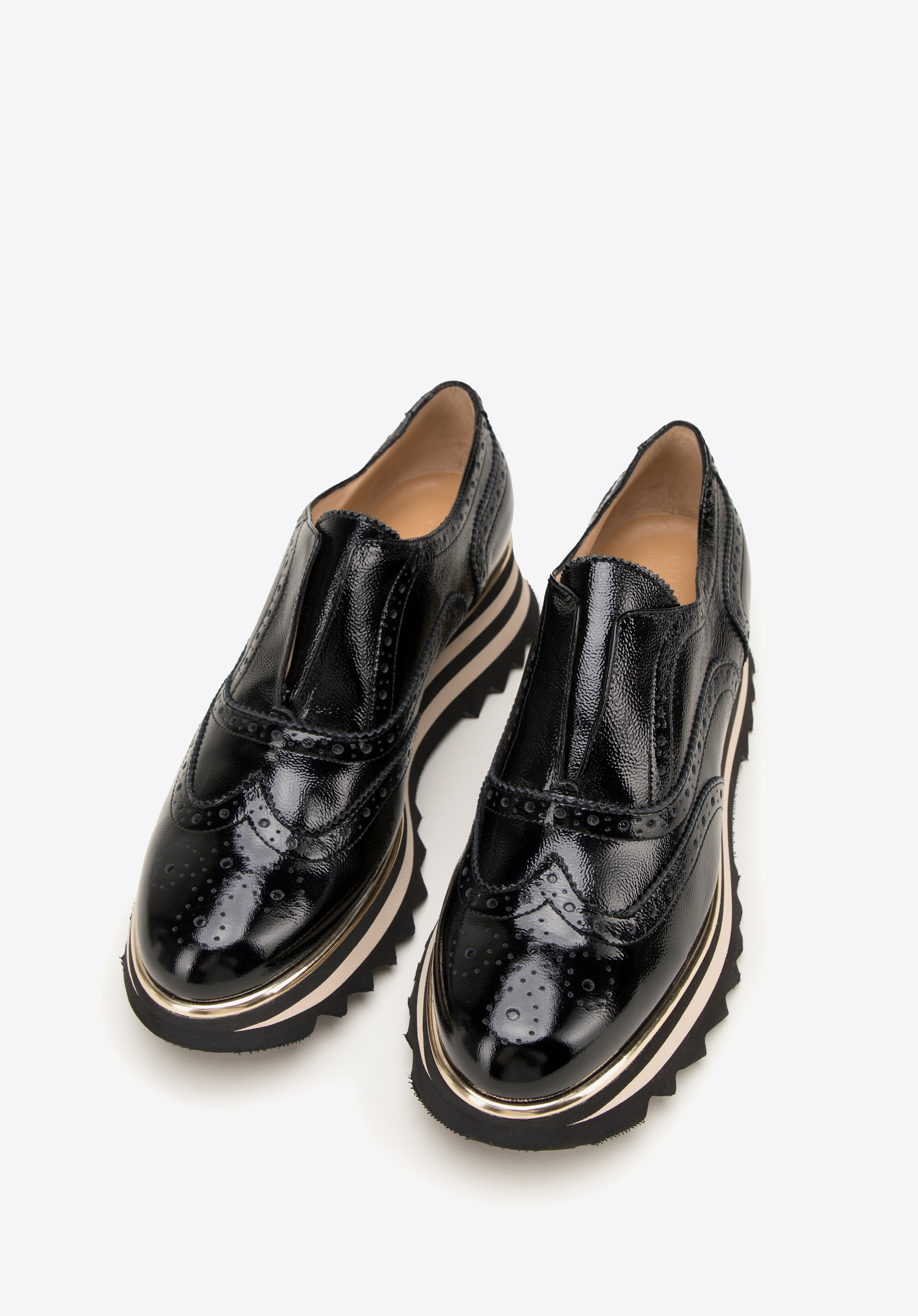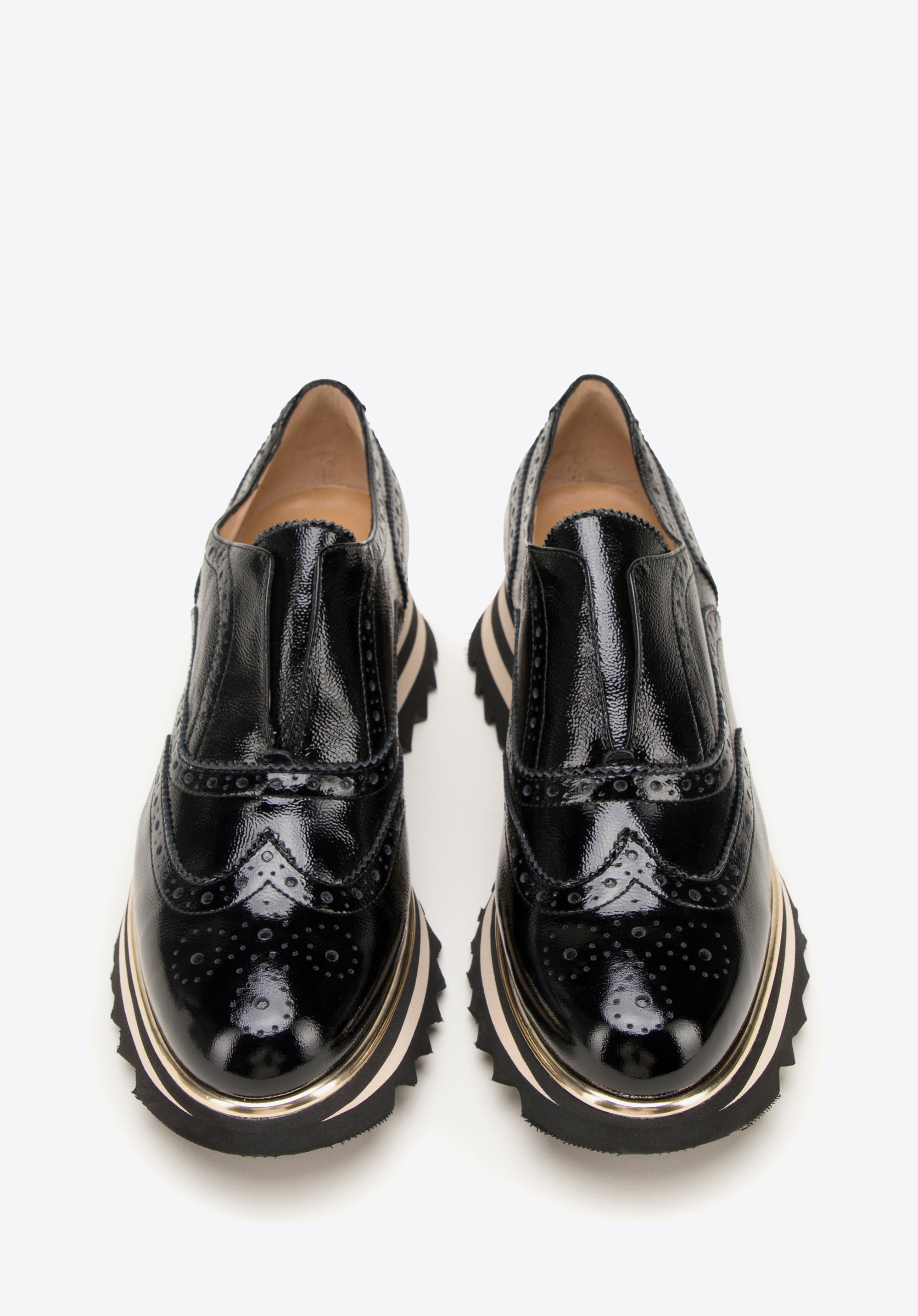 - Design: Uwagę przyciągają: błyszcząca skóra lakierowana oraz perforacje na czubku zdobienia w kształcie rozety, a na cholewce w kształcie skrzydełek z dziurkowaniami i przeszyciami.