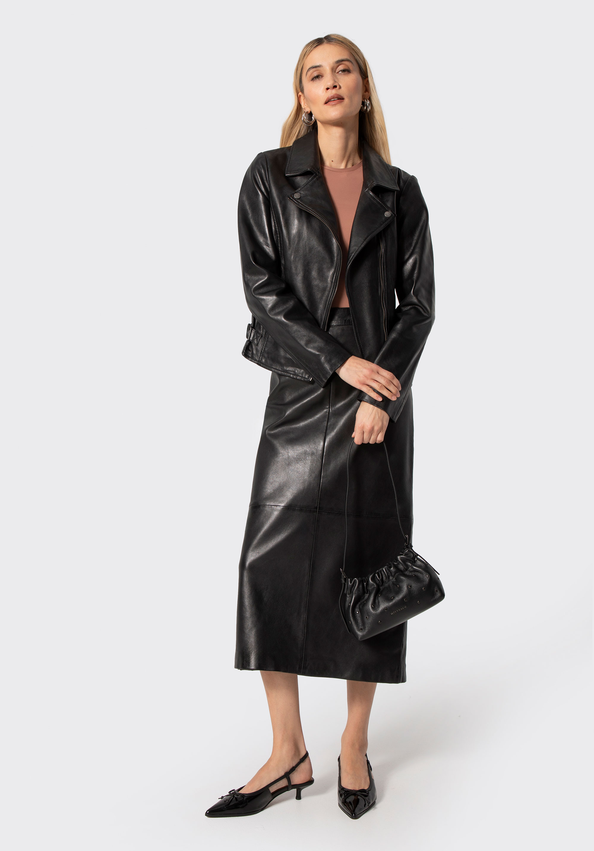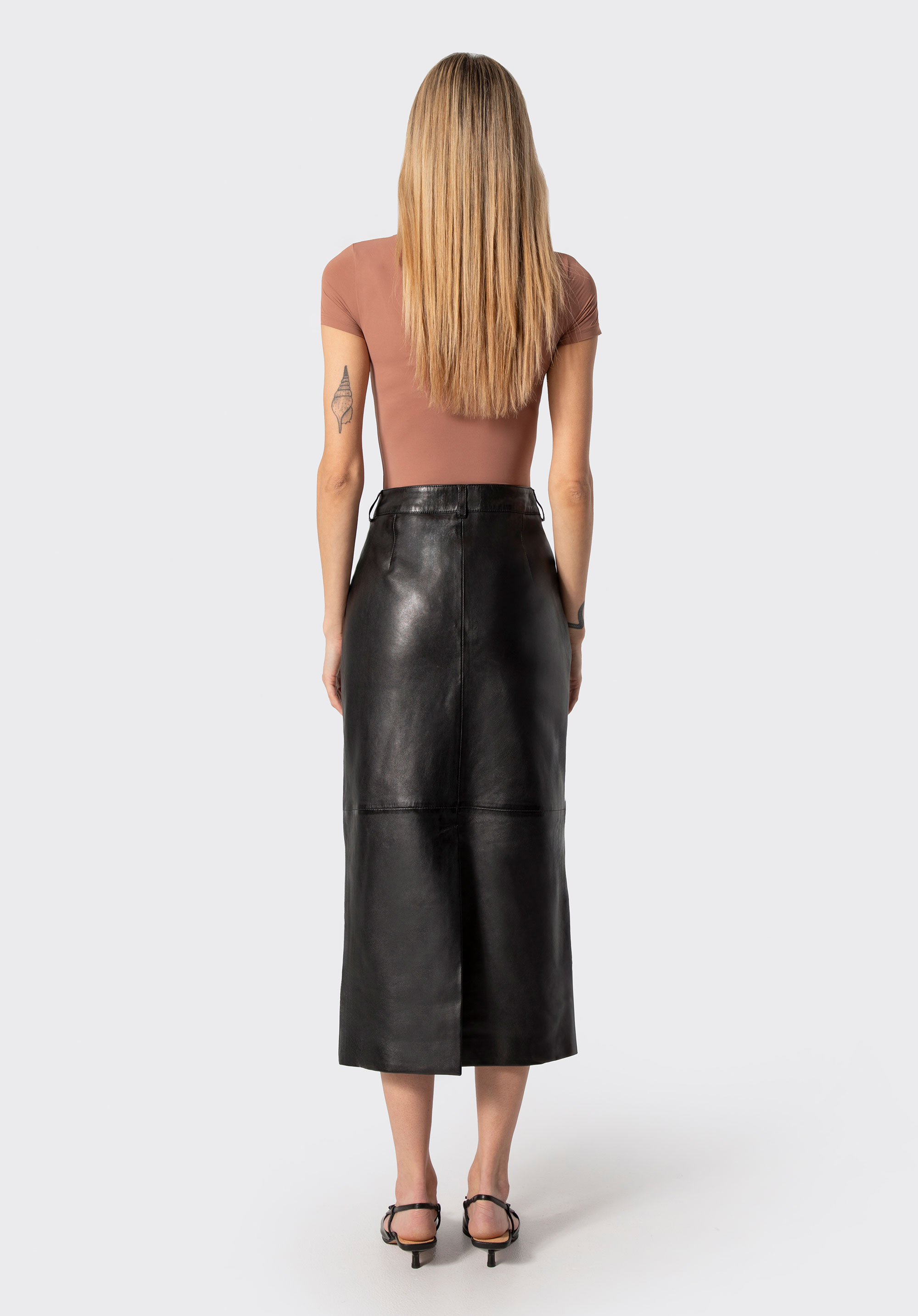 Długa ołówkowa spódnica ze skóry naturalnej świetnie wpisuje się w garderobę kobiety, która stawia na elegancki minimalizm i chce wyglądać perfekcyjnie zarówno w pracy, jak i podczas wieczornych wyjść. Dopasowany fason z podwyższonym stanem podkreśla talię, długość midi dodaje sylwetce klasy, a rozcięcie z tyłu i boczny zamek zapewniają wygodę oraz idealne dopasowanie.
