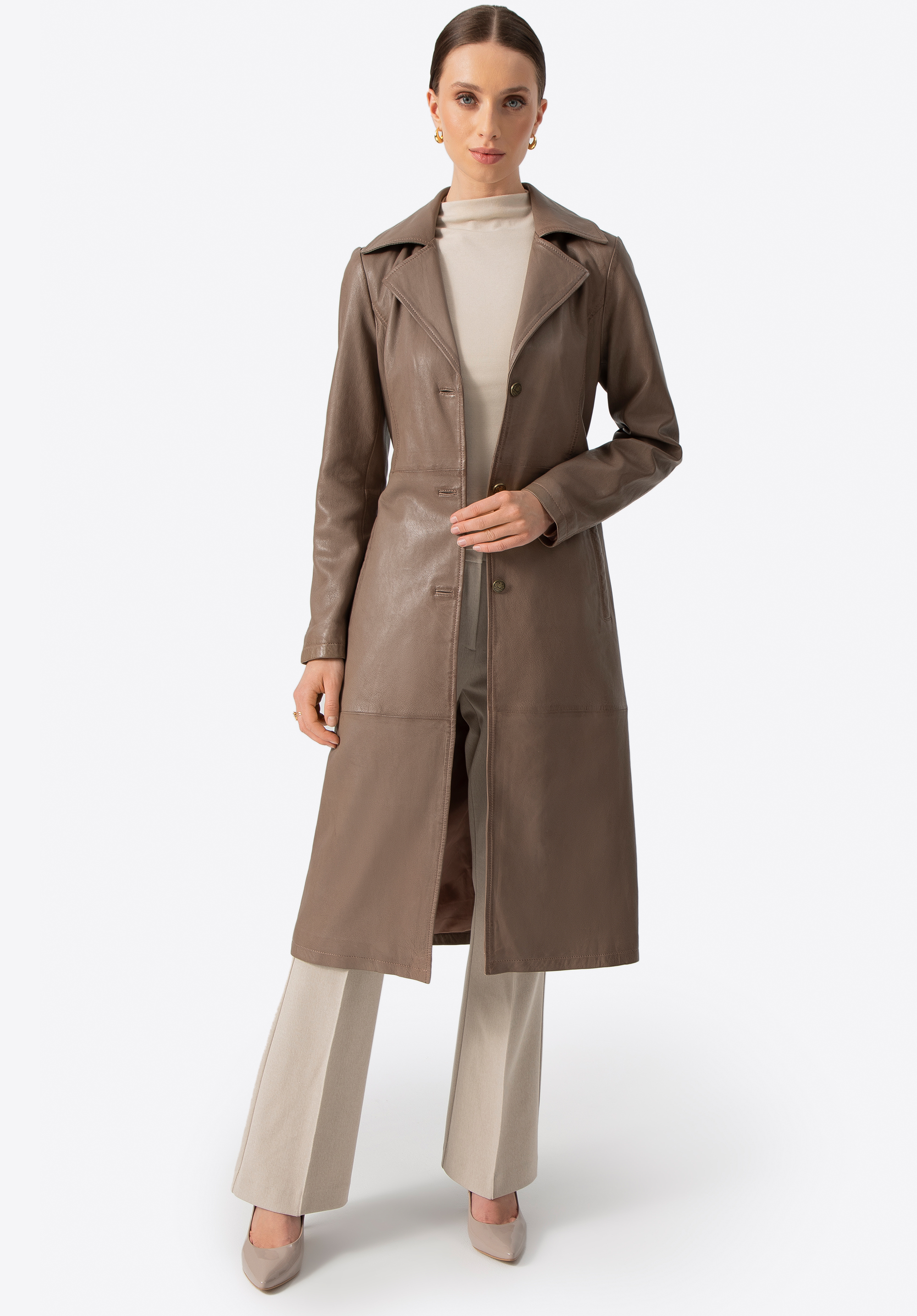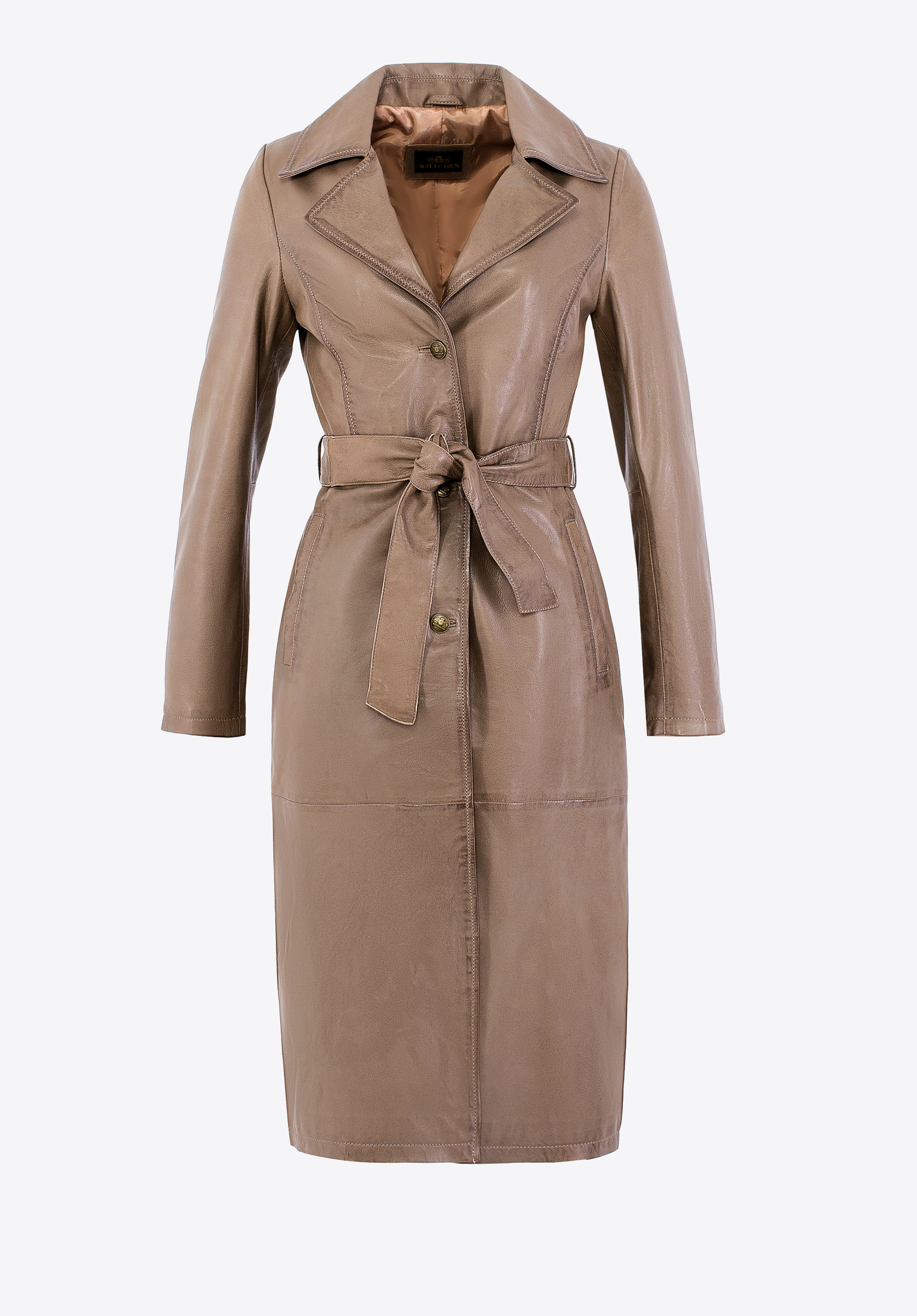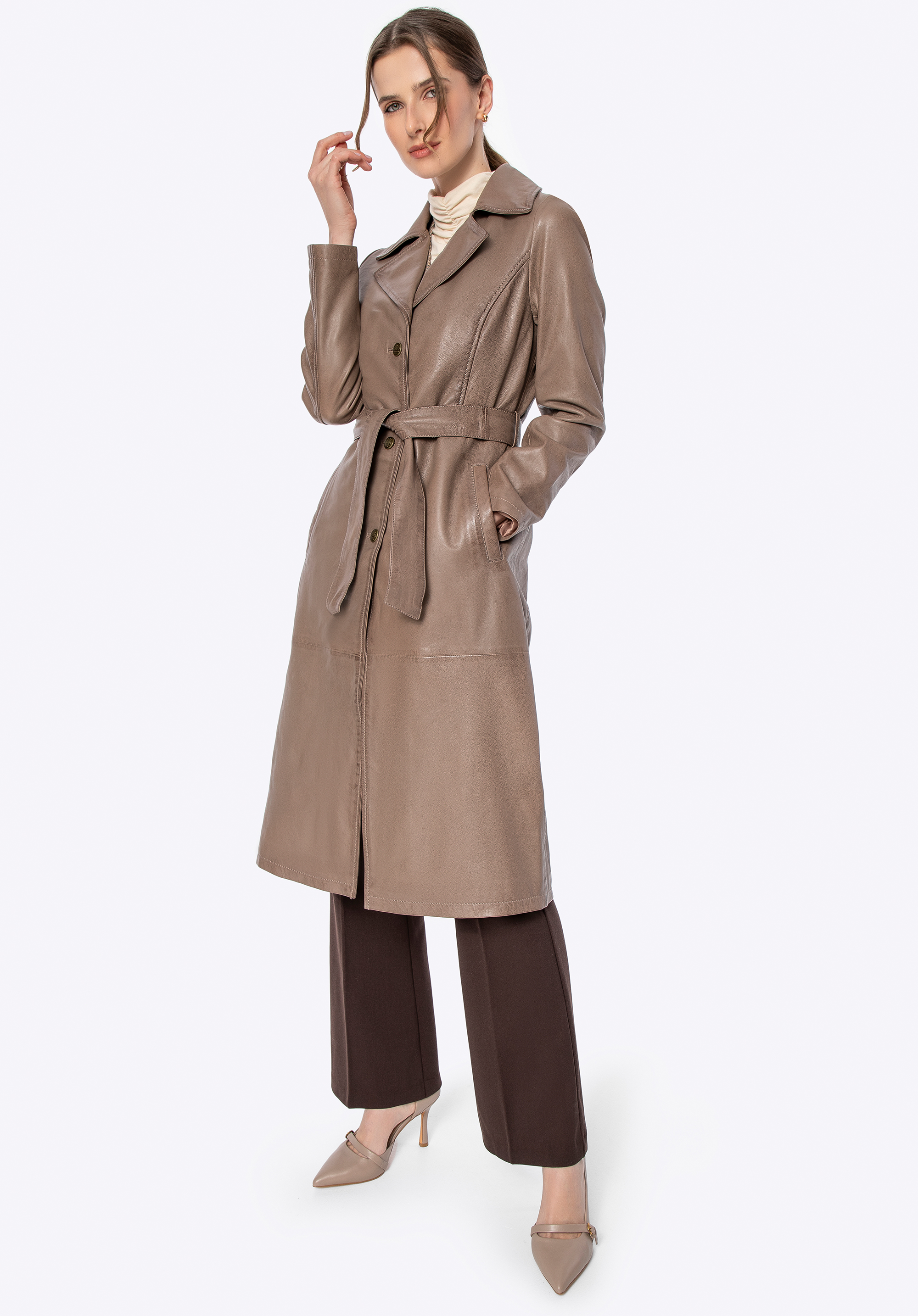 Ten długi płaszcz ze skóry owczej to definicja ponadczasowego stylu i klasy. Taliowany krój podkreśla sylwetkę, a pasek pozwala na idealne dopasowanie. Kołnierz rewers, metalowe guziki sygnowane logo producenta i subtelne, pionowe kieszenie tworzą harmonijną całość, emanującą wyrafinowaniem. To nie jest zwykły płaszcz – to inwestycja w styl, który nigdy nie wychodzi z mody.