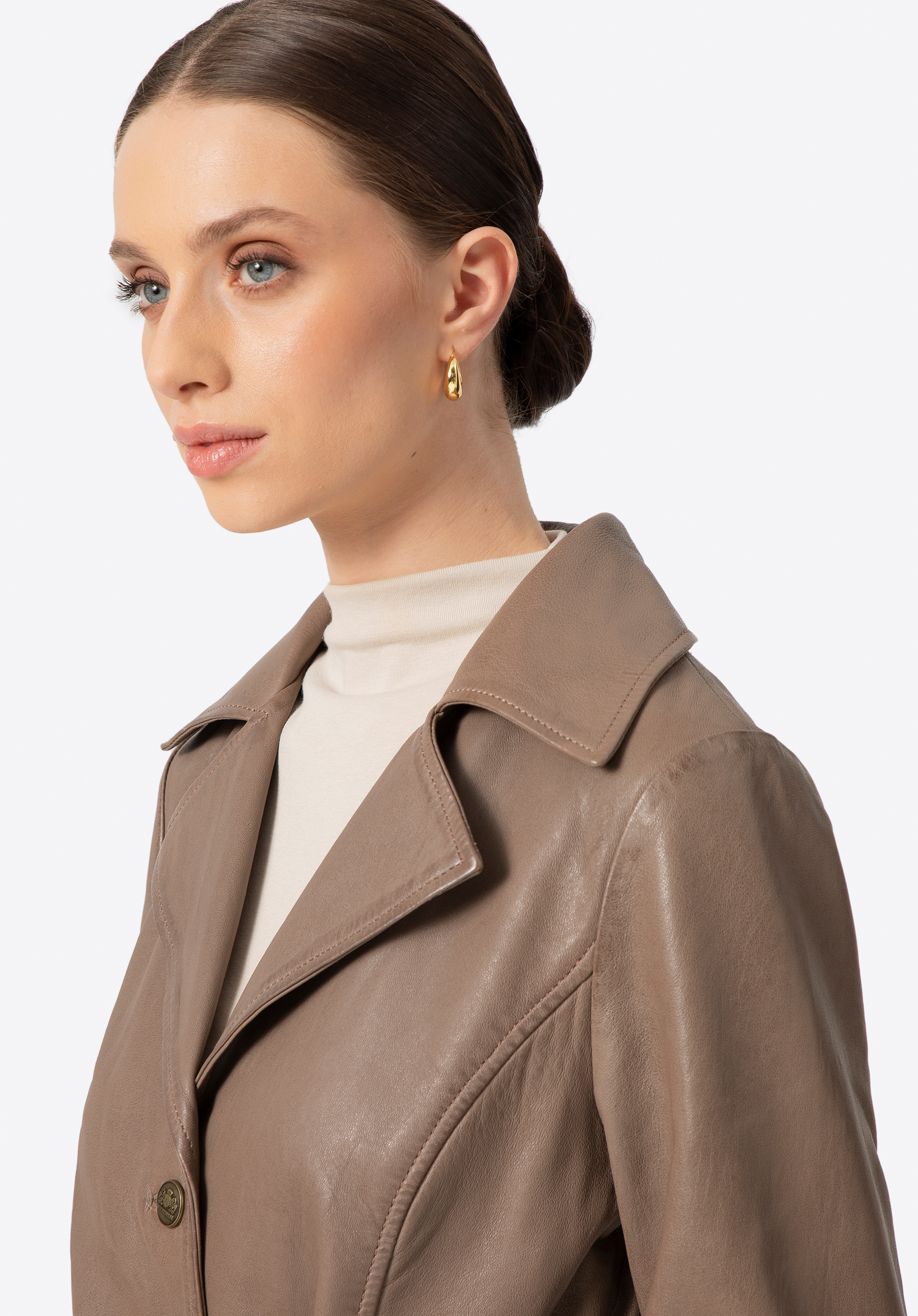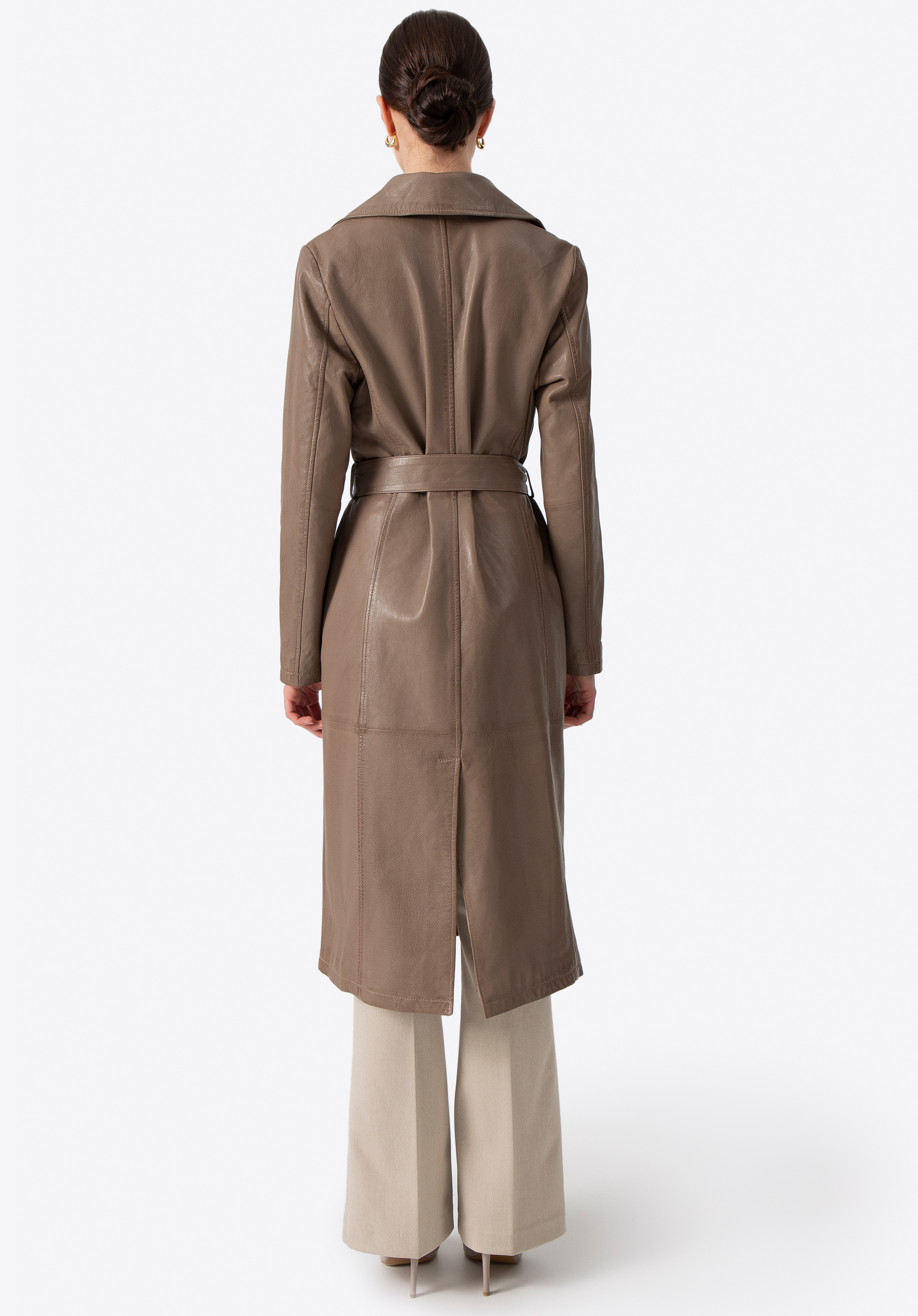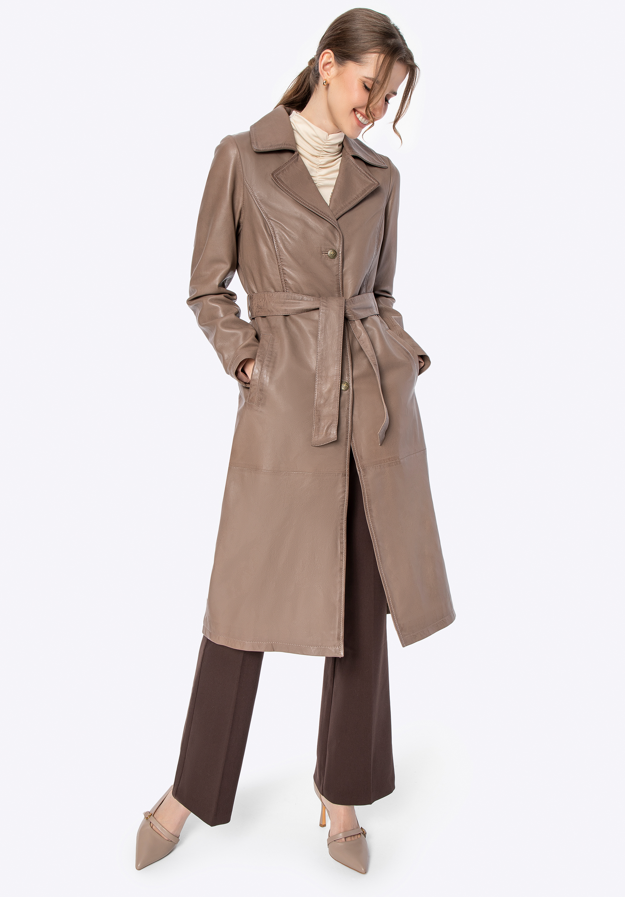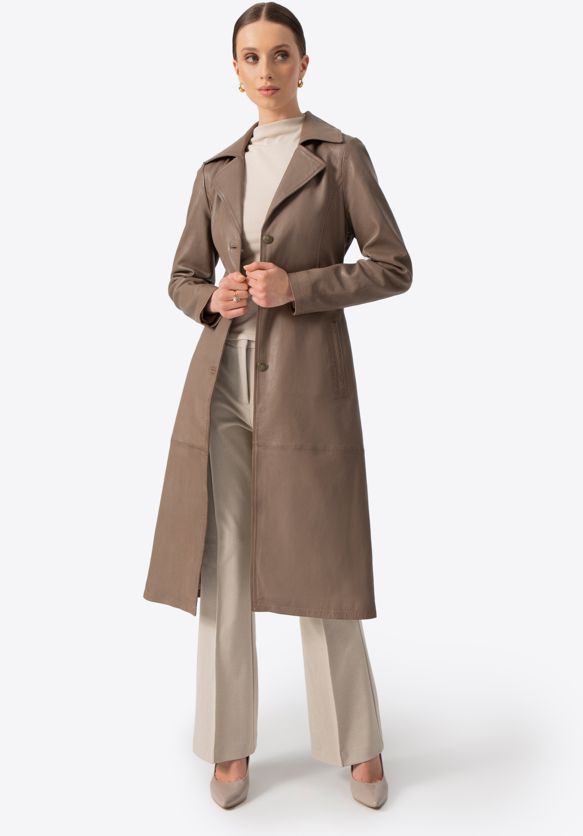 Ten długi płaszcz ze skóry owczej to definicja ponadczasowego stylu i klasy. Taliowany krój podkreśla sylwetkę, a pasek pozwala na idealne dopasowanie. Kołnierz rewers, metalowe guziki sygnowane logo producenta i subtelne, pionowe kieszenie tworzą harmonijną całość, emanującą wyrafinowaniem. To nie jest zwykły płaszcz – to inwestycja w styl, który nigdy nie wychodzi z mody.