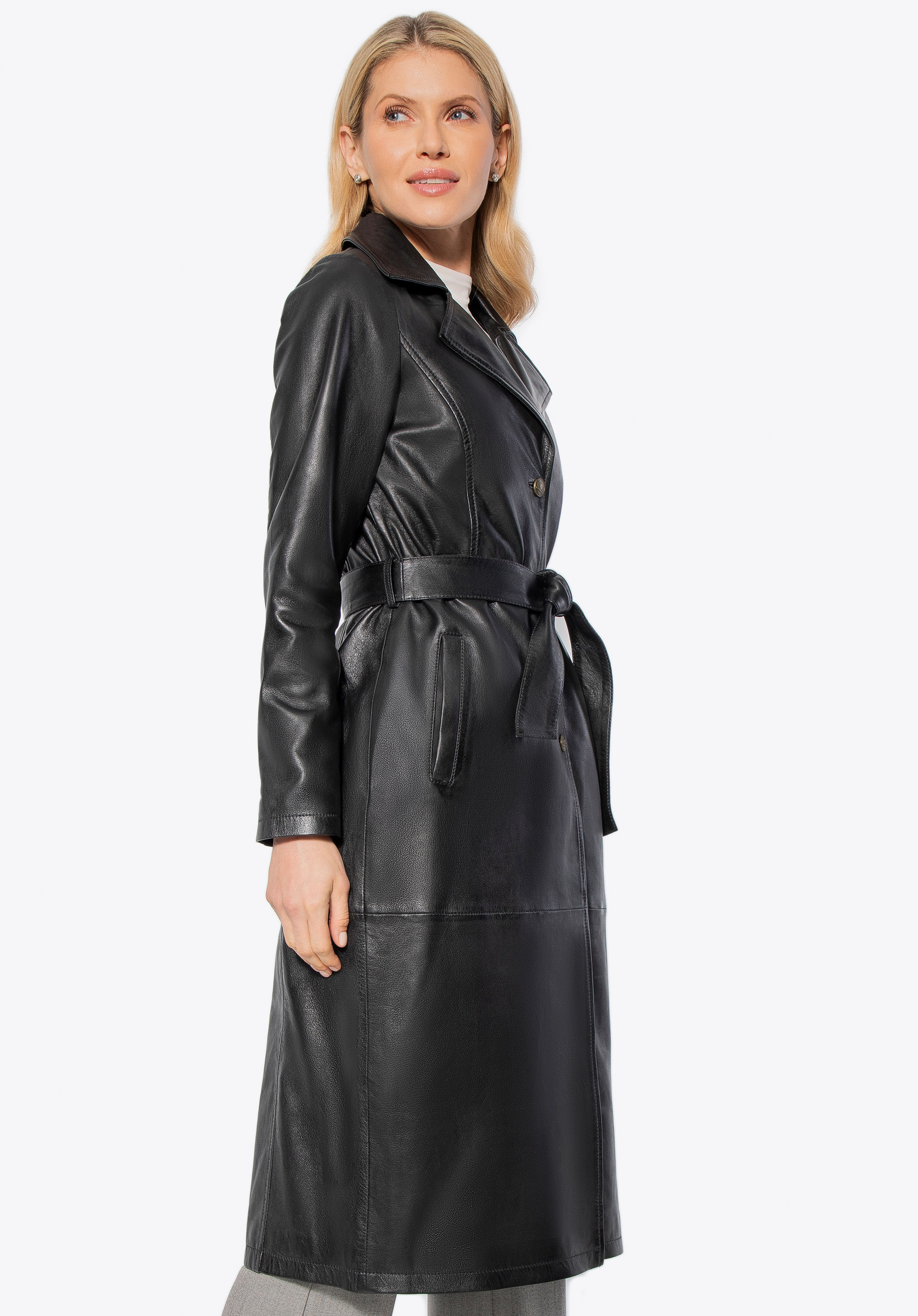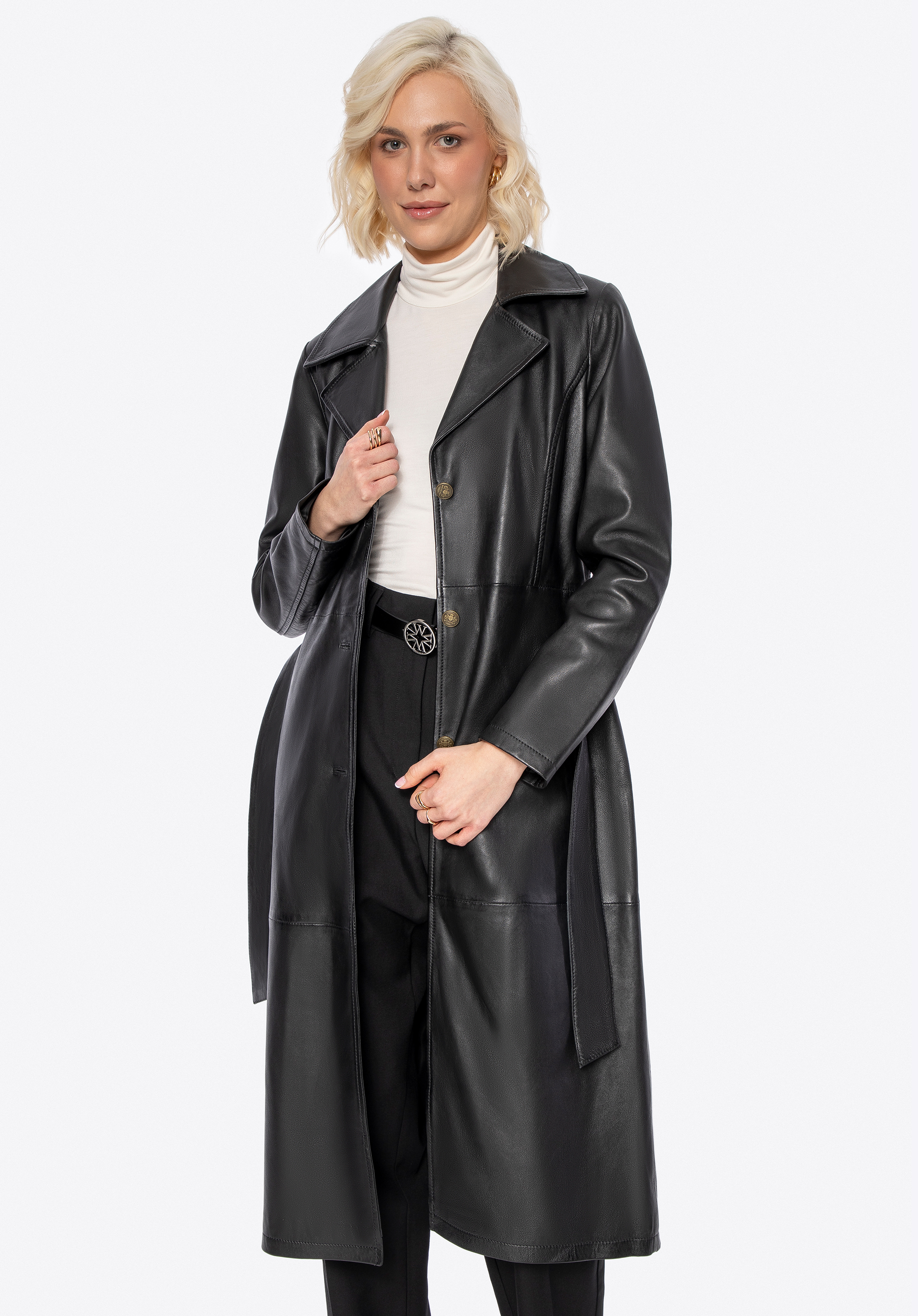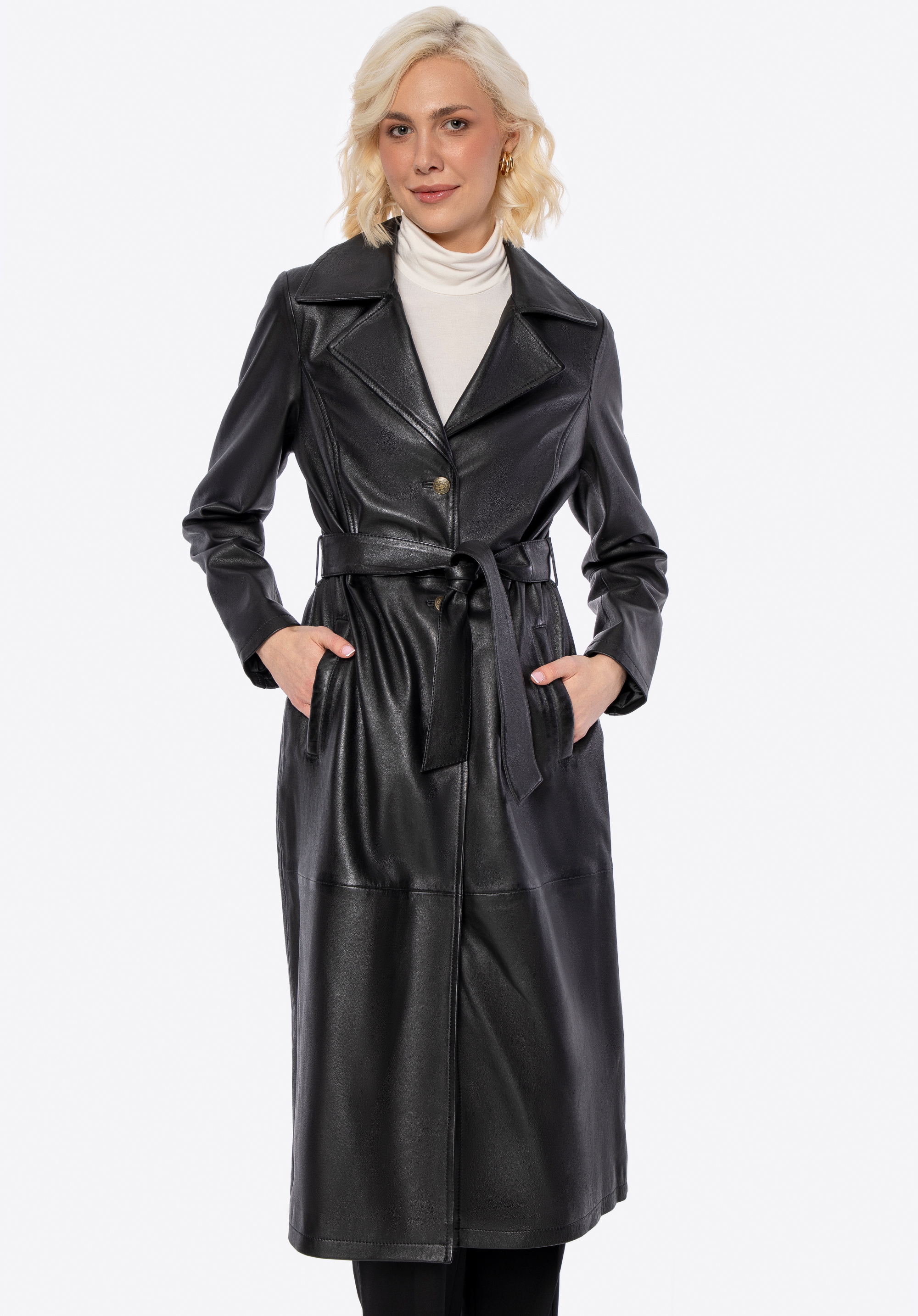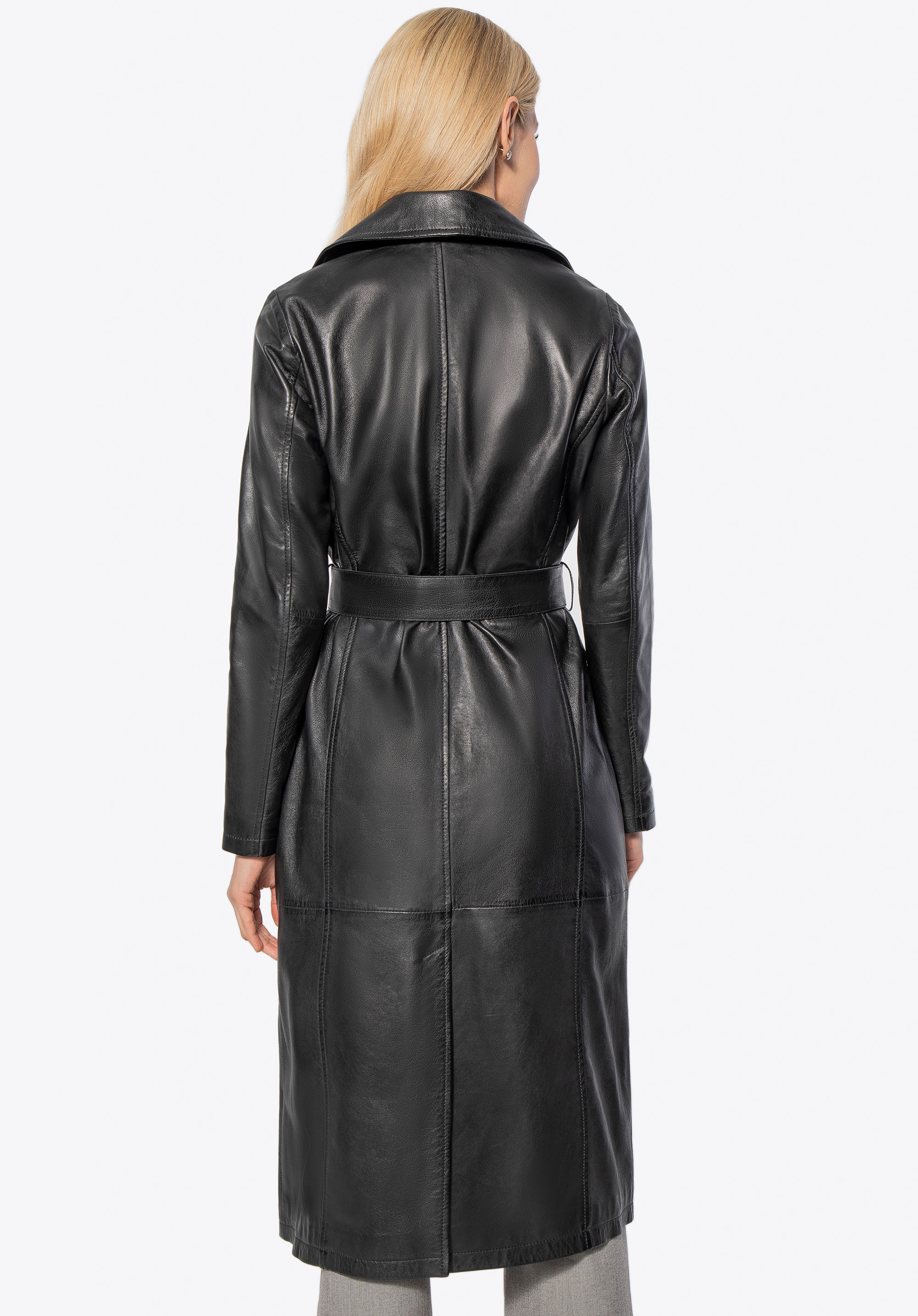 Ten długi płaszcz ze skóry owczej to definicja ponadczasowego stylu i klasy. Taliowany krój podkreśla sylwetkę, a pasek pozwala na idealne dopasowanie. Kołnierz rewers, metalowe guziki sygnowane logo producenta i subtelne, pionowe kieszenie tworzą harmonijną całość, emanującą wyrafinowaniem. To nie jest zwykły płaszcz – to inwestycja w styl, który nigdy nie wychodzi z mody.