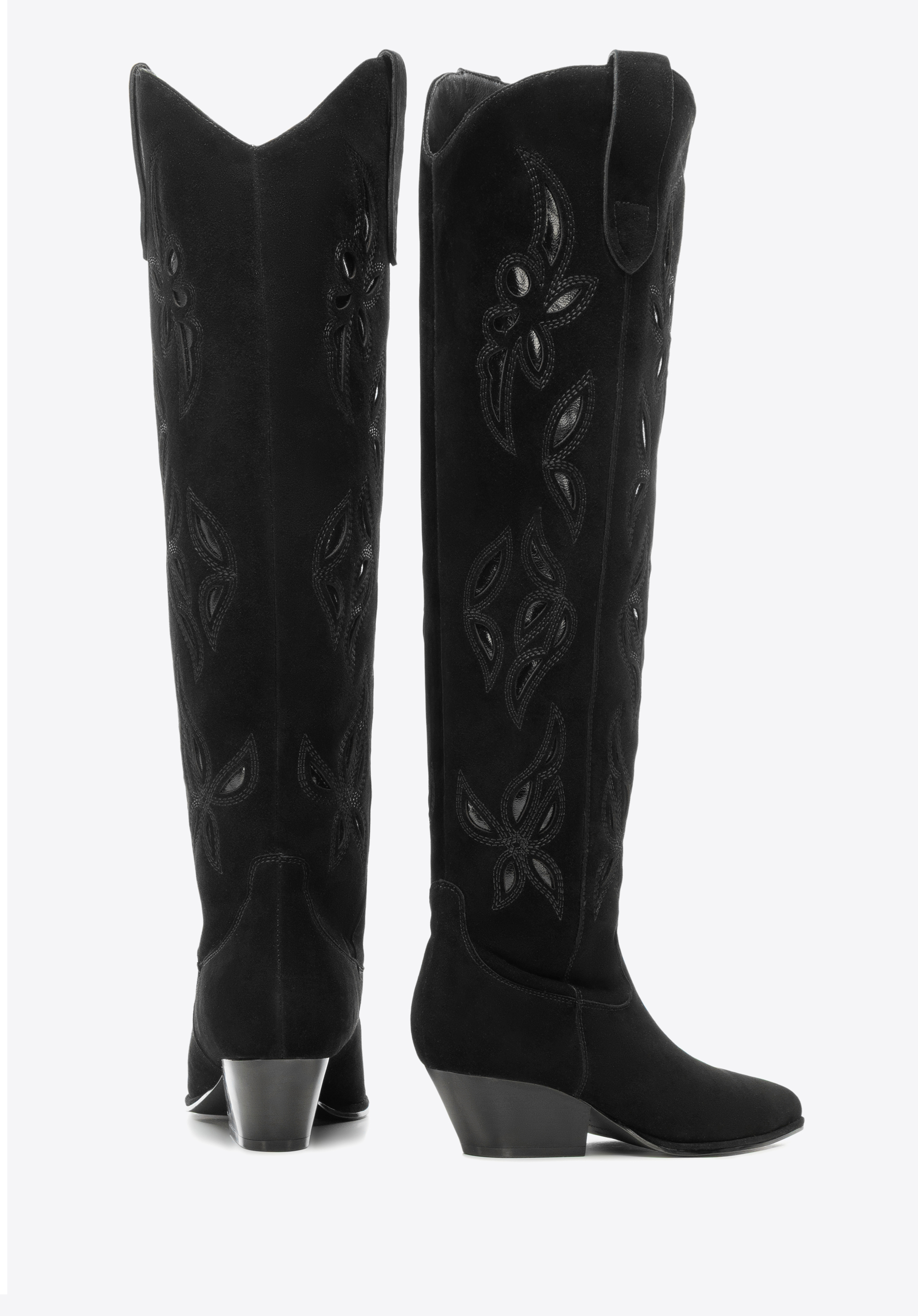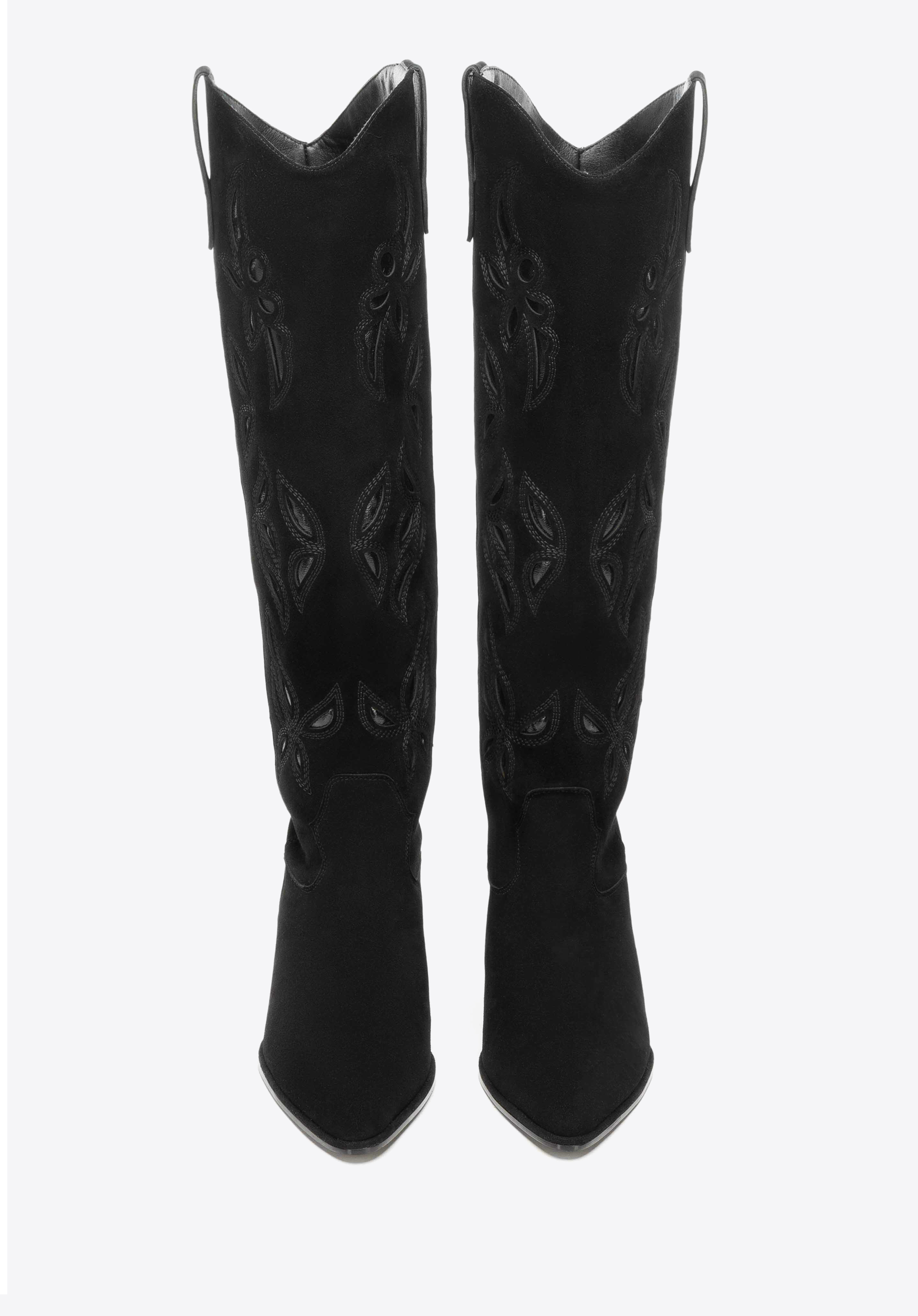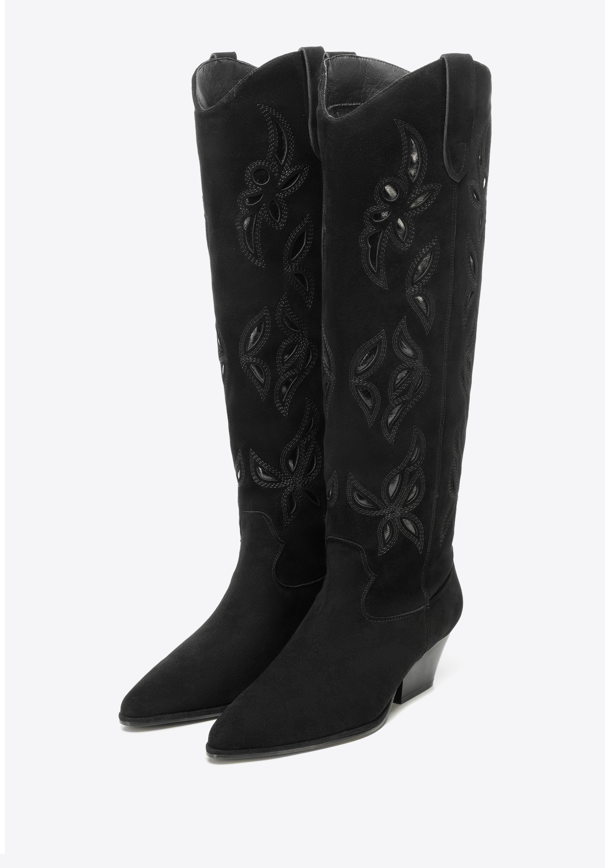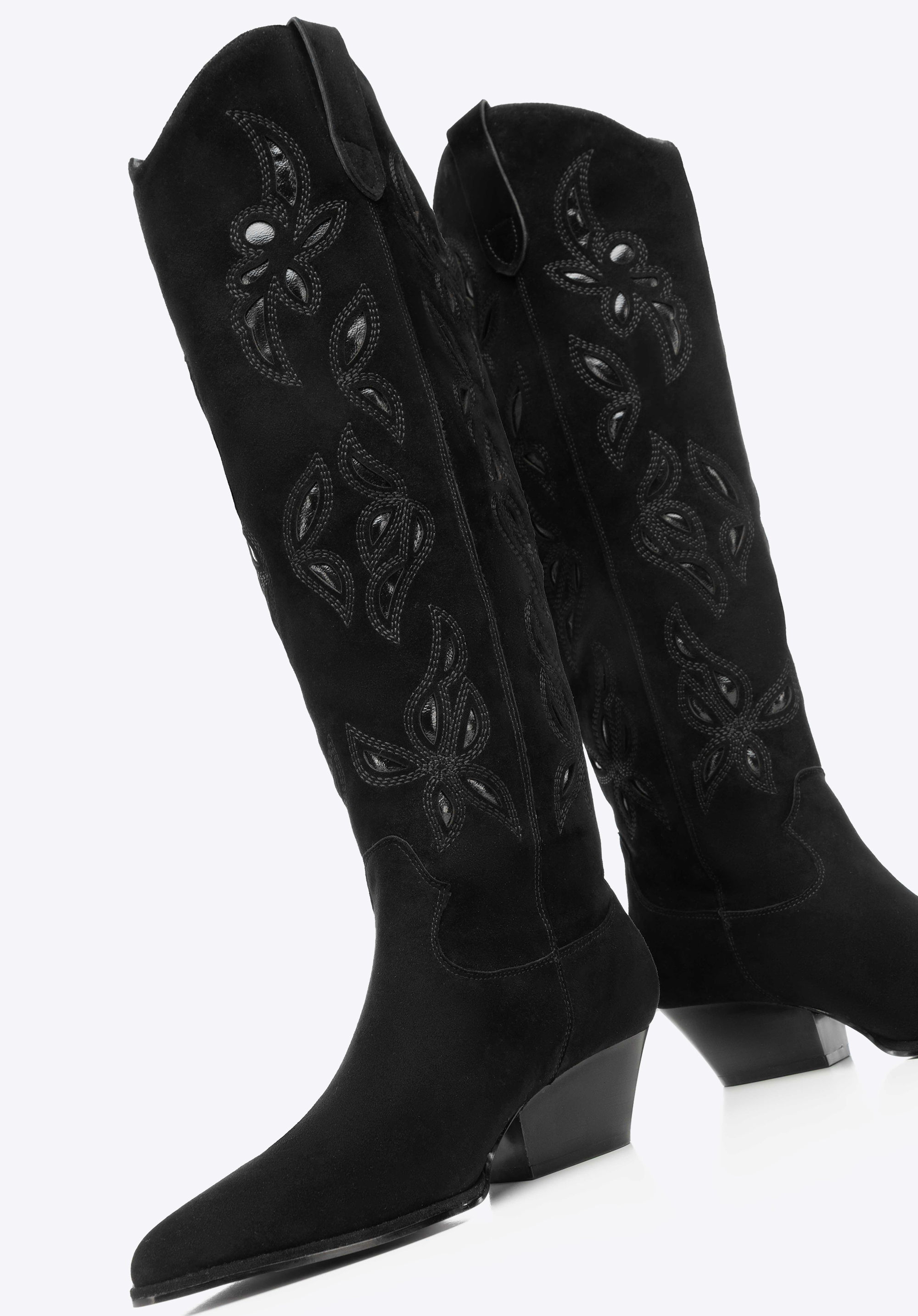 Długie damskie kowbojki ze skóry zamszowej z haftem sprawdzą się u kobiet, które cenią wyraziste formy i ponadczasową elegancję w miejskich stylizacjach. Wysoka cholewka, miękka skóra i dopracowane detale podkreślają sylwetkę i gwarantują wygodę noszenia.