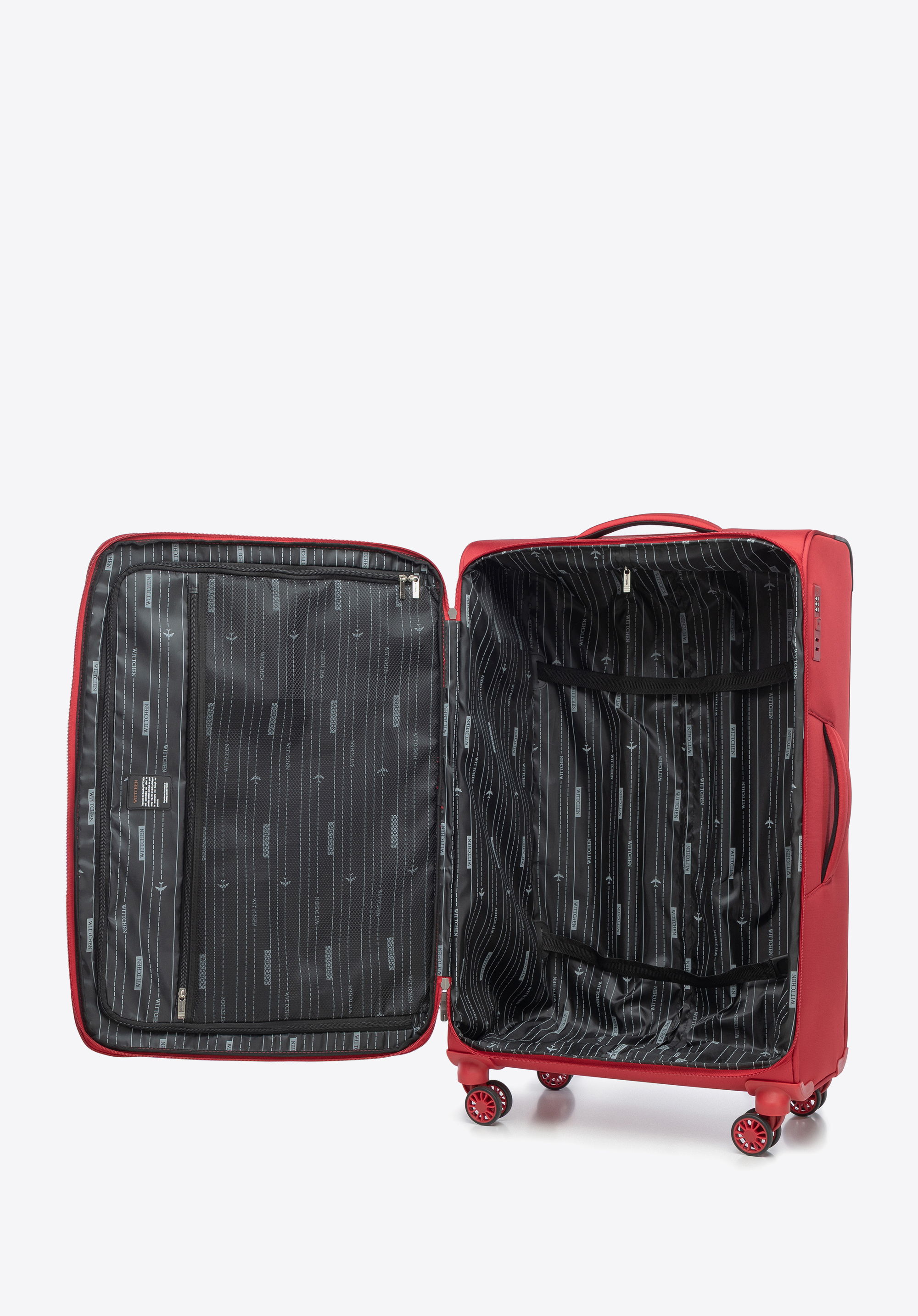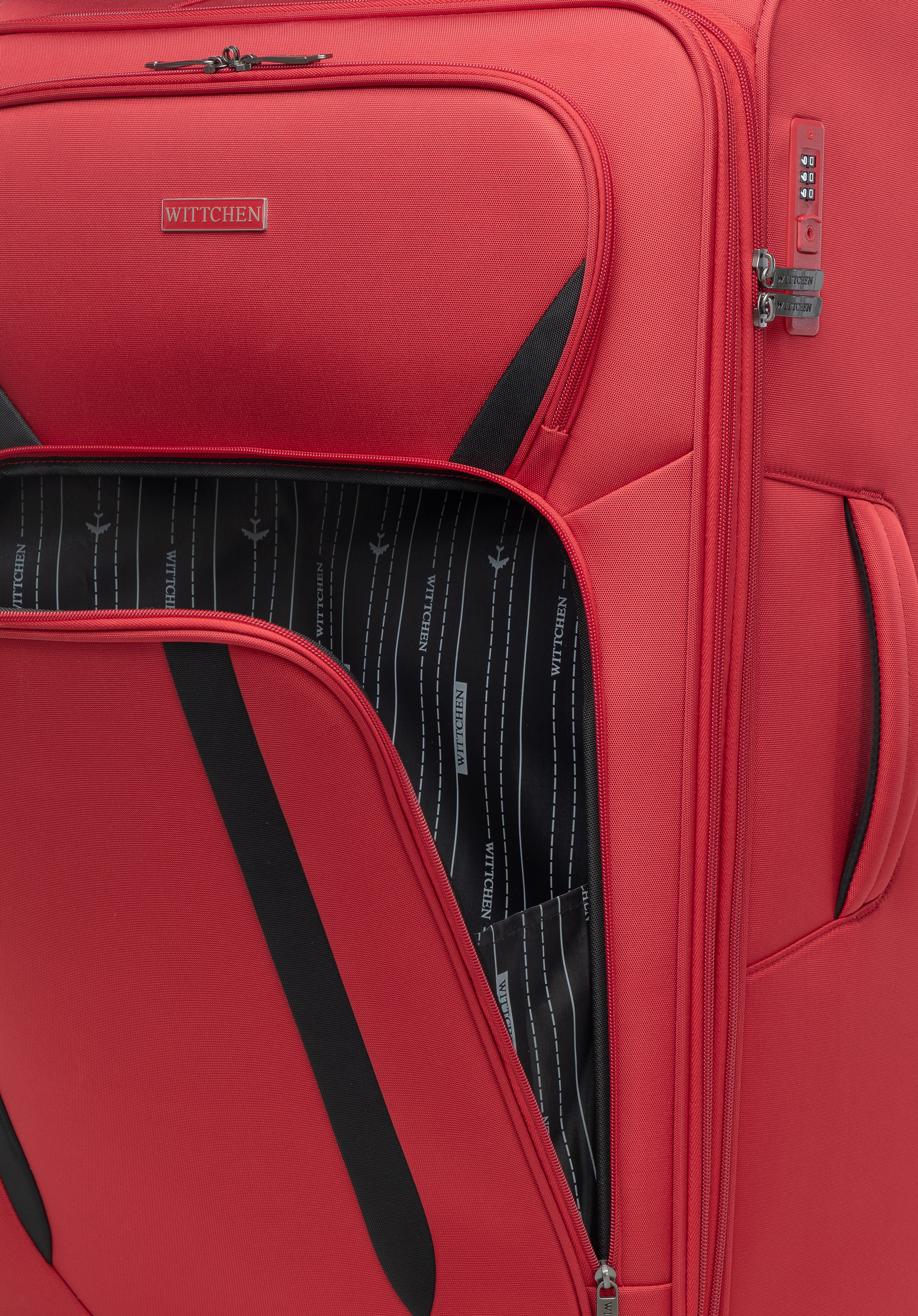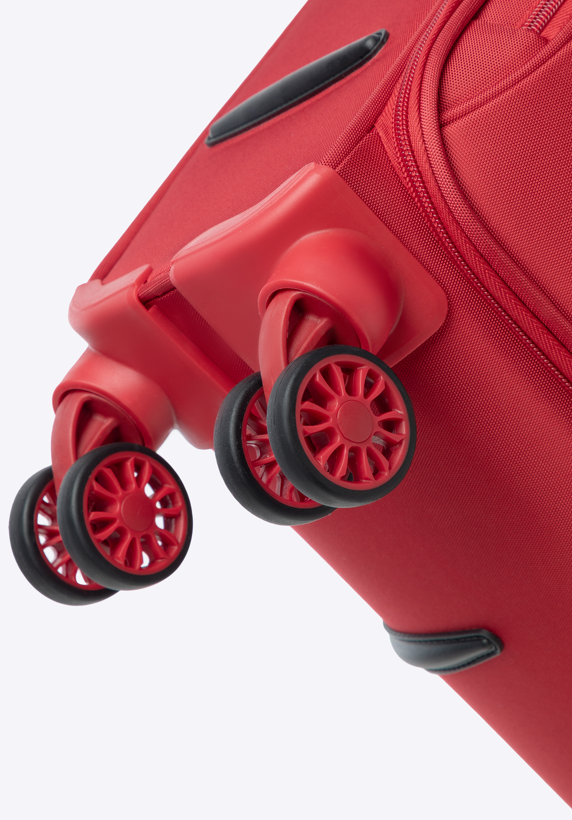 - Materiał: Wytrzymały poliester o gęstym splocie, odporny na przetarcia i łatwy w czyszczeniu, zapewniający lekkość i trwałość walizki.