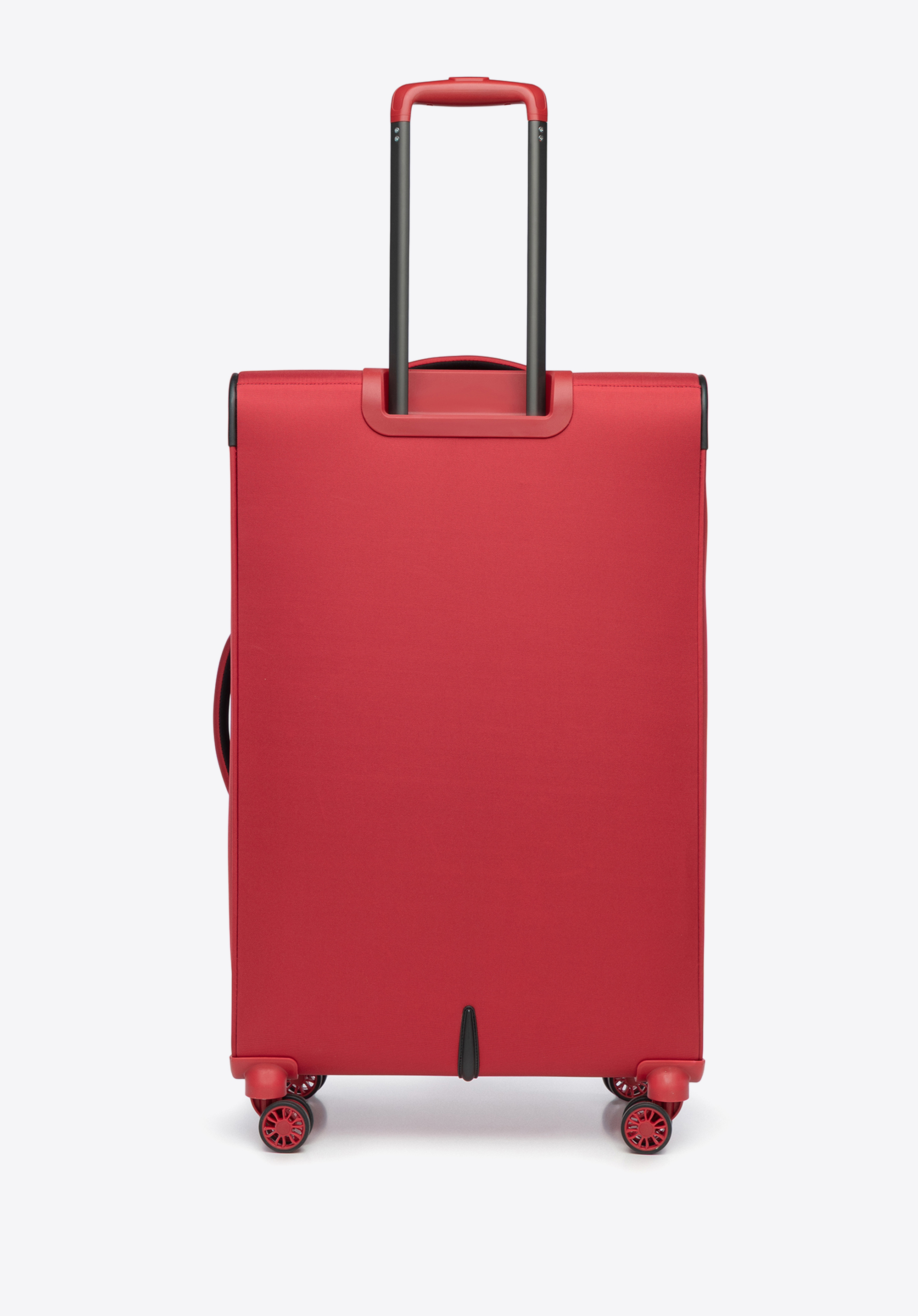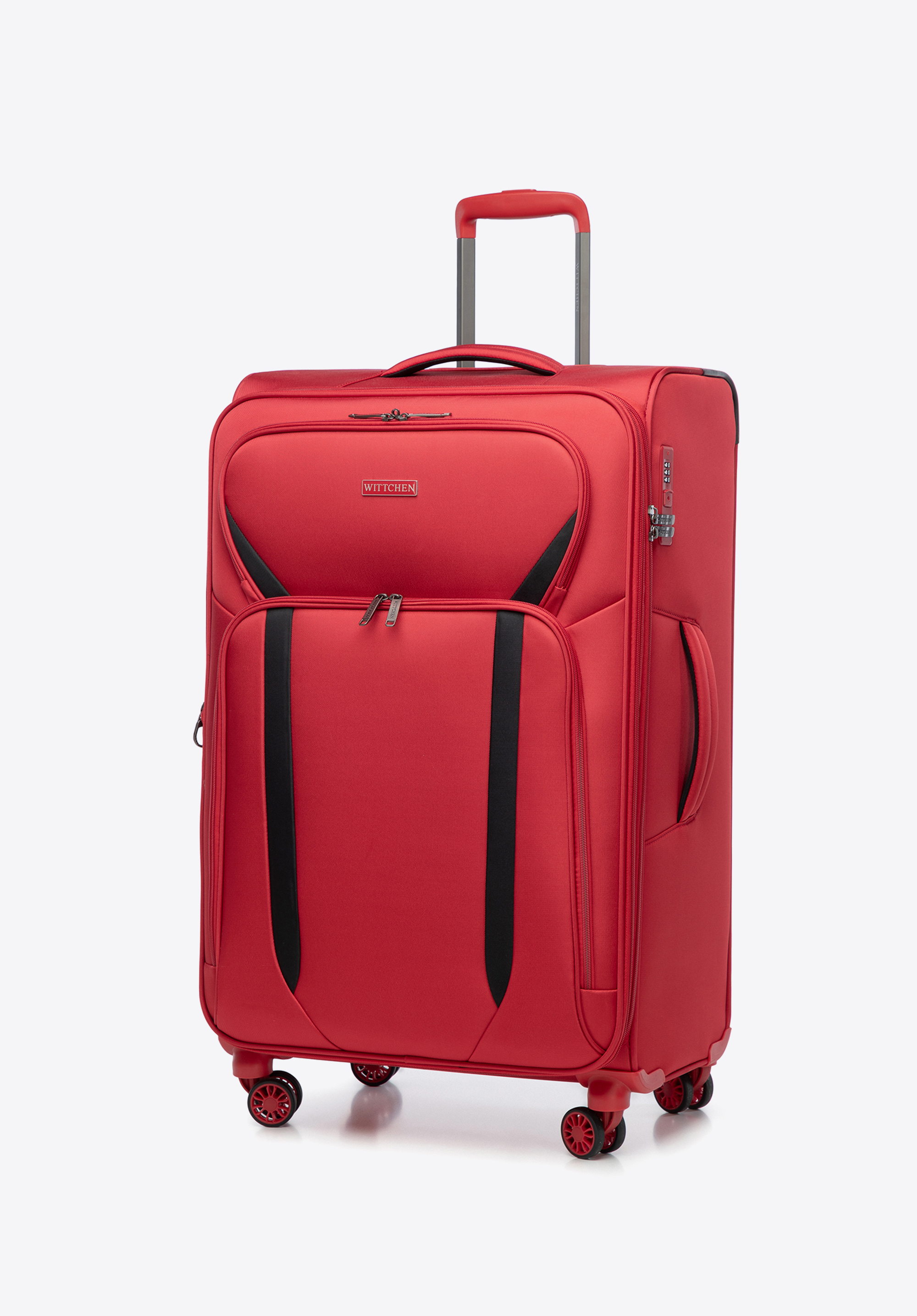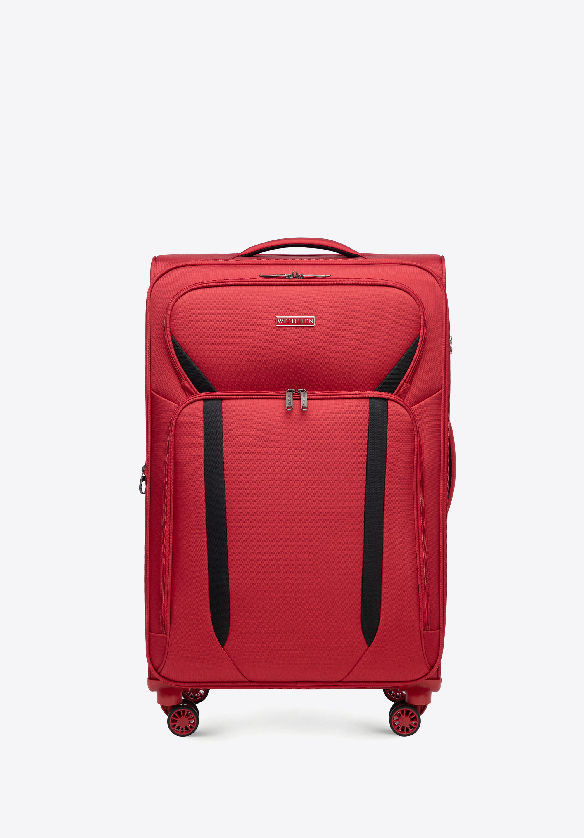- Materiał: Wytrzymały poliester o gęstym splocie, odporny na przetarcia i łatwy w czyszczeniu, zapewniający lekkość i trwałość walizki.
