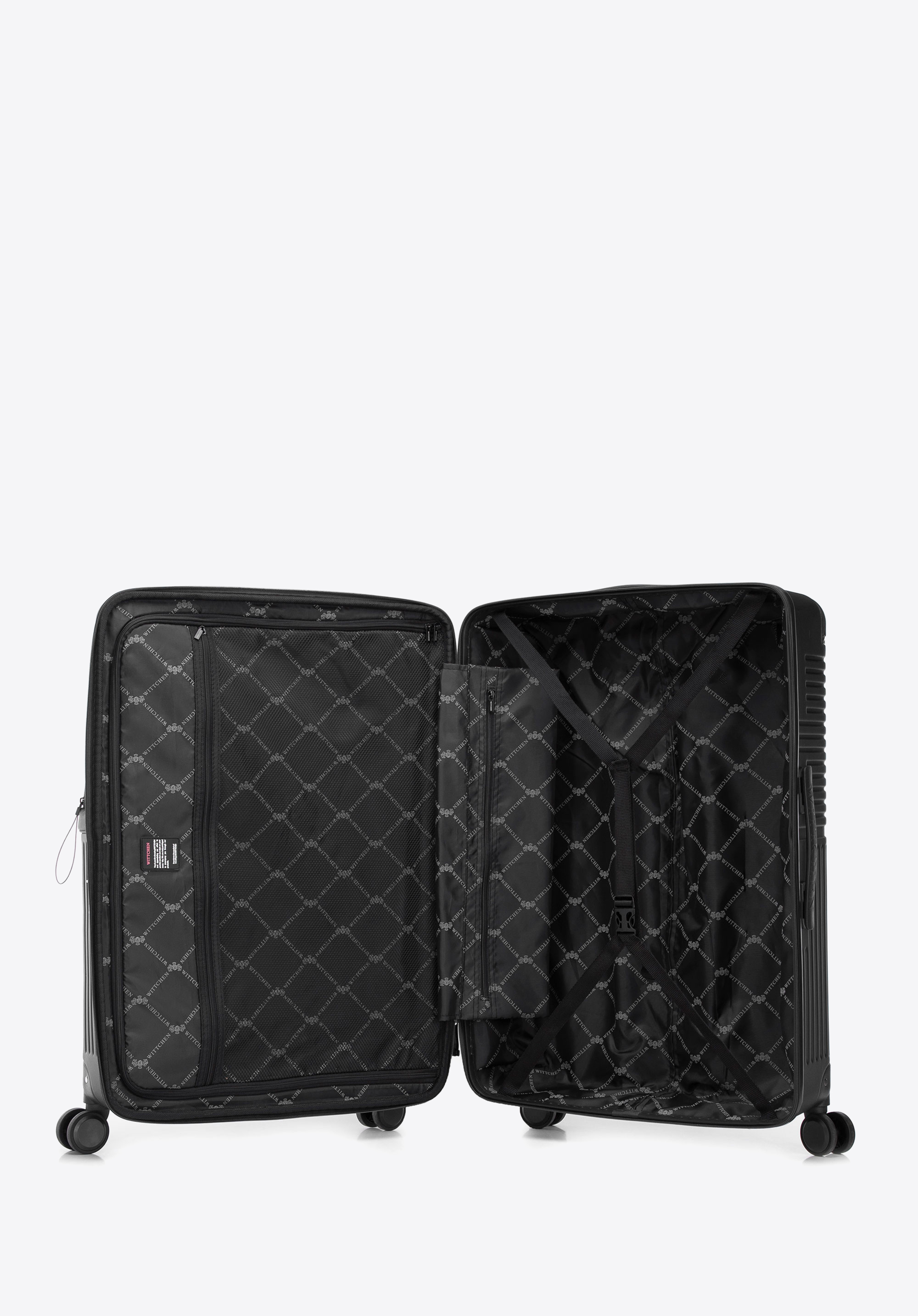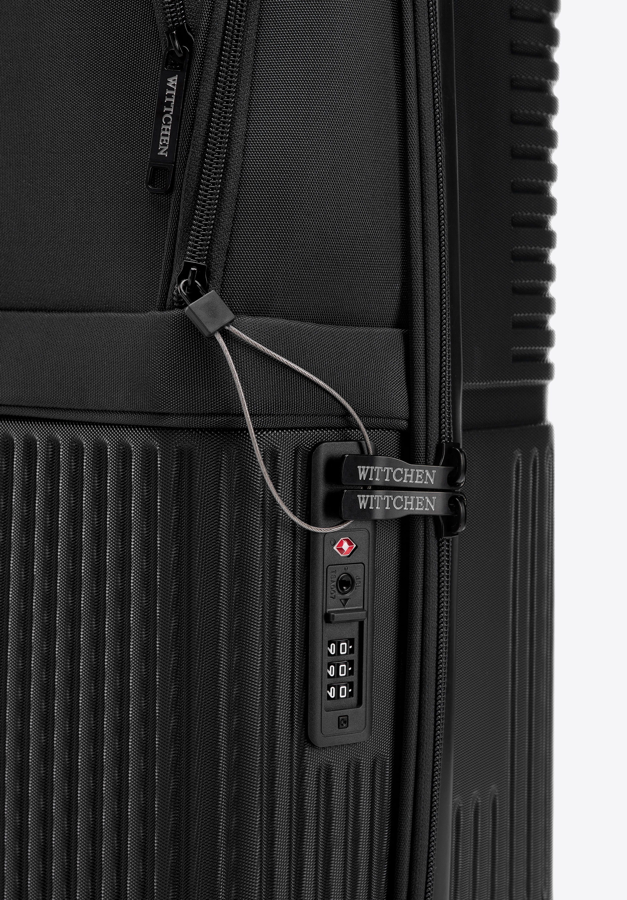 - Zamknięcie: Walizka wyposażona jest w zamek szyfrowy TSA, który skutecznie zabezpiecza bagaż przed niepożądanym otwarciem.