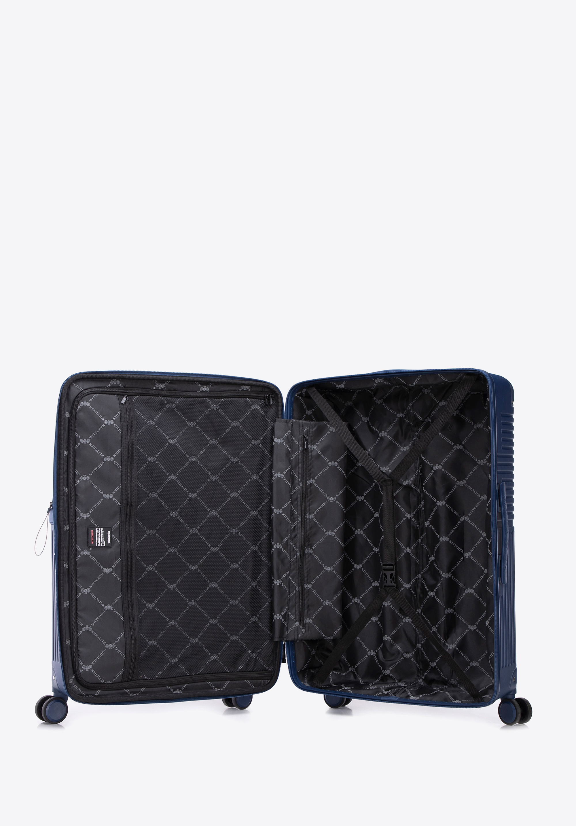 - Zamknięcie: Walizka wyposażona jest w zamek szyfrowy TSA, który skutecznie zabezpiecza bagaż przed niepożądanym otwarciem.